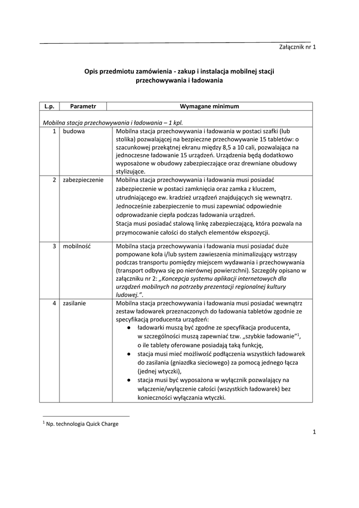 Załącznik nr 1 Opis przedmiotu zamówienia - zakup i instalacja mobilnej stacji przechowywania i ładowania L.p. Parametr Wymagane minimum Mobilna stacja przechowywania i ładowania – 1 kpl. 1 budowa Mobilna stacja przechowywania i ładowania w postaci szafki (lub stolika) pozwalającej na bezpieczne przechowywanie 15 tabletów: o szacunkowej przekątnej ekranu między 8,5 a 10 cali, pozwalająca na jednoczesne ładowanie 15 urządzeń. Urządzenia będą dodatkowo wyposażone w obudowy zabezpieczające oraz drewniane obudowy stylizujące. 2 zabezpieczenie Mobilna stacja przechowywania i ładowania musi posiadać zabezpieczenie w postaci zamknięcia oraz zamka z kluczem, utrudniającego ew. kradzież urządzeń znajdujących się wewnątrz. Jednocześnie zabezpieczenie to musi zapewniać odpowiednie odprowadzanie ciepła podczas ładowania urządzeń. Stacja musi posiadać stalową linkę zabezpieczającą, która pozwala na przymocowanie całości do stałych elementów ekspozycji. 1 3 mobilność 4 zasilanie Mobilna stacja przechowywania i ładowania musi posiadać duże pompowane koła i/lub system zawieszenia minimalizujący wstrząsy podczas transportu pomiędzy miejscem wydawania i przechowywania (transport odbywa się po nierównej powierzchni). Szczegóły opisano w załączniku nr 2: „Koncepcja systemu aplikacji internetowych dla urządzeń mobilnych na potrzeby prezentacji regionalnej kultury ludowej.”. Mobilna stacja przechowywania i ładowania musi posiadać wewnątrz zestaw ładowarek przeznaczonych do ładowania tabletów zgodnie ze specyfikacją producenta urządzeń: ● ładowarki muszą być zgodne ze specyfikacja producenta, w szczególności muszą zapewniać tzw. „szybkie ładowanie”1, o ile tablety oferowane posiadają taką funkcję, ● stacja musi mieć możliwość podłączenia wszystkich ładowarek do zasilania (gniazdka sieciowego) za pomocą jednego łącza (jednej wtyczki), ● stacja musi być wyposażona w wyłącznik pozwalający na włączenie/wyłączenie całości (wszystkich ładowarek) bez konieczności wyłączania wtyczki. Np. technologia Quick Charge 1 5 wymiary zewnętrzne Załącznik nr 1 Mobilna stacja przechowywania i ładowania będzie transportowana między budynkiem administracyjno-wystawienniczym, a miejscem wydawania, znajdującym się przy kasie w Punkcie Informacji Turystycznej. W związku z tym Zamawiający wymaga zapewnienia wymiarów zewnętrznych oraz konstrukcji urządzenia w sposób umożliwiający jego transport z uwzględnieniem fizycznych ograniczeń. Plan sytuacyjny oraz szacunkowe wymiary zostały opisane w dokumencie towarzyszącym „Koncepcja systemu aplikacji internetowych dla urządzeń mobilnych na potrzeby prezentacji regionalnej kultury ludowej.”, znajdującym się w załączniku nr 2. 2