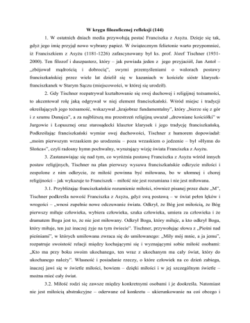 W kręgu filozoficznej refleksji (144) 1. W ostatnich dniach media przywołują postać Franciszka z Asyżu. Dzieje się tak, gdyż jego imię przyjął nowo wybrany papież. W świątecznym felietonie warto przypomnieć, iż Franciszkiem z Asyżu (1181-1226) zafascynowany był ks. prof. Józef Tischner (19312000). Ten filozof i duszpasterz, który – jak powiada jeden z jego przyjaciół, Jan Antoł – „zbójował mądrością i dobrocią”, swymi przemyśleniami o walorach postawy franciszkańskiej przez wiele lat dzielił się w kazaniach w kościele sióstr klarysekfranciszkanek w Starym Sączu (miejscowości, w której się urodził). 2. Gdy Tischner rozpatrywał kształtowanie się swej duchowej i religijnej tożsamości, to akcentował rolę jaką odgrywał w niej element franciszkański. Wśród miejsc i tradycji określających jego tożsamość, wskazywał „krajobraz fundamentalny”, który „bierze się z gór i z szumu Dunajca”, a za najbliższą mu przestrzeń religijną uważał „drewniane kościółki” w Jurgowie i Łopusznej oraz starosądecki klasztor klarysek i jego tradycję franciszkańską. Podkreślając franciszkański wymiar swej duchowości, Tischner z humorem dopowiadał: „moim pierwszym wrzaskiem po urodzeniu – poza wrzaskiem o jedzenie – był »Hymn do Słońca«”, czyli radosny hymn pochwalny, wyrażający wizję świata Franciszka z Asyżu. 3. Zastanawiając się nad tym, co wyróżnia postawę Franciszka z Asyżu wśród innych postaw religijnych, Tischner na plan pierwszy wysuwa franciszkańskie odkrycie miłości i zespolone z nim odkrycie, że miłość powinna być miłowana, bo w ułomnej i chorej religijności – jak wykazuje to Franciszek – miłość nie jest rozumiana i nie jest miłowana. 3.1. Przybliżając franciszkańskie rozumienie miłości, również pisanej przez duże „M”, Tischner podkreśla nowość Franciszka z Asyżu, gdyż swą postawą – w świat pełen lęków i wrogości – „wnosi zupełnie nowe odczuwanie świata. Odkrył, że Bóg jest miłością, że Bóg pierwszy miłuje człowieka, wybiera człowieka, szuka człowieka, umiera za człowieka i że dramatem Boga jest to, że nie jest miłowany. Odkrył Boga, który miłuje, a kto odkrył Boga, który miłuje, ten już inaczej żyje na tym świecie”. Tischner, przywołując słowa z „Pieśni nad pieśniami”, w których umiłowana zwraca się do umiłowanego: „Miły mój mnie, a ja jemu”, rozpatruje swoistość relacji między kochającymi się i wyznającymi sobie miłość osobami: „Kto ma przy boku swoim ukochanego, ten wraz z ukochanym ma cały świat, który do ukochanego należy”. Własność i posiadanie rzeczy, o które człowiek na co dzień zabiega, inaczej jawi się w świetle miłości, bowiem – dzięki miłości i w jej szczególnym świetle – można mieć cały świat. 3.2. Miłość rodzi się zawsze między konkretnymi osobami i je dookreśla. Natomiast nie jest miłością abstrakcyjne – oderwane od konkretu – ukierunkowanie na coś obcego i nieokreślonego, o czym tylko mgliście się stwierdza, iż jest „jakoś inne”, ale nic więcej o nim nie wiadomo. Analizując miłość jako relację międzyosobową, Tischner akcentuje konkretność drugiej osoby: „Miłość jest zawsze miłością do konkretnego, ludzkiego »ty«. Dopiero miłość odkrywa indywidualność człowieka. Nie ma miłości do ludzkości w ogóle, nie ma miłości do tego, co uniwersalne. O ludzkości można myśleć, ale kochać można tylko konkretnego człowieka, którego wydobywa się z jego anonimowości, wydobywa się z tłumu, zauważa się go jako kogoś, kto jest inny”. W miłości to, co jest inne w kochanej osobie zostaje otoczone troską. Tischner przypomina, iż urzeczywistnianie miłości stawia wysokie wymagania: „Właściwością miłości jest jej zwrotność, czyli refleksyjność. We wnętrzu konkretnej, tu i teraz przeżywanej miłości żyje miłość do miłości. Miłość chce być coraz bardziej i bardziej miłością. Miłość wciąż polepsza samą siebie”. Tu ujawnia się dynamika miłości, za którą człowiek powinien nadążać, przekraczając samego siebie i własne ograniczenia. 3.3. Zdaniem Tischnera w odpowiednim rozumieniu i praktykowaniu miłości znajdują się źródła franciszkańskiego pojmowania ubóstwa, które „nie polega na tym, żeby nic nie mieć. Wręcz przeciwnie. Ubóstwo franciszkańskie polega na głębokim przeświadczeniu, że człowiek wszystko ma, że wszystko jest człowieka. I dzień, i noc, i drzewo, i łąki, i pola, bo kto ma Boga, ten ma wszystko”. To także Tischnerowska interpretacja »Hymnu do Słońca«. 4. Przeciwstawiając się złej interpretacji ubóstwa, która kusi iluzją wspólnych dóbr, będących „niczyją własnością”, Tischner odrzuca tezę, iż własność jest kradzieżą: „Wcale nie jest tak, że wszelka własność jest kradzieżą. Człowiek jest przede wszystkim własnością samego siebie”. Własność i wolność ściśle wiążą się z sobą, bowiem „wolność polega na tym, aby człowiek brał w posiadanie samego siebie”. Jeśli człowiek nie posiada sam siebie, jeśli nie może być sobą u siebie, być sobą na swoim, to popada w „lęk przed wolnością i lęk przed samym sobą”, staje się on istotą zagrożoną: „Kto nie posiada siebie, ten wcześniej czy później stanie się własnością jakiegoś fatalizmu”. Dlatego Tischner przestrzega przed destrukcyjnymi konsekwencjami ideologii głoszących, iż „nie tylko nie mam prawa mieć, ale mam nawet obowiązek powierzyć się innym, żeby oni mnie mieli – tym, którzy wiedzą dobrze, na czym ma polegać moja istota”. To wyzbycie się z własności samego siebie i pozbawianie się władzy nad sobą – oddanie się tym, którzy mają mnie uformować wedle zasad jakiejś ideologii – prowadzi do zniewolenia i unicestwienia osobowej tożsamości. 5. Postaw