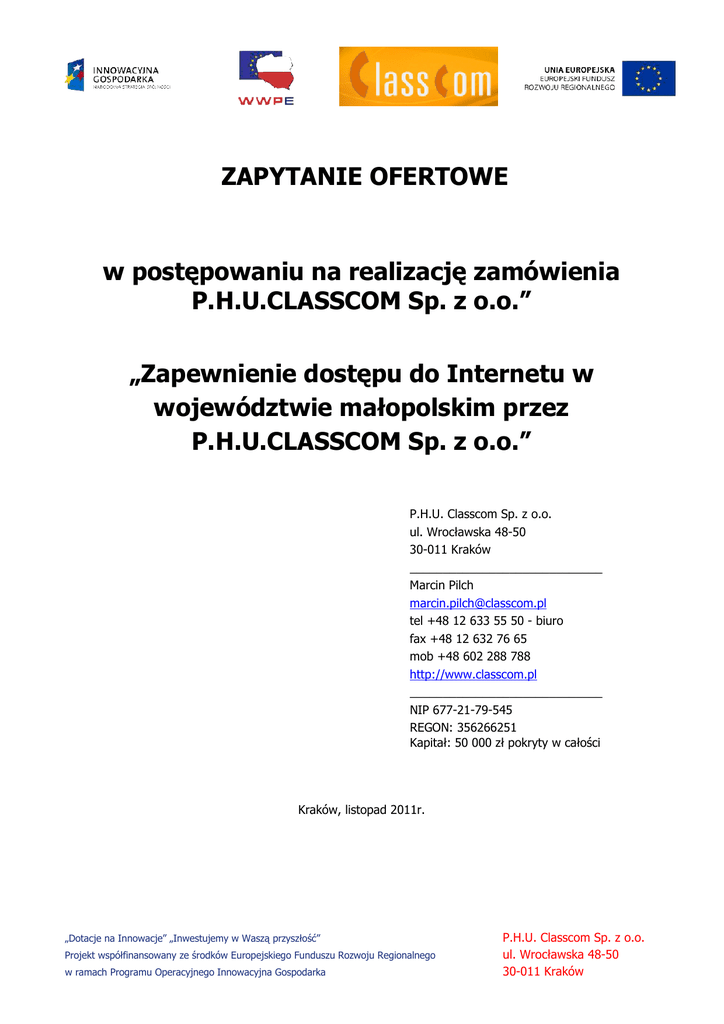 ZAPYTANIE OFERTOWE w postępowaniu na realizację zamówienia P.H.U.CLASSCOM Sp. z o.o.” „Zapewnienie dostępu do Internetu w województwie małopolskim przez P.H.U.CLASSCOM Sp. z o.o.” P.H.U. Classcom Sp. z o.o. ul. Wrocławska 48-50 30-011 Kraków _____________________________ Marcin Pilch [email protected] tel +48 12 633 55 50 - biuro fax +48 12 632 76 65 mob +48 602 288 788 http://www.classcom.pl _____________________________ NIP 677-21-79-545 REGON: 356266251 Kapitał: 50 000 zł pokryty w całości Kraków, listopad 2011r. „Dotacje na Innowacje” „Inwestujemy w Waszą przyszłość” Projekt współfinansowany ze środków Europejskiego Funduszu Rozwoju Regionalnego w ramach Programu Operacyjnego Innowacyjna Gospodarka P.H.U. Classcom Sp. z o.o. ul. Wrocławska 48-50 30-011 Kraków I. Zamawiający P.H.U. Classcom Sp. z o.o. ul. Wrocławska 48-50 30-011 Kraków II. Tryb udzielenia zamówienia 1 Postępowanie prowadzone jest z zachowaniem zasady równego traktowania, uczciwej konkurencji i przejrzystości. 2 Do zapytania mają zastosowanie przepisy Kodeksu Cywilnego (Dz.U. 1964r Nr 16 poz. 93 z późniejszymi zmianami). 3 Dokumentację SIWZ można uzyskać w formie elektronicznej, po uprzednim zgłoszeniu zapotrzebowania na adres [email protected] III. Informacje ogólne Zamówienie jest realizowane w ramach projektu: „Zapewnienie dostępu do Internetu w województwie małopolskim przez firmę "CLASSCOM” w ramach działania 8.4. „Zapewnienie dostępu do Internetu na etapie „ostatniej mili” osi priorytetowej 8. „Społeczeństwo informacyjne – zwiększenie innowacyjności gospodarki” Programu Operacyjnego Innowacyjna Gospodarka 2007-2013. Opis projektu znajduje się w załączniku nr 1 do niniejszego zapytania. IV. Opis przedmiotu zamówienia Przedmiotem zamówienia jest wykonanie kompleksowych prac projektowych i budowlano-montażowych dla sieci szerokopasmowej (uzyskanie wszelkich zgód, opracowanie dokumentacji projektowej, budowa) składającej się z części światłowodowej: węzła internetowego, infrastruktury FTTH (napowietrznej, ziemnej, budynkowej), szkieletu oraz baz dostępowych. Sieć szerokopasmowa funkcjonować będzie w województwie małopolskim na obszarze miejscowości powiecie wielickim, sklasyfikowanych jako „białe plamy” na mapie informatycznej: Powiat Gmina wielicki Wieliczka Miejscowość Chorągwica, Raciborsko Węzeł internetowy wraz z całą infrastrukturą światłowodową zlokalizowany zostanie w miejscowości Krynica, natomiast część abonencka sieci na obszarze pozostałych miejscowości oraz w mieście Kraków. Zamawiający wytypował już obszary dogodne pod względem technicznym dla zlokalizowania radiolinii sieci szkieletowej, jak również węzła internetowego dla części światłowodowej sieci. Poglądowy schemat sieci umieszczono w załączniku nr 3 do niniejszego zapytania. „Dotacje na Innowacje” „Inwestujemy w Waszą przyszłość” Projekt współfinansowany ze środków Europejskiego Funduszu Rozwoju Regionalnego w ramach Programu Operacyjnego Innowacyjna Gospodarka P.H.U. Classcom Sp. z o.o. ul. Wrocławska 48-50 30-011 Kraków Prace objęte niniejszym postępowaniem obejmują I. W zakresie projektowania i budowy sieci światłowodowej: 1. Przeprowadzenie niezbędnych wizji technicznych – (inwentaryzacja do celów projektowych). 2. Opracowanie koncepcji przebiegu sieci światłowodowej FTTH na obszarze inwestycji. 3. Przygotowanie dokumentów formalnych: a. przygotowanie dokumentacji technicznej niezbędnej do realizacji projektu, b. uzyskania odpowiednich zezwoleń, zgód (w ofercie należy napisać jakie wg Wykonawcy pozwolenia/zgłoszenia są wymagane prawem dla określonego w zamówieniu zakresu prac), a w tym: i. zakup map i wypisów, ii. uzyskanie zgód właścicieli działek , iii. wykonanie pełnej dokumentacji projektowej, iv. rejestracja inwestycji w odpowiednich organach urzędowych. 4. Zakup i montaż infrastruktury technicznej FTTH w tym: a. zakup: i. infrastruktury napowietrznej magistrali światłowodowej wraz ze słupami i szafami dystrybucyjnymi, ii. infrastruktury ziemnej magistrali światłowodowej z punktami dystrybucji, iii. infrastruktury wewnątrzbudynkowej na obiektach wielomieszkaniowych, iv. pasywnej infrastruktury przyłączeniowej FTTH i FTTB, v. stacji czołowej OLT, vi. wyposażenia serwerowni i Biura Obsługi Klienta (szafy serwerowe, siłownia z UPS i agregatem, router ATM, switche zarządzalne 1GB 24 porty, serwery, system klimatyzacji, komputery z oprogramowaniem dla administratora sieci, ksero, drukarka,, vii. urządzeń terminalowych ONT dla abonentów. b. montaż: i. serwerowni i koncentratora sieci FTTH, ii. wyposażenia Biura Obsługi Klienta, iii. budowa magistrali światłowodowych i infrastruktury wewnątrzbudynkowej, iv. konfiguracja systemu zarządzania siecią, v. wykonanie przyłączy abonenckich. „Dotacje na Innowacje” „Inwestujemy w Waszą przyszłość” Projekt współfinansowany ze środków Europejskiego Funduszu Rozwoju Regionalnego w ramach Programu Operacyjnego Innowacyjna Gospodarka P.H.U. Classcom Sp. z o.o. ul. Wrocławska 48-50 30-011 Kraków Wykonawca przygotuje niezbędną dokumentację projektową i powykonawczą w minimum 2 egzemplarzach w tym w wersji elektronicznej (w formatach edytowalnych Microsoft Office, AutoCad, Corel itp.) Zakres prac projektowo-budowlanych oraz zestawienie niezbędnych materiałów przedstawiono w załączniku nr 1. Wykonawca w ramach oferty wariantowej może przedstawić własną koncepcję sieci wraz z proponowanymi przez siebie rozwiązaniami technicznymi. Wykonawca wykona przedmiot zamówienia w systemie Zaprojektuj-Wybuduj w nieprzekraczalnym terminie: - opracowanie dokumentacji projektowej (wraz z aktualizacją na wniosek Inwestora), zakup infrastruktury sieciowej oraz budowa sieci - w nieprzekraczalnym terminie do dnia 31.12.2012r., - montaż światłowodowych urządzeń abonenckich. „Dotacje