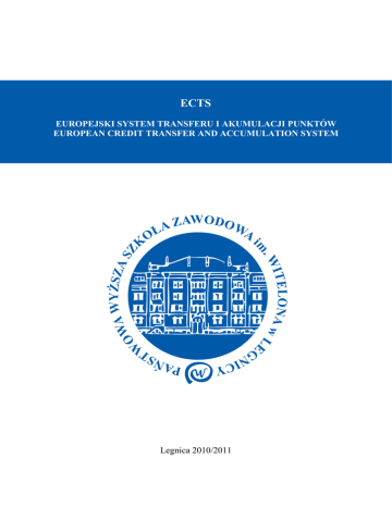 ECTS EUROPEJSKI SYSTEM TRANSFERU I AKUMULACJI PUNKTÓW EUROPEAN CREDIT TRANSFER AND ACCUMULATION SYSTEM Legnica 2010/2011 PWSZ im. Witelona w Legnicy - Wstęp INFORMACJE OGÓLNE ECTS - informacje ogólne* Europejski System Transferu i Akumulacji Punktów (European Credit Transfer and Accumulation System, ECTS, znany również w Polsce pod swą skrótową nazwą) został po raz pierwszy wprowadzony jako przedsięwzięcie pilotażowe w 1989 r. w ramach programu Erasmus. Wówczas jego celem było ułatwienie uznawania okresów studiów odbywanych przez studentów za granicą poprzez transfer punktów. Jako system transferu punktów ECTS objął swym zasięgiem ponad 30 krajów i funkcjonuje już w ponad tysiącu uczelni. ECTS został uznany za jeden z fundamentów Europejskiego Obszaru Szkolnictwa Wyższego przez 40 krajów-sygnatariuszy Procesu Bolońskiego. Wiele krajów uchwaliło przepisy zobowiązujące uczelnie do wprowadzenia ECTS jako systemu akumulacji punktów, a inne kraje podążają obecnie w tym samym kierunku. W niektórych krajach stosowanie ECTS jest warunkiem uzyskania akredytacji. Podczas konferencji nt. transferu i akumulacji punktów, którą zorganizowało w Zurychu w październiku 2002 r. Europejskie Stowarzyszenie Uniwersyteckie (European University Association), potwierdzono, że ECTS odgrywa kluczową rolę w szkolnictwie wyższym. ECTS zajmie również istotne miejsce w koncepcji krajowej i Europejskiej Ramowej Struktury Kwalifkacji. Równocześnie systemy oparte na ECTS wprowadza się na innych kontynentach. Prawidłowe stosowanie ECTS zależy od zaangażowania tysięcy osób pracujących z odpowiednią motywacją w uczelniach, które działają w bardzo odmiennych warunkach i kulturach. ECTS pozwala przedstawiać programy studiów w sposób czytelny i ułatwiający porównania. ECTS można stosować w ramach wszystkich rodzajów studiów niezależnie od trybu, w jakim są prowadzone, oraz dla celów kształcenia przez całe życie. Służy on zarówno studentom odbywającym część studiów za granicą, jak i studentom odbywającym całość studiów w swej uczelni macierzystej, ponieważ może być stosowany dla celów akumulacji punktów w obrębie jednej uczelni oraz w celu przenoszenia punktów z jednej uczelni do drugiej. ECTS ułatwia studentom mobilność między krajami, w obrębie krajów, miast regionów, jak również przechodzenie z jednego rodzaju uczelni do uczelni innego rodzaju; obejmuje on również samodzielną naukę i doświadczenie zawodowe. Z tych względów dobrze już obecnie znany akronim „ECTS” oznacza obecnie „Europejski System Transferu i Akumulacji Punktów”. Drugim ważnym narzędziem zapewniającym przejrzystość, ściśle powiązanym z systemem ECTS, jest Suplement do Dyplomu. _____________________________________________________________________ * na podstawie „EUROPEJSKI SYSTEM TRANSFERU I AKUMULACJI PUNKTÓW I SUPLEMENT DO DYPLOMU- PRZEWODNIK”, opracowany przez Dyrekcję Generalną ds. Edukacji i Kultury Komisji Europejskiej, Bruksela, luty 2005. Katalog przedmiotów ECTS 2010/2011 2 PWSZ im. Witelona w Legnicy - Wstęp INFORMACJE O UCZELNI ADRES Państwowa Wyższa Szkoła Zawodowa im. Witelona w Legnicy ul. Sejmowa 5A 59 – 220 Legnica Polska E-mail: [email protected] Telefon: 0048 76 723 22 82 Fax: 0048 76 723 29 00 Strona WWW: http://www.pwsz.legnica.edu.pl Kod Programu Erasmus: PL LEGNICA01 EUC Number: 101553-IC-1-2007-1-PL-ERASMUS-EUC-1 WŁADZE UCZELNI Rektor prof. dr hab. inż. Ryszard K. Pisarski Prorektor ds. Dydaktyki i Studentów dr Kazimiera Jaworska Prorektor ds. Nauki i Współpracy z Zagranicą dr inż. Edward Puchała Kanclerz mgr Jerzy Stefaniak Wydział Administracji Dziekan – mgr Edward Biegun Prodziekan – dr Janusz Moryl Prodziekan – mgr Rafał Lipniewicz Wydział Humanistyczny Dziekan – mgr Mirosław Karykowski Wydział Medyczny Dziekan – dr n. med. Izabela Gasińska-Drozdowska Prodziekan – dr n. med. Jolanta Bielawska Wydział Pedagogiki, Turystyki i Rekreacji Dziekan – dr Andrzej Wnuk Prodziekan – dr Jan Wojtaś Prodziekan – mgr Leszek Gramza Wydział Politologii Dziekan – prof. dr hab. Stanisław Dąbrowski Prodziekan – dr Wioletta Drzystek Katalog przedmiotów ECTS 2010/2011 3 PWSZ im. Witelona w Legnicy - Wstęp Wydział Zarządzania i Informatyki Dziekan – mgr inż. Renata Supranowicz Prodziekan – dr inż. Renata Gnitecka Prodziekan – mgr inż. Marek Moi KIERUNKI STUDIÓW I. WYDZIAŁ ADMINISTRACJI 1. Kierunek Administracja (studia licencjackie) ze specjalnościami a) administracja gospodarcza i komunalna, b) administracja publiczna, c) administracja porządku i bezpieczeństwa publicznego, d) administrowanie środowiskiem. 2. Kierunek Ochrona środowiska (studia inżynierskie) ze specjalnościami: a) systemy ochrony środowiska, b) ochrona i rehabilitacja obszarów zdegradowanych II. WYDZIAŁ HUMANISTYCZNY 1. Kierunek Filologia (studia licencjackie) ze specjalnościami: a) język angielski z informatyką, b) filologia angielska, c) filologia germańska, d) filologia rosyjska. III. WYDZIAŁ ZARZĄDZANIA I INFORMATYKI 1. Kierunek Informatyka (studia inżynierskie) ze specjalnościami: a) systemy i sieci komputerowe, b) grafika komputerowa, c) systemy multimedialne i internetowe, d) systemy informatyczne w zarządzaniu. 2. Kierunek Zarządzanie (studia licencjackie) ze specjalnościami: a) zarządzanie przedsiębiorstwem, b) zarządzanie małym i średnim przedsiębiorstwem, c) zarządzanie finansami i controlling, d) zarządzanie zasobami ludzkimi. 3. Kierunek Ekonomia (studia licencjackie) ze specjalnościami: a) analiza ekonomiczna, b) rachunkowość i audyt wewnętrzny. 4. Kierunek Zarządzanie i Inżynieria Produkcji (studia inżynierskie) ze specjalnościami: a) sterowanie systemami przemysłowymi, b) logistyka, c) inżynieria bezpieczeństwa pracy. Katalog przedmiotów ECTS 2010/2011 4 PWSZ im. Witelona w Legnicy - Wstęp 5. Kierunek Zarządzanie i Inżynie
