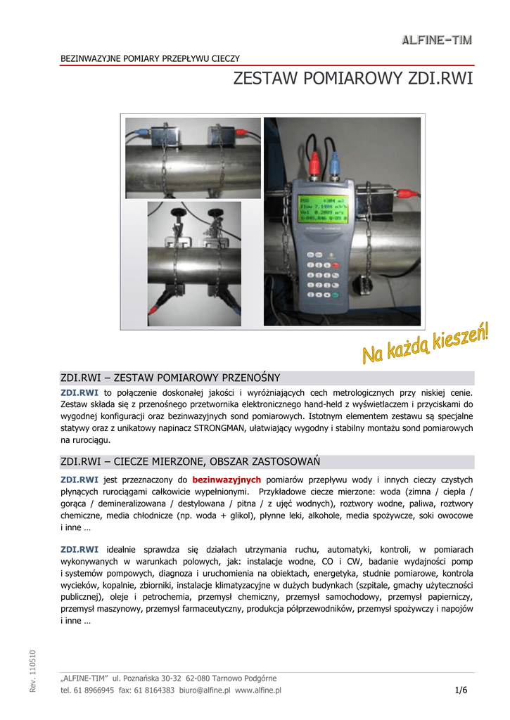 BEZINWAZYJNE POMIARY PRZEPŁYWU CIECZY ZESTAW POMIAROWY ZDI.RWI ZDI.RWI – ZESTAW POMIAROWY PRZENOŚNY ZDI.RWI to połączenie doskonałej jakości i wyróżniających cech metrologicznych przy niskiej cenie. Zestaw składa się z przenośnego przetwornika elektronicznego hand-held z wyświetlaczem i przyciskami do wygodnej konfiguracji oraz bezinwazyjnych sond pomiarowych. Istotnym elementem zestawu są specjalne statywy oraz z unikatowy napinacz STRONGMAN, ułatwiający wygodny i stabilny montażu sond pomiarowych na rurociągu. ZDI.RWI – CIECZE MIERZONE, OBSZAR ZASTOSOWAŃ ZDI.RWI jest przeznaczony do bezinwazyjnych pomiarów przepływu wody i innych cieczy czystych płynących rurociągami całkowicie wypełnionymi. Przykładowe ciecze mierzone: woda (zimna / ciepła / gorąca / demineralizowana / destylowana / pitna / z ujęć wodnych), roztwory wodne, paliwa, roztwory chemiczne, media chłodnicze (np. woda + glikol), płynne leki, alkohole, media spożywcze, soki owocowe i inne … Rev. 110510 ZDI.RWI idealnie sprawdza się działach utrzymania ruchu, automatyki, kontroli, w pomiarach wykonywanych w warunkach polowych, jak: instalacje wodne, CO i CW, badanie wydajności pomp i systemów pompowych, diagnoza i uruchomienia na obiektach, energetyka, studnie pomiarowe, kontrola wycieków, kopalnie, zbiorniki, instalacje klimatyzacyjne w dużych budynkach (szpitale, gmachy użyteczności publicznej), oleje i petrochemia, przemysł chemiczny, przemysł samochodowy, przemysł papierniczy, przemysł maszynowy, przemysł farmaceutyczny, produkcja półprzewodników, przemysł spożywczy i napojów i inne … „ALFINE-TIM” ul. Poznańska 30-32 62-080 Tarnowo Podgórne tel. 61 8966945 fax: 61 8164383 [email protected] www.alfine.pl 1/6 ZDI.RWI – CECHY WYRÓŻNIAJĄCE CENA = znacząco niższa w stosunku do porównywalnych przyrządów dostępnych na rynku. Użytkownik może być „na żywo” przeszkolony na stanowisku pomiarowym „ALFINE-TIM” w zakresie obsługi lub może uczestniczyć w sprawdzeniu przepływomierza. Rozpiętość mierzalnych prędkości przepływu: 0.01 m/s … 15 m/s w obu kierunkach. ! W badaniach testowych mierzono przy prędkości przepływu 2 mm/s Właściwość ta jest przydatna przy detekcji wycieków i nieszczelności. Dokładność pomiaru (w warunkach referencyjnych): typowo (1 … ±2)% dla v > 0.3 m/s lub (±0.006) m/s dla v < 0.3 m/s. Metoda pomiarowa: Transit Time. Przepływomierz jest lekki, poręczny, łatwy w instalacji i obsłudze, posiada interesujące i bogate menu. Do konfiguracji i przeglądania danych służy klawiatura z 18-toma przyciskami. Przepływomierz posiada wbudowane zaawansowane algorytmy autodiagnostyczne jakości pomiarów. Przepływomierz jest wyposażony w wyjście komunikacji cyfrowej RS232. Przepływomierz jest wyposażony w 3 sumatory (w przód – w tył – netto). Przetwornik elektroniczny jest wyposażony wyświetlacz LCD z czterema liniami znaków; przykładowe eksponowane parametry w zależności od konfiguracji: wartość przepływu, stan sumatora (przepływ w przód lub w tył lub netto), prędkość przepływu, jakość sygnału. Bezinwazyjne sondy pomiarowe są instalowane na powierzchni rurociągu: bez zatrzymywania procesu, bez kontaktu z cieczą płynącą, bez względu na ciśnienie w rurociągu, bez przecinania lub nawiercania rurociągu, bez części ruchomych, bez spadku ciśnienia. Mierzone mogą być praktycznie wszelkie standardowe ciecze jak: woda i inne ciecze czyste lub lekko zanieczyszczone (<20 000 ppm lub <2% cząstek mniejszych niż 100 m). Szeroki zakres średnic rurociągów: DN 25 (1”) … DN 700 (28”) lub więcej, w zależności od rodzaju zastosowanych sond pomiarowych. Temperatura cieczy: typowo 0 oC … +70 oC ( = sondy standardowe) lub 0 oC … +120 oC (= sondy wysokotemperaturowe, przeznaczone dla doraźnych / uruchomieniowych / diagnostycznych / krótkookresowych pomiarów kontrolnych). Zalecenia instalacyjne dotyczące odcinków prostych: na napływie 10 x DN (min), na wypływie 5 x DN (min) (DN = średnica rurociągu). Zasilanie z wewnętrznych baterii Ni-MH (praca do 10 h na obiekcie). Rev. 110510 Wymiary i masa przetwornika: 200 x 90 x 30 mm; 514 g z bateriami. „ALFINE-TIM” ul. Poznańska 30-32 62-080 Tarnowo Podgórne tel. 61 8966945 fax: 61 8164383 [email protected] www.alfine.pl 2/6 ZDI.RWI – WYPOSAŻENIE DODATKOWE SONDY POMIAROWE SPS1 Sondy pomiarowe małe (S1 = Small) średnice rurociągów DN 20 … DN 100 / temperatura (0 … 70) oC SPS1H Sondy pomiarowe małe wysokotemperaturowe (H = High Temp.) (przeznaczone dla doraźnych / uruchomieniowych / diagnostycznych / krótkookresowych pomiarów kontrolnych) średnice rurociągów DN 20 … DN 100 / temperatura (0 … 120) oC SPM1 Sondy pomiarowe średnie (M1 = Medium) średnice rurociągów DN 80 … DN 700 / temperatura (0 … 70) oC SPM1H SPL1 Sondy pomiarowe średnie wysokotemperaturowe (H = High Temp.) (przeznaczone dla doraźnych / uruchomieniowych / diagnostycznych / krótkookresowych pomiarów kontrolnych) średnice rurociągów DN 80 … DN 700 / temperatura (0 … 120) oC Sondy pomiarowe duże (L1 = Large) średnice rurociągów DN 500 wzwyż / temperatura (0 … 70) oC STATYWY DO SOND POMIAROWYCH STS Statyw do sond pomiarowych SPS STSH Statyw do sond pomiarowych SPSH STM Statyw do sond pomiarowych SPM STMH Statyw do sond pomiarowych SPMH Rev. 110510 ELEMENTY MOCUJĄCE STRONGMAN Napinacz do mocowania statywu lub sond na rurociągu przy użyciu łańcuszka CHAIN 03 CHAIN 03 Łańcuszki do mocowania statywu lub sond na rurociągu, napinanie przy użyciu STRONGMAN „ALFINE-TIM” ul. Poznańska 30-32 62-080 Tarnowo Podgórne tel. 61 8966945 fax: 61 8164383 [email protected] www.alfine.pl 3/6 ELEMENTY SPRZĘGAJĄCE – ŻELE I TAŚMY Zastosowanie elementów sprzęgających o właściwościach dobranych do aplikacji sprzyja udanym pomiarom. Elementy sprzęgające są dobierane indywidualnie, stosownie do temperatury