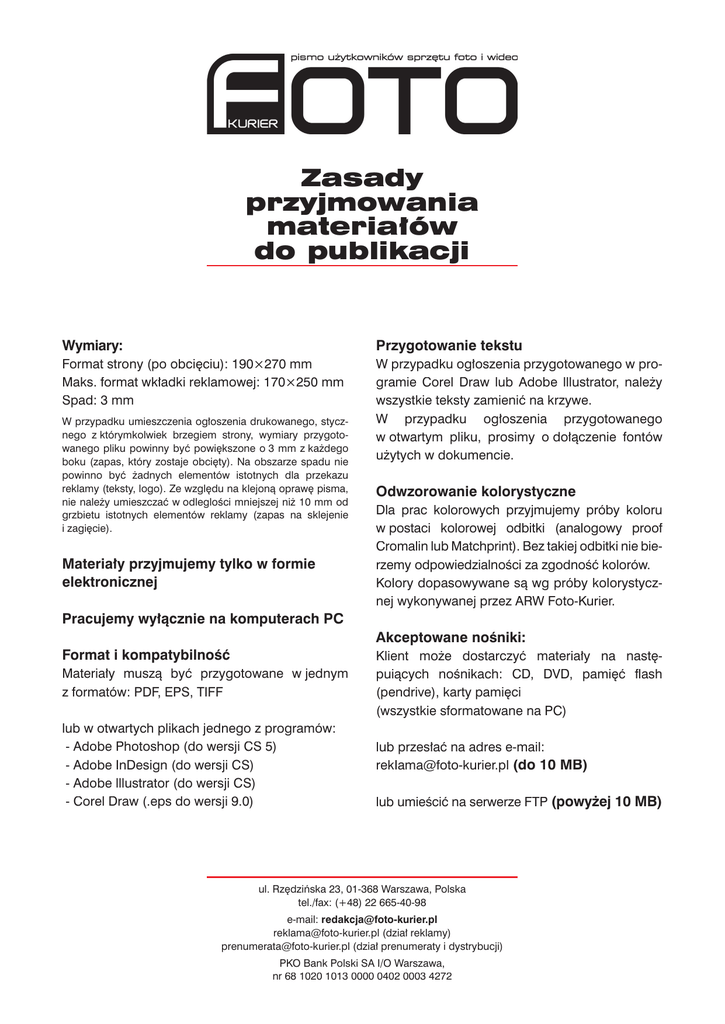 Zasady przyjmowania materiałów do publikacji Wymiary: Przygotowanie tekstu Format strony (po obcięciu): 190×270 mm Maks. format wkładki reklamowej: 170×250 mm Spad: 3 mm W przypadku ogłoszenia przygotowanego w programie Corel Draw lub Adobe lllustrator, należy wszystkie teksty zamienić na krzywe. W przypadku ogłoszenia przygotowanego w otwartym pliku, prosimy o dołączenie fontów użytych w dokumencie. W przypadku umieszczenia ogłoszenia drukowanego, stycznego z którymkolwiek brzegiem strony, wymiary przygotowanego pliku powinny być powiększone o 3 mm z każdego boku (zapas, który zostaje obcięty). Na obszarze spadu nie powinno być żadnych elementów istotnych dla przekazu reklamy (teksty, logo). Ze względu na klejoną oprawę pisma, nie należy umieszczać w odleglości mniejszej niż 10 mm od grzbietu istotnych elementów reklamy (zapas na sklejenie i zagięcie). Materiały przyjmujemy tylko w formie elektronicznej Odwzorowanie kolorystyczne Dla prac kolorowych przyjmujemy próby koloru w postaci kolorowej odbitki (analogowy proof Cromalin lub Matchprint). Bez takiej odbitki nie bierzemy odpowiedzialności za zgodność kolorów. Kolory dopasowywane są wg próby kolorystycznej wykonywanej przez ARW Foto-Kurier. Pracujemy wyłącznie na komputerach PC Akceptowane nośniki: Format i kompatybilność Materiały muszą być przygotowane w jednym z formatów: PDF, EPS, TIFF lub w otwartych plikach jednego z programów: - Adobe Photoshop (do wersji CS 5) - Adobe InDesign (do wersji CS) - Adobe lllustrator (do wersji CS) - Corel Draw (.eps do wersji 9.0) Klient może dostarczyć materiały na następuiących nośnikach: CD, DVD, pamięć flash (pendrive), karty pamięci (wszystkie sformatowane na PC) lub przesłać na adres e-mail: [email protected] (do 10 MB) lub umieścić na serwerze FTP (powyżej 10 MB) ul. Rzędzińska 23, 01-368 Warszawa, Polska tel./fax: (+48) 22 665-40-98 e-mail: [email protected] [email protected] (dział reklamy) [email protected] (dział prenumeraty i dystrybucji) PKO Bank Polski SA I/O Warszawa, nr 68 1020 1013 0000 0402 0003 4272