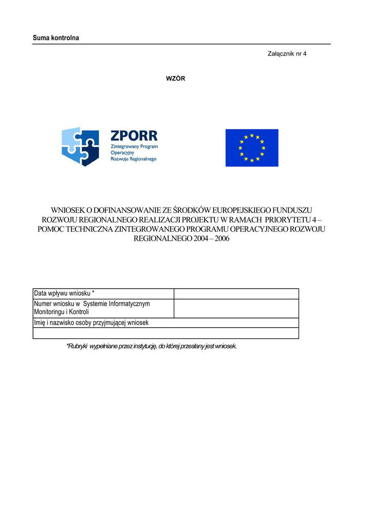 Suma kontrolna Załącznik nr 4 WZÓR WNIOSEK O DOFINANSOWANIE ZE ŚRODKÓW EUROPEJSKIEGO FUNDUSZU ROZWOJU REGIONALNEGO REALIZACJI PROJEKTU W RAMACH PRIORYTETU 4 – POMOC TECHNICZNA ZINTEGROWANEGO PROGRAMU OPERACYJNEGO ROZWOJU REGIONALNEGO 2004 – 2006 Data wpływu wniosku * Numer wniosku w Systemie Informatycznym Monitoringu i Kontroli Imię i nazwisko osoby przyjmującej wniosek *Rubryki wypełniane przez instytucję, do której przesłany jest wniosek. Suma kontrolna 1. Informacje podstawowe 1.1. Nazwa programu operacyjnego 1.2. Nazwa priorytetu programu operacyjnego 1.3. Nazwa działania programu operacyjnego 1.4. Forma realizowanej pomocy 1. Szkolenia 1.1. Seminarium z udziałem ekspertów krajowych lub zagranicznych 1.2. Cykl specjalistycznych szkoleń 1.3. Warsztaty 1.4. Treningi dla trenerów 2. Obsługa Komitetów Monitorujących i Komitetu Sterującego 2.1. Administracyjna obsługa Komitetu 2.2. Zbieranie, gromadzenie i analizowanie danych na potrzeby monitorowania 2.3. Przygotowywanie raportów 3. Wsparcie eksperckie 3.1. Praca ekspertów krajowych i zagranicznych 3.2. Ekspertyzy, analizy 3.3. Studia i koncepcje 4. Zakup sprzętu 4.1. Sprzęt komputerowy, biurowy sprzęt elektroniczny, urządzenia telekomunikacyjne 4.2. Urządzenia teleinformatyczne 4.3. Elementy aktywne sieci 4.4. Oprogramowanie 5. Informacja i promocja 5.1. Stworzenie bieŜącej obsługi i modyfikacji strony internetowej 5.2. Akcje informacyjne i komunikacyjne 5.3. Dofinansowanie dla krajowej sieci punktów informacyjno-konsultacyjnych 6. Potrzeby kadrowe 6.1. Zatrudnienia/oddelegowania pracownika 7. Inne 1.5. Tytuł projektu Suma kontrolna 1.6. Rodzaj projektu 1.7. Kategoria wydatków kwalifikowalnych Wydatki limitowane Wydatki nielimitowane 1.8. Dziedzina interwencji funduszy strukturalnych 1.9. Miejsce realizacji projektu 1. Województwo 2. Powiat 3. Gmina 4. Miejscowość 2. Opis, cel i uzasadnienie projektu 3. Powiązanie projektu z innymi projektami pomocy technicznej współfinansowanymi z funduszy Unii Europejskiej Suma kontrolna 4. Ramy instytucjonalne wdraŜania projektu 4.1 Beneficjent projektu 4.1.1. Nazwa beneficjanta 4.1.2. Kod beneficjenta (nadaje instytucja przyjmująca wniosek) 4.1.3. Status prawny 4.1.4. NIP 4.1.5. REGON 4.1.6. Adres siedziby - województwo - - powiat - - gmina - - miejscowość - -ulica - - nr domu - - nr lokalu - - kod pocztowy Numer telefonu Numer faksu Adres poczty elektronicznej 4.1.7. Osoba uprawniona do podpisania wniosku Imię i nazwisko Stanowisko 4.1.8 Dane kontaktowe Numer telefonu Numer faksu Adres poczty elektronicznej 4.1.9. Osoba wyznaczona do kontaktów roboczych Imię i nazwisko Stanowisko 4.1.10. Dane kontaktowe Numer telefonu Numer faksu Adres poczty elektroniczne] 5. Etapy realizacji projektu 5.1. Ilość i rodzaj kontraktów L.p. Rodzaj kontraktu 5.2. Harmonogram realizacji Planowany termin rozpoczęcia realizacji projektu Planowany termin zakończenia realizacji projektu Liczba Suma kontrolna 6. Wskaźniki produktu Lp. Produkt Wartość w okresie bazowym Wartość w okresie docelowym 7. Realizowanie zasad horyzontalnych UE 7.1 Zgodność projektu z polityką ochrony środowiska Uzasadnienie wyboru 7.2 Zgodność projektu z polityką równych szans Uzasadnienie wyboru 7.3 Zgodność projektu z polityką społeczeństwa informacyjnego Uzasadnienie wyboru 8. Zgodność projektu z prawem zamówień publicznych 8.1. Tryb postępowania w celu wyłonienia wykonawcy Inny: 8.2. Czy rozpoczęło się postępowanie? Tak Nie 8.3. Jeśli tak, czy ogłoszenie o przetargu ukazało się w Dzienniku Urzędowym Tak Unii Europejskiej? Numer Data ogłoszenia Nie 9. Planowane wydatki w ramach projektu Koszty kwalifikowalne Kategoria kosztu 2004 2005 2006 2007 2008 RAZEM 2004 2005 2006 2007 2008 RAZEM RAZEM Koszty niekwalifikowalne Kategoria kosztu RAZEM Całkowity koszt projektu 10. Źródła finansowania projektu (PLN) Źródło finansowania 2004 2005 2006 2007 2008 Razem Publiczne: wkład wspólnotowy (fundusz strukturalny) krajowy wkład publiczny: budŜet państwa krajowy regionalny fundusz publiczny budŜet jednostek samorządu terytorialnego inne krajowe fundusze publiczne Ogółem 11. Promocja projektu 12. Załączniki A. Projekty, których przedmiotem są usługi Tak Nie Zakres zadania (usługi) B. Projekty, których przedmiotem są dostawy Specyfikacja techniczna (dostawy) C. Projekty, których przedmiotem jest zatrudnienie/oddelegowanie pracownika Opis stanowiska 13. Oświadczenie beneficjenta Oświadczam, iŜ informacje zawarte w niniejszym wniosku aplikacyjnym oraz w dołączonych jako załączniki dokumentach są zgodne z prawdą. Jednocześnie oświadczam, iŜ jestem świadom praw i obowiązków związanych z realizacją Projektu finansowego z: W przypadku pozytywnego rozpatrzenia niniejszego wniosku zobowiązuję się do osiągnięcia i utrzymania planowanych efektów Projektu. Podpis i pieczęć Zajmowane stanowisko Imię i nazwisko (drukowanymi literami) Data