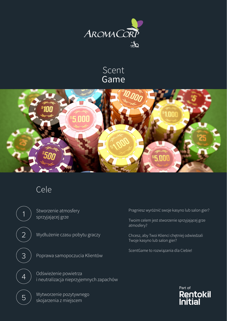 Scent Game Cele 1 Stworzenie atmosfery sprzyjającej grze Pragniesz wyróżnić swoje kasyno lub salon gier? 2 Wydłużenie czasu pobytu graczy Chcesz, aby Twoi Klienci chętniej odwiedzali Twoje kasyno lub salon gier? 3 Poprawa samopoczucia Klientów 4 Odświeżenie powietrza i neutralizacja nieprzyjemnych zapachów 5 Wytworzenie pozytywnego skojarzenia z miejscem Twoim celem jest stworzenie sprzyjającej grze atmosfery? ScentGame to rozwiązania dla Ciebie! Rozwiązania Scent Game AROMACORP oferuje zarówno systemy aromatyzacji przestrzeni, jak i same kompozycje zapachowe dopasowane do zadań stawianych przez Klienta: Odkryj korzyści aromamarketingu! • • • • Zwiększenie deklarowanej chęci powrotu do salonu gier / kasyna Zwiększenie czasu przebywania Klienta w salonie gier / kasynie Wyróżnienie miejsca spośród konkurencji Wzrost obrotów Według badań • Maszyny do gry, wokół których unosi się zapach są częściej wybierane przez graczy • Klienci chętniej wybierają przestrzenie, w których wyczuwają delikatny, świeży zapach • Rozprzestrzenianie odpowiednio dobranej kompozycji zapachowej poprawia samopoczucie graczy Z pasją i pełnym zaangażowaniem zajmujemy się wdrażaniem innowacyjnych rozwiązań Aromamarketingowych. Posiadamy ogromne doświadczenie w budowaniu wizerunku firm. Nasze usługi mają charakter kompleksowy: począwszy od diagnozy potrzeb i doboru właściwych rozwiązań, a skończywszy na samym wdrożeniu. ul. J.P. Woronicza 31/78, 02-640 Warszawa tel./fax (22) 266-0-366, [email protected] www.aromacorp.pl