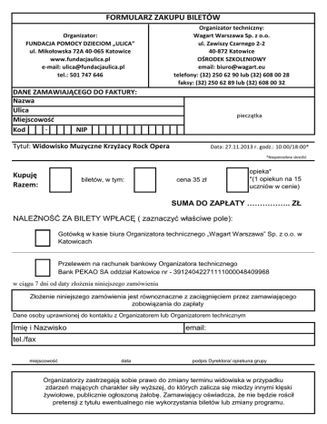 FORMULARZ ZAKUPU BILETÓW Organizator: FUNDACJA POMOCY DZIECIOM „ULICA” ul. Mikołowska 72A 40-065 Katowice www.fundacjaulica.pl e-mail: [email protected] tel.: 501 747 646 Organizator techniczny: Wagart Warszawa Sp. z o.o. ul. Zawiszy Czarnego 2-2 40-872 Katowice OŚRODEK SZKOLENIOWY email: [email protected] telefony: (32) 250 62 90 lub (32) 608 00 28 faksy: (32) 250 62 89 lub (32) 608 00 32 DANE ZAMAWIAJĄCEGO DO FAKTURY: Nazwa Ulica Miejscowość NIP Kod pieczątka Tytuł: Widowisko Muzyczne Krzyżacy Rock Opera Data: 27.11.2013 r. godz.: 10:00/18:00* *Niepotrzebne skreślić Kupuję Razem: biletów, w tym: cena 35 zł opieka* *(1 opiekun na 15 uczniów w cenie) SUMA DO ZAPŁATY …………….. ZŁ NALEŻNOŚĆ ZA BILETY WPŁACĘ ( zaznaczyć właściwe pole): Gotówką w kasie biura Organizatora technicznego „Wagart Warszawa” Sp. z o.o. w Katowicach Przelewem na rachunek bankowy Organizatora technicznego Bank PEKAO SA oddział Katowice nr - 39124042271111000048409968 w ciągu 7 dni od daty złożenia niniejszego zamówienia Złożenie niniejszego zamówienia jest równoznaczne z zaciągnięciem przez zamawiającego zobowiązania do zapłaty Dane osoby uprawnionej do kontaktu z Organizatorem lub Organizatorem technicznym Imię i Nazwisko email: tel./fax miejscowość data podpis Dyrektora/ opiekuna grupy Organizatorzy zastrzegają sobie prawo do zmiany terminu widowiska w przypadku zdarzeń mających charakter siły wyższej, do których zalicza się miedzy innymi klęski żywiołowe, publicznie ogłoszoną żałobę. Zamawiający oświadcza, że nie będzie rościł pretensji z tytułu ewentualnego nie wykorzystania biletów lub zmiany programu.