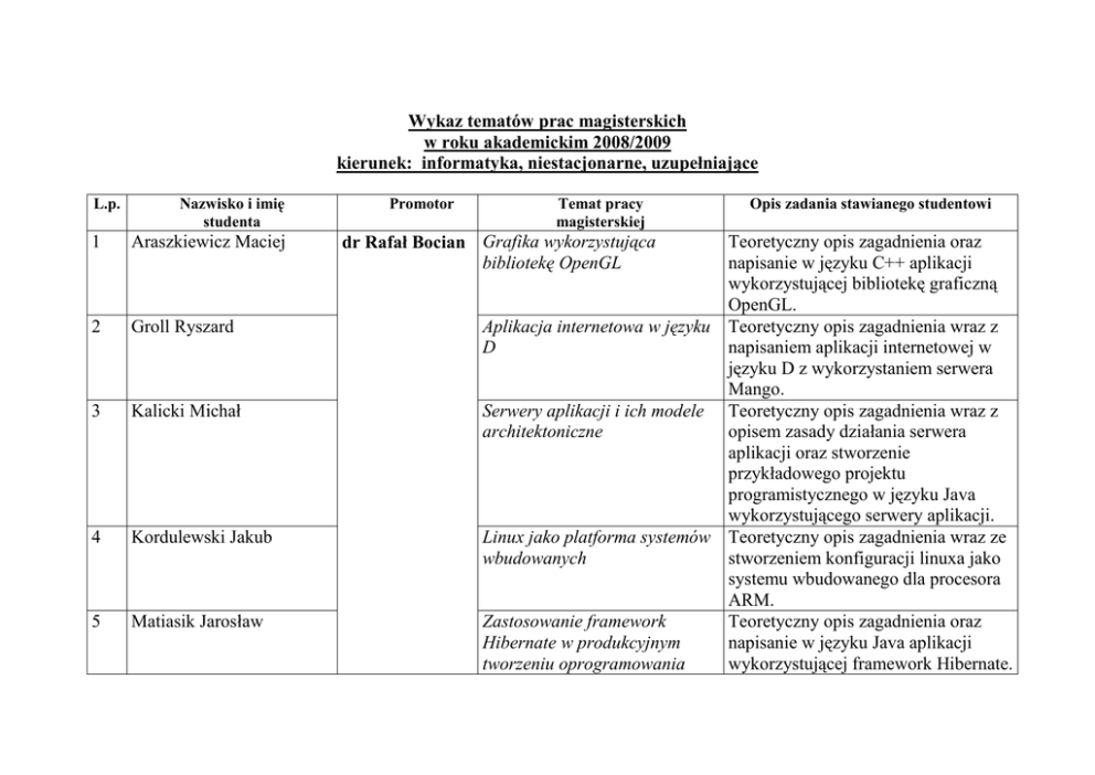 Wykaz tematów prac magisterskich w roku akademickim 2008/2009 kierunek: informatyka, niestacjonarne, uzupełniające L.p. Nazwisko i imię studenta 1 Araszkiewicz Maciej 2 Groll Ryszard 3 Kalicki Michał 4 Kordulewski Jakub 5 Matiasik Jarosław Promotor Temat pracy magisterskiej dr Rafał Bocian Grafika wykorzystująca bibliotekę OpenGL Opis zadania stawianego studentowi Teoretyczny opis zagadnienia oraz napisanie w języku C++ aplikacji wykorzystującej bibliotekę graficzną OpenGL. Aplikacja internetowa w języku Teoretyczny opis zagadnienia wraz z D napisaniem aplikacji internetowej w języku D z wykorzystaniem serwera Mango. Serwery aplikacji i ich modele Teoretyczny opis zagadnienia wraz z architektoniczne opisem zasady działania serwera aplikacji oraz stworzenie przykładowego projektu programistycznego w języku Java wykorzystującego serwery aplikacji. Linux jako platforma systemów Teoretyczny opis zagadnienia wraz ze wbudowanych stworzeniem konfiguracji linuxa jako systemu wbudowanego dla procesora ARM. Zastosowanie framework Teoretyczny opis zagadnienia oraz Hibernate w produkcyjnym napisanie w języku Java aplikacji tworzeniu oprogramowania wykorzystującej framework Hibernate. 6 Mielnikow Konrad 7 Nowakowski Łukasz 8 Rybarczyk Mariusz 9 Rzędarski Piotr 10 Snopkowski Robert 11 Zaborowski Daniel Opis algorytmów rozpoznawania tekstu i obrazu oraz przedstawienie istniejących aplikacji wykorzystujących te algorytmy. Bezstratna kompresja danych Teoretyczny opis zagadnienia na przykładzie algorytmu kompresji bzip2 wraz z jego implementacją w języku C. Programowanie sterowników Teoretyczny opis zagadnienia na przemysłowych oraz symulacja przykładzie oprogramowania Simatik ich pracy z wykorzystaniem firmy Siemens, napisanie programu współczesnych systemów dla sterownika przemysłowego z sterowania wykorzystaniem narzędzia PCS STEP 7 firmy Siemens w językach STL, FBD i LAD. Problematyka autoryzacji Opis LDAP i Active Directory jako użytkowników w systemach systemów autoryzacji, opis konstrukcji heterogenicznych łączącej te dwa typy autoryzacji. Sterownik urządzenia poprzez Teoretyczny opis problemu oraz sieć GSM w oparciu o kontroler napisanie programu dla kontrolera AVR AVR w asemblerze. Wyszukiwarka plików Teoretyczny opis problemu oraz wykorzystująca lokalną bazę napisanie w języku Delphi aplikacji danych i monitoring zmian realizującej wyszukiwanie plików. zachodzących w systemie plików Elektroniczne rozpoznawanie tekstu i obrazu 1 Czajkowski Grzegorz 2 Janik Marek 3 Józefiak Paweł dr Jerzy Szymański Protokół BitTorrent wspierający współdzielenie plików w sieci P2P oraz jego modyfikacje Celem pracy jest zaimplementowanie protokołu BitTorrent wraz z propozycjami jego modyfikacji w celu optymalizacji przebiegu transmisji danych. Klient będzie zbudowany z wykorzystaniem technologii C++/Qt. Programowanie modułów jądra Praca będzie przewodnikiem po Linuksa programowaniu modułów jądra Linuksa. W ramach części programistycznej autor sporządzi zestaw własnych modułów stopniując poziom ich trudności od najprostszych przykładów po bardziej skomplikowane. Każdy z modułów będzie szczegółowo przeanalizowany w części opisowej pracy tak, aby nauczyć zaawansowanego użytkownika Linuksa tworzenia modułów jądra. Tworzenie aplikacji W pracy autor przedstawi internetowych opartych na wykorzystanie języka Ruby do wzorcu MVC w środowisku projektowania aplikacji internetowych Ruby on Rails w oparciu o środowisko Ruby on Rails. Zaprezentowany zostanie wzorzec projektowania Model-WidokKontroler na przykładzie implementacji portalu internetowego. Sudoł Marcin Współczesne narzędzia integracji aplikacji oraz wspierające je technologie Wasik Robert Moduł integrujący zewnętrzne bazy danych aplikacji księgowych z systemem Sugar CRM 4 5 W pracy przedstawione zostaną darmowe i komercyjne narzędzia integracyjne wraz z przykładami zastosowania. Przybliżona zostanie tematyka, cel i zalety integracji. Omówiona zostanie rola nowych technologii w tym m.in.: XML, SOAP, BPEL, WSDL. Projektem informatycznym jest opracowanie modułu umożliwiającego połączenia do różnych typów baz danych zewnętrznych aplikacji księgowych celem integracji danych z systemem służącym do zarządzania kontaktami z klientem - SugarCRM. Wyżej wymieniony moduł ma za zadanie automatycznie pozyskiwać informacje z różnych źródeł danych oraz przedstawiać je w dedykowanym raporcie. Moduł zostanie zaimplementowany w oparciu o obiektowy język programowania PHP oraz relacyjne bazy danych 1. Adam Bizon 2. Łukasz Cyzman 3. Krzysztof Detmer dr Bartosz Ziemkiewicz dr Bartosz Ziemkiewicz Prezentacja znanych algorytmów znajdowania maksymalnego przepływu w sieci (m.in. FordaFulkersona, Edmondsa-Karpa, przedprzepływowy). Stworzenie aplikacji ilustrującej działanie tych algorytmów. System internetowy Praca będzie miała w dużej mierze wspomagający zarządzanie charakter praktyczny. Celem jej jest magazynem firmy instalacyjno- opracowanie i zaimplementowanie serwisowej przy wykorzystaniu technologii PHP i MySQL internetowego systemu zarządzania magazynem przeznaczonego dla firmy zajmującej się instalacją i serwisem sprzętu. W części teoretycznej omówione zostaną zagadnienia związane z bezpieczeństwem baz danych. Bezpieczny klient poczty Celem pracy jest zaprojektowanie i elektronicznej implementacja bezpiecznego i funkcjonalnego programu pocztowego działającego z poziomu przeglądarki internetowej. W części teoretycznej omówione zostaną zagadnienia związane z protokołami pocztowymi oraz bezpieczeństwem w sieci. Problem maksymalnego przepływu w sieci 4. Agata Król 5. Agnieszka Murszewska 6. Michał Przybylski 7. Krystian Pyrek Aproksymacyjne rozwiązania problemu komiwojażera dr Bartosz Ziemkiewicz Prezentacja aproksymacyjnych algorytmów rozwiązywania problemu komiwojażera (m.in. algorytm Christofidesa) Implementacj