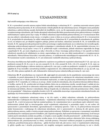 III K 929/14 UZASADNIENIE Sąd ustalił następujący stan faktyczny: R. M. w przeszłości zawarła umowę najmu lokalu mieszkalnego z oskarżoną M. P. – pomimo nazwania umowy przez oskarżoną umową użyczenia, R. M. za korzystanie z lokalu płaciła do rąk oskarżonej czynsz. Z biegiem czasu pomiędzy oskarżoną a pokrzywdzoną zaczęło dochodzić do konfliktów, m.in. na tle zapraszania przez pokrzywdzoną gości do wynajmowanego mieszkania, jak i braku akceptacji oskarżonej dla faktu pozostawania przez pokrzywdzoną w związku nieformalnym i zajścia przez nią w ciążę. W efekcie oskarżona zapowiedziała pokrzywdzonej, że w wyznaczonym dniu ma ona zabrać z mieszkania swoje rzeczy, w związku z czym w dniu 31.10.2014r. pokrzywdzona R. M. w towarzystwie K. K. przyjechała do mieszkania, by oddać oskarżonej klucze. Oskarżona M. P. przyjechała do mieszkania ok. godziny 10.00, na miejscu zaś, po obejściu najpierw pokoju, potem zaś kuchni, oskarżona zarzuciła R. M., że uszkodziła ona krzesło. R. M. zaproponowała potrącenie kosztów powyższego z zapłaconej kaucji, na co oskarżona nie wyraziła zgody, nakazując pokrzywdzonej naprawić wszystkie występujące w mieszkaniu szkody. R. M. zapowiedziała wówczas, że z oskarżoną rozliczy się jej ojciec i wraz z K. K. próbowała wyjść z mieszkania, jednak oskarżona zagrodziła im drogę i popchnęła R. M., po czym złapała ją za rękę i chwyciła za włosy; trzymając pokrzywdzoną w ten sposób na klatce schodowej zmusiła ją do uklęknięcia na ziemi, zapowiadając jej, że ma ona dalej zamieszkiwać w wynajmowanym mieszkaniu. Pokrzywdzona krzyczała i wzywała pomocy, co zaalarmowało mieszkających naprzeciwko M. D. i K. D.. W/wymienieni wyszli z mieszkania, K. D. zaś ostatecznie rozdzielił oskarżoną i pokrzywdzoną. Powyższy stan faktyczny Sąd ustalił na podstawie: częściowo na podstawie wyjaśnień oskarżonej M. P. (k. 150-151), na podstawie zeznań R. M. (k. 5-5v, k. 151-12), zeznań K. K. (k. 176), zeznań M. D.(k. 176-177), zeznań K. D. (k. 193), na podstawie opinii biegłego z zakresu medycyny sądowej (k. 129-134), a nadto na podstawie: notatki (k. 3-4), protokołu oględzin (k. 8-9), koszulki z zawartością nośnika z nagraniem (k. 26), dokumentacji lekarskiej (k. 41-43, 95-128, 143, 174, 187-189), pisma szpitala (k. 48), dokumentów złożonych przez oskarżycielkę prywatną (k. 190-191). Oskarżona M. P. przesłuchana na rozprawie (k. 150-151) nie przyznała się do popełnienia zarzuconego jej czynu i wyjaśniła, że przed zdarzeniem R. M. bezumownie zamieszkiwała w należącym do oskarżonej mieszkaniu, wraz z w/wymienioną zaś w lokalu przebywali nieustaleni mężczyźni, co stało się przyczyną wielokrotnych interweniowali sąsiadów. M. P. wyjaśniła, że w dniu 31.10.2014r., kiedy weszła do mieszkania, aby od pokrzywdzonej odebrać klucze, w środku, oprócz R. M., przebywała też druga kobieta, która się na oskarżoną rzuciła, zaczęła kopać i zadała jej cios pomiędzy oczy, po którym to uderzeniu oskarżona upadła i straciła przytomność; jednocześnie oskarżona wyjaśniła, że nieznana jej kobieta, obecna w mieszkaniu, biła ją i kopała tak, że oskarżona „była cała posiniaczona i zbita, więcej nic nie pamiętała”. Oskarżona wyjaśniła również, że R. M. uszkodziła stanowiące wyposażenie mieszkania krzesło, nie zgadzając się równocześnie na odkupienie nowego krzesła. Sąd obdarzył wyjaśnienia oskarżonej wiarą w tej ich części, w jakiej oskarżona wskazała, że pokrzywdzona zamieszkiwała w należącym do niej mieszkania – wyjaśnienia oskarżonej w tej ich części korespondują z zeznaniami samej R. M., z tych też przyczyn Sąd nie znalazł podstaw, by wyjaśnieniom tym w powołanej części odmówić wiary. Jednocześnie jednak Sąd za niewiarygodne uznał wyjaśnienia oskarżonej w pozostałej części, to zaś wobec ich sprzeczności z pozostałymi dowodami, zgromadzonymi w niniejszej sprawie. I tak: to, że pokrzywdzona korzystać miała bezumownie z należącego do oskarżonej mieszkania, stoi w sprzeczności ze złożoną do akt sprawy przez pokrzywdzoną umową, nadto z treścią zeznań samej pokrzywdzonej. Podobnie za sprzeczne z zeznaniami wszystkich przesłuchanych w niniejszej sprawie świadków, jak i zapisem nagrania, Sąd uznał twierdzenie oskarżonej, iż od razu po wejściu jej do mieszkania została ona pobita, w związku z czym upadła i straciła przytomność – podkreślenia wymaga, iż z odtworzonego na rozprawie nagrania wynika jasno, że to oskarżona podczas zdarzenia była stroną atakującą, pokrzywdzona zaś, przytrzymywana za włosy, wzywała pomocy. Powyższe wyklucza przyjęcie za prawdziwą wersji wydarzeń, przedstawionej przez oskarżoną – gdyby bowiem było tak, jak mowa o tym w wyjaśnieniach oskarżonej, tj. gdyby upadła ona i straciła przytomność, nie mogłaby następnie zaatakować pokrzywdzonej, to zaś w chwili, gdy chciała ona wyjść z mieszkania, tj. zakończyć spotkanie z oskarżoną. Podobnie wersji wydarzeń, przedstawionej przez oskarżoną, nie potwierdzają zapisy protokołu oględzin (k. 8v), z których wynika, iż w dniu zdarzenia u oskarżonej ujawniono wyłącznie zadrapanie na przedramieniu z krwiakiem podskórnym, nie ujawniono natomiast jakichkolwiek innych obrażeń. W konsekwencji Sąd złożone w powyższym zakresie przez oskarżoną wyjaśnienia uznał za niezasługujące za wiarę, fakt ich złożenia Sąd zaś przypisał obranej przez oskarżoną linii obrony. Przesłuchana w charakterze świadka R. M. zeznała (k. 5-5v, k. 151-12), że w przeszłości wynajmowała mieszkanie od oskarżonej, stosunek najmu zaś miał ustać z końcem miesiąca listopada 2014r. Pod koniec października oskarżona zadzwoniła jednak do świadka, zapowiadając, że następnego dnia stawi się w mieszkaniu z policją i wyrzuci z mieszkania rzeczy świadka. W