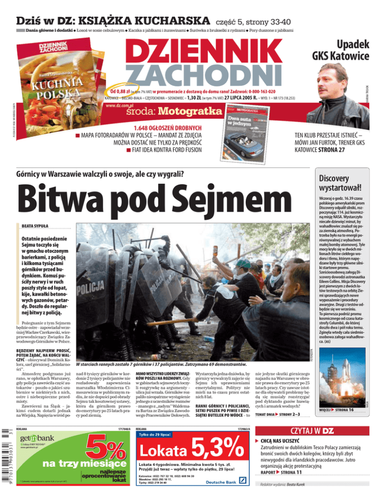 Dziś w ∑: KSIĄŻKA KUCHARSKA część 5, strony 33-40 Dania główne i dodatki • Łosoś w sosie cebulowym • Kaczka z jabłkami i żurawinami • Surówka z brukselki z rydzami • Pory duszone z jabłkami KARINA TROJOK Upadek GKS Katowice PL ISSN 0137-9038 NR INDEKSU 350079 Od 0,88 zł (w tym 7% VAT) w prenumeracie z dostawą do domu rano! Zadzwoń: 0-800-163-020 KATOWICE ■ BIELSKO-BIAŁA ■ CZĘSTOCHOWA ■ SOSNOWIEC ■ 1,30 ZŁ (w tym 7% VAT) 27 LIPCA 2005 R. ■ WYD. 1 ■ NR 173 (18.253) www.dz.com.pl środa: Motogratka 1.648 OGŁOSZEŃ DROBNYCH ■ MAPA FOTORADARÓW W POLSCE – MANDAT ZE ZDJĘCIA MOŻNA DOSTAĆ NIE TYLKO ZA PRĘDKOŚĆ ■ FIAT IDEA KONTRA FORD FUSION TEN KLUB PRZESTAJE ISTNIEĆ – MÓWI JAN FURTOK, TRENER GKS KATOWICE STRONA 27 Górnicy w Warszawie walczyli o swoje, ale czy wygrali? Discovery wystartował! Bitwa pod Sejmem Wczoraj o godz. 16.39 czasu polskiego amerykański prom Discovery odpalił silniki, rozpoczynając 114. już kosmiczną misję NASA. Wystarczyło niecałe dziewięć minut, by wahadłowiec znalazł się poza ziemską atmosferą. Potrzeba było na to energii porównywalnej z wybuchem małej bomby atomowej. Tyle mocy kryło się w dwóch milionach litrów ciekłego wodoru i tlenu, którym napędzane były trzy główne silniki startowe promu. Sześcioosobową załogą Discovery dowodzi astronautka Eileen Collins. Misja Discovery jest pierwszym z dwóch lotów testowych na orbitę Ziemi sprawdzających nowe wyposażenie i procedury awaryjne. Drugi z testów odbędzie się we wrześniu. To pierwsza podróż promu kosmicznego od czasu katastrofy Columbii, do której doszło dwa i pół roku temu. Zginęła wtedy cała siedmioosobowa załoga wahadłowca. (AS) BEATA SYPUŁA Ostatnie posiedzenie Sejmu toczyło się w gmachu otoczonym barierkami, z policją i kilkoma tysiącami górników przed budynkiem. Komuś puściły nerwy i w ruch poszły style od łopat, kije, kawałki betonowych gazonów, petardy. Doszło do regularnej bitwy z policją. REKLAMA W starciach rannych zostało 7 górników i 37 policjantów. Zatrzymano 69 demonstrantów. nad 8 tysięcy górników w kordonie 2 tysięcy policjantów nie rozładowały zapewnienia marszałka Włodzimierza Cimoszewicza w publicznym radiu, że nie dopuści pod obrady Sejmu tak kosztownej ustawy, która da górnikom prawo do emerytury po 25 latach pracy pod ziemią. 1717048/A MIMO WSZYSTKO LIDERZY ZWIĄZKÓW POSZLI NA ROZMOWY. Gdy w gabinetach sejmowych toczyli rozgrywkę na argumenty – ulica już wrzała. Górników rozpaliło nieopatrzne wystąpienie jednego zuczestników rozmów – znanego z„zadym” Waldemara Bartza ze Związku Zawodowego Pracowników Dołowych. REKLAMA Wystarczyła jedna dniówka, by górnicy wywalczyli zajęcie się Sejmu ich uprawnieniami emerytalnymi. Politycy nie mieli na to czasu przez ostatnich 8 lat. RANNI GÓRNICY I POLICJANCI, SETKI PUSZEK PO PIWIE I DZIESIĄTKI BUTELEK PO WÓDCE – to 1729863/A nie jedyne skutki górniczego najazdu na Warszawę w obronie prawa do emerytury po 25 latach pracy. Czy zawsze istotne dla obywateli problemy będą się musiały rozstrzygać pod dyktando gazów łzawiących i armatek wodnych? TEMAT DNIA x STRONY 2–3 NASA BĘDZIEMY NAJPIERW PROSIĆ, POTEM ŻĄDAĆ, NA KOŃCU WALCZYĆ – obiecywał Dominik Kolorz, szef górniczej „Solidarności”. Atmosferę podgrzano już rano, w opłotkach Warszawy, gdy policja zawróciła część autokarów – poszło o jakieś szubienice w niektórych z nich, ostre i niebezpieczne przedmioty. Zawróceni na Śląsk – jakimś cudem dotarli jednak na Wiejską. Napięcia wśród po- FOTORZEPA Pożegnanie z tym Sejmem będzie ostre – zapowiadał wcześniej Wacław Czerkawski, wiceprzewodniczący Związku Zawodowego Górników w Polsce. WIĘCEJ x STRONA 16 CZYTAJ W ∑ x CHCĄ NAS UCISZYĆ Zatrudnieni w dublińskim Tesco Polacy zamierzają bronić swoich dwóch kolegów, którzy byli zbyt niewygodni dla irlandzkich pracodawców. Jutro organizują akcję protestacyjną RAPORT x STRONA 11 Redaktor wydania: Beata Kurek