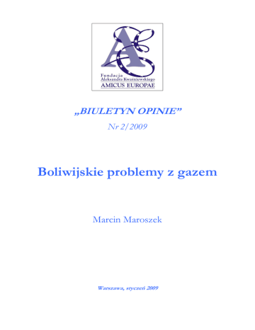 „BIULETYN OPINIE” Nr 2/2009 Boliwijskie problemy z gazem Marcin Maroszek Warszawa, styczeń 2009 „Biuletyn OPINIE” Fundacji Amicus Europae nr 2/2009 _____________________________________________________________________________________________________________________________________________________________________________________________________________________________________________ W tym samym czasie, kiedy cała Europa wyczekiwała zakończenia sporu na linii Moskwa – Kijów i wznowienia dostaw gazu z Rosji, na zachodniej półkuli miał miejsce inny kryzys gazowy. Na ironię zakrawa fakt, że o ile niektóre państwa europejskie miały problemy spowodowane brakiem tego surowca, o tyle Boliwia nie mogła znaleźć chętnych nań odbiorców. Bogactwo Boliwii Boliwia posiada drugie po Wenezueli największe w Ameryce Łacińskiej złoża gazu ziemnego1, przez długi czas jednak nie wykorzystywała tego potencjału. W połowie lat 90. XX w. dokonano prywatyzacji państwowego molocha YPFB (Yacimientos Petrolíferos Fiscales Bolivianos), zawiadującego wydobyciem gazu, co stało się impulsem do zmian w tym sektorze gospodarki boliwijskiej. Prywatyzacja przyciągnęła znaczne ilości kapitału zagranicznego, co pozwoliło na intensywne poszukiwania nowych złóż gazu. Ich efektem był 600% wzrost wielkości potwierdzonych złóż gazu w okresie 1997–2005. Według Oil and Gas Journal zasoby gazowe Boliwii wynoszą 680 bilionów metrów sześciennych2. Ogromna ich większość (85%) znajduje się w regionie Tarija, w południowo-wschodniej części kraju. W związku z nowo odkrytymi złożami, na początku XXI w. powstało konsorcjum Pacific LNG, złożone z kilku zagranicznych przedsiębiorstw, m.in. hiszpańskiego Repsol-YPF i brytyjskiego BG Group. Celem konsorcjum było zbudowanie gazociągu prowadzącego do portu w Chile, skąd gaz mógłby być eksportowany do innych krajów. Projekt ten jednak niósł ze sobą problemy polityczne związane z zapalną w Boliwii kwestią dostępu do morza. Kraj ten utracił go w wyniku Wojny o Pacyfik w latach 1879-1883. Dążenie do odzyskania dostępu do morza stało się odtąd jedną z podstaw polityki zagranicznej Boliwii i przyczyną napiętych momentami stosunków z państwami ościennymi: Chile i Peru3. Projekt gazoportu w Chile zakładał zbudowanie go za zgodą władz w Santiago na terenie, do którego prawa rości sobie La Paz. Pośrednio zatem sankcjonował przynależność spornego obszaru do Chile. Drugim problemem związanym z tym projektem był fakt, że zakładał on eksport gazu nieprzetworzonego. Dla wielu środowisk w Boliwii było to tożsame z traktowaniem ich ojczyzny jako zaplecza surowcowego (jak miało to miejsce w czasach kolonialnych). Domagały się one przetwarzania gazu w kraju i eksportu w uszlachetnionej postaci. Argumentem przemawiającym za takim rozwiązaniem był oczywisty rachunek ekonomiczny: eksport uszlachetnionego gazu przyniósłby Boliwii znacznie większe wpływy z tego tytułu. Kiedy w 2003 r. rząd w La Paz podjął kroki zmierzające ku realizacji gazociągu Pacific LNG, krajem wstrząsnęła fala protestów nacjonalistycznych (tzw. wojna o gaz). W ich efekcie z urzędu zrezygnował prezydent Gonzalo Sánchez de Lozada. http://www.eia.doe.gov/emeu/cabs/Bolivia/NaturalGas.html . Ibidem. 3 P. Łaciński, Polityka zagraniczna państw andyjskich, [w:] Polityka zagraniczna państw Ameryki Łacińskiej, pod red. M.F. Gawryckiego, Warszawa 2006, s. 213-216. 1 2 2 „Biuletyn OPINIE” Fundacji Amicus Europae nr 2/2009 _____________________________________________________________________________________________________________________________________________________________________________________________________________________________________________ Nacjonalizacja gazu Rok 2005 był czasem niepokojów i protestów społecznych w Boliwii. Jedną z ich głównych przyczyn było żądanie nacjonalizacji strategicznego dla kraju przemysłu gazowego i zwiększenie praw ludności indiańskiej zamieszkującej gazonośne tereny. W maju 2005 r. parlament ustanowił prawo, które wprowadzało państwową kontrolę zagranicznych spółek zarządzających boliwijskim gazem. Mimo to nasiliły się protesty, ludność domagała się całkowitej nacjonalizacji przemysłu gazowego. Wydarzenia te doprowadziły do rezygnacji kolejnego prezydenta, Carlosa Mesy. Na fali protestów w 2005 r. w wyborach prezydenckich zwyciężył Evo Morales, pierwszy w historii Boliwii prezydent wywodzący się z rdzennej ludności kontynentu. Jako przedstawiciel Ruchu na rzecz Socjalizmu (Movimento al Socialismo), zapowiadał wspieranie biedoty i rdzennej ludności Boliwii, m.in. poprzez nacjonalizację przemysłu gazowego i redystrybucję dochodów ze sprzedaży gazu. Po dojściu do władzy, w maju 2006 r. Morales spełnił obietnicę wyborczą i dokonał nacjonalizacji strategicznego przemysłu4. Całość wydobycia gazu od tej pory jest znów pod kontrolą państwowego YPFB. Posunięcie to spotkało się z oczywistą krytyką największych inwestorów zagranicznych: Repsol-YPF, BG Group, brazylijskiego Petrobras i francuskiego Total. Mimo protestów cel, jakim było zwiększenie zysków państwa ze sprzedaży gazu, został osiągnięty5. Brazylia Jeszcze przed prywatyzacją przemysłu gazowego, w 1994 r. podpisane zostało porozumienie, na mocy którego zbudowano warty 2,2 miliarda USD gazociąg prowadzący z Santa Cruz w Boliwii do Porto Alegre w Brazylii, tzw. Gasbol. W 1999 r. zaczęto nim przesyłać gaz do Brazylii w ramach 20letniego kontraktu take-or-pay. Ten rodzaj umowy oznaczał, że Brazylia była zobowiązana zapłacić za minimalną ilość zakontraktowanego gazu, niezależnie, czy w danym okresie tyle potrzebowała i zużywała, czy nie. Brazylijski Petrobras był także jednym z największych inwestorów w boliwijski przemysł gazowy. Po nacjonalizacji YPFB w Boliwii w 2006 r., La Paz i Brasilia wkroczyły w okres ne