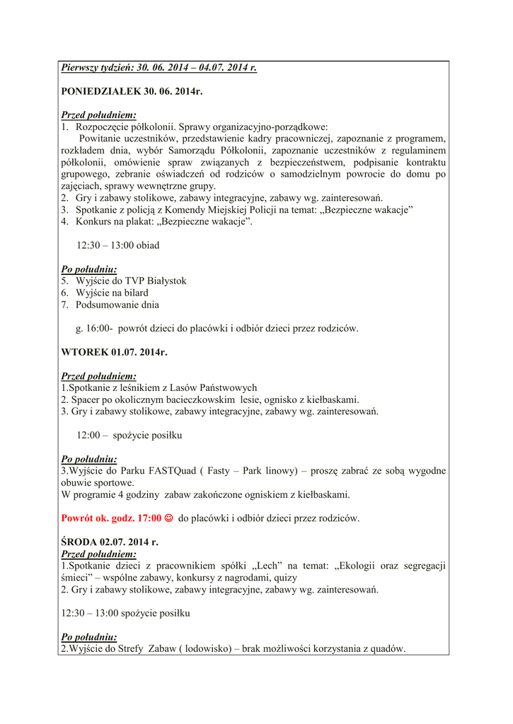 Pierwszy tydzień: 30. 06. 2014 – 04.07. 2014 r. PONIEDZIAŁEK 30. 06. 2014r. Przed południem: 1. Rozpoczęcie półkolonii. Sprawy organizacyjno-porządkowe: Powitanie uczestników, przedstawienie kadry pracowniczej, zapoznanie z programem, rozkładem dnia, wybór Samorządu Półkolonii, zapoznanie uczestników z regulaminem półkolonii, omówienie spraw związanych z bezpieczeństwem, podpisanie kontraktu grupowego, zebranie oświadczeń od rodziców o samodzielnym powrocie do domu po zajęciach, sprawy wewnętrzne grupy. 2. Gry i zabawy stolikowe, zabawy integracyjne, zabawy wg. zainteresowań. 3. Spotkanie z policją z Komendy Miejskiej Policji na temat: „Bezpieczne wakacje” 4. Konkurs na plakat: „Bezpieczne wakacje”. 12:30 – 13:00 obiad Po południu: 5. Wyjście do TVP Białystok 6. Wyjście na bilard 7. Podsumowanie dnia g. 16:00- powrót dzieci do placówki i odbiór dzieci przez rodziców. WTOREK 01.07. 2014r. Przed południem: 1.Spotkanie z leśnikiem z Lasów Państwowych 2. Spacer po okolicznym bacieczkowskim lesie, ognisko z kiełbaskami. 3. Gry i zabawy stolikowe, zabawy integracyjne, zabawy wg. zainteresowań. 12:00 – spożycie posiłku Po południu: 3.Wyjście do Parku FASTQuad ( Fasty – Park linowy) – proszę zabrać ze sobą wygodne obuwie sportowe. W programie 4 godziny zabaw zakończone ogniskiem z kiełbaskami. Powrót ok. godz. 17:00 do placówki i odbiór dzieci przez rodziców. ŚRODA 02.07. 2014 r. Przed południem: 1.Spotkanie dzieci z pracownikiem spółki „Lech” na temat: „Ekologii oraz segregacji śmieci” – wspólne zabawy, konkursy z nagrodami, quizy 2. Gry i zabawy stolikowe, zabawy integracyjne, zabawy wg. zainteresowań. 12:30 – 13:00 spożycie posiłku Po południu: 2.Wyjście do Strefy Zabaw ( lodowisko) – brak możliwości korzystania z quadów. 3.Podsumowanie dnia. g. 16:00- powrót dzieci do placówki i odbiór dzieci przez rodziców. CZWARTEK 03. 07. 2014r. Przed południem: 1.Wyjscie do Muzeum Medycznego 2.Gry i zabawy stolikowe, zabawy integracyjne, zabawy wg. zainteresowań. 12:30 – 13:00 spożycie posiłku Po południu: 2.Wyjście do Fikolandu 3.Podsumowanie dnia. 16:00- powrót dzieci do placówki i odbiór dzieci przez rodziców. PIĄTEK 04. 07. 2014r. Wycieczka całodzienna Kruszyniany – Poczopek Program ramowy wycieczki: 08.00 – wyjazd z Białegostoku – przyjazd do Poczopka, zwiedzanie Silvarium: ścieżki dydaktyczne, Park Megalityczny, Galeria Na Skraju Puszczy - przyjazd do Kruszynian, wizyta u polskich tatarów, zwiedzanie meczetu i mizaru, tatarska jurta - ognisko Ok. 16.00 - powrót Świadczenia: ubezpieczenie NNW, przjeazd autokarem, usługi przewodnickie, ognisko, opłata za wstęp, Podsumowanie pierwszego tygodnia, omówienie „za” i „przeciw” pierwszego tygodnia wypoczynku. Zabawa w kręgu, dokończ zadanie: „Półkolonie są…” Udzielenie pochwał ewentualnie upomnień niesfornym wychowankom. Przypomnienie programu na następny tydzień. Pożegnanie. Drugi tydzień: 07.07.2014 – 11.07. 2014r. PONIEDZIAŁEK 07.07. 2014 r. Przed południem: Rozpoczęcie półkolonii ( II turnus). Sprawy organizacyjno-porządkowe: Powitanie uczestników, przedstawienie kadry pracowniczej, zapoznanie z programem, rozkładem dnia, wybór Samorządu Półkolonii, zapoznanie uczestników z regulaminem półkolonii, omówienie spraw związanych z bezpieczeństwem, podpisanie kontraktu grupowego, zebranie oświadczeń od rodziców o samodzielnym powrocie do domu po zajęciach, sprawy wewnętrzne grupy. 1.Spotkanie z policją z Komendy Miejskiej Policji na temat: „Bezpieczne wakacje” 2.Konkurs na plakat: „Bezpieczne wakacje”. 12:30 – 13:00 spożycie posiłku Po południu: 8. Wyjście do TVP Białystok 9. Wyjście na bilard 10. Podsumowanie dnia g. 16:00- powrót dzieci do placówki i odbiór dzieci przez rodziców. WTOREK 08.07. 2014 r. Przed południem: 1.Spotkanie z leśnikiem z Lasów Państwowych 2. Spacer po okolicznym bacieczkowskim lesie, ognisko z kiełbaskami. 3. Gry i zabawy stolikowe, zabawy integracyjne, zabawy wg. zainteresowań. 12:00 – spożycie posiłku Po południu: 3.Wyjście do Parku FASTQuad ( Fasty – Park linowy) – proszę zabrać ze sobą wygodne obuwie sportowe. W programie 4 godziny zabaw zakończone ogniskiem z kiełbaskami. Powrót ok. godz. 17:00 do placówki i odbiór dzieci przez rodziców. ŚRODA 09. 07. 2014r. Przed południem: 1.Spotkanie dzieci z pracownikiem spółki „Lech” na temat: „Ekologii oraz segregacji śmieci” – wspólne zabawy, konkursy z nagrodami, quizy 2. Gry i zabawy stolikowe, zabawy integracyjne, zabawy wg. zainteresowań. 12:30 – 13:00 spożycie posiłku Po południu: 2.Wyjście do Strefy Zabaw ( lodowisko) – brak możliwości korzystania z quadów. 3.Podsumowanie dnia. g. 16:00- powrót dzieci do placówki i odbiór dzieci przez rodziców. CZWARTEK 10. 07. 2014r. Przed południem: 1. Wyjście do Muzeum Medycznego/bilard 2. Gry i zabawy stolikowe, zabawy integracyjne, zabawy wg. zainteresowań. 12: 30 – 13: 00 – spożycie posiłku Po południu: 2.Wyjście do Fikolandu 4.Podsumowanie dnia g. 16:00- powrót dzieci do placówki i odbiór dzieci przez rodziców. PIĄTEK 11. 07. 2014r. Wycieczka całodzienna „Poznajemy północną część Puszczy Białowieskiej“ Program ramowy wycieczki: 08.00 – wyjazd z Białegostoku – przyjazd do Gruszek k/Narewki, zwiedzanie Parku Przyrodniczego w Gruszkach - wieża widokowa w Maruszce nad zalewem Siemianówka - ognisko i wizyta w „Bobrowej Zagrodzie“, gry i zabawy - plażowanie nad zalewem Siemianówka - spacer po zaporze czołowej w Bondarach Ok. 16.00 - powrót Świadczenia: ubezpieczenie NNW, przejazd autokarem, zajęcia edukacyjne, bilety wstępu, usługi przewodnickie, ognisko Podsumowanie drugiego tygodnia, omówienie „za” i „przeciw” drugiego tygodnia wypoczynku. Zabawa w kręgu, dokończ zadanie: „Półkolonie są…” Udzielenie pochwał. Przypomnienie pr