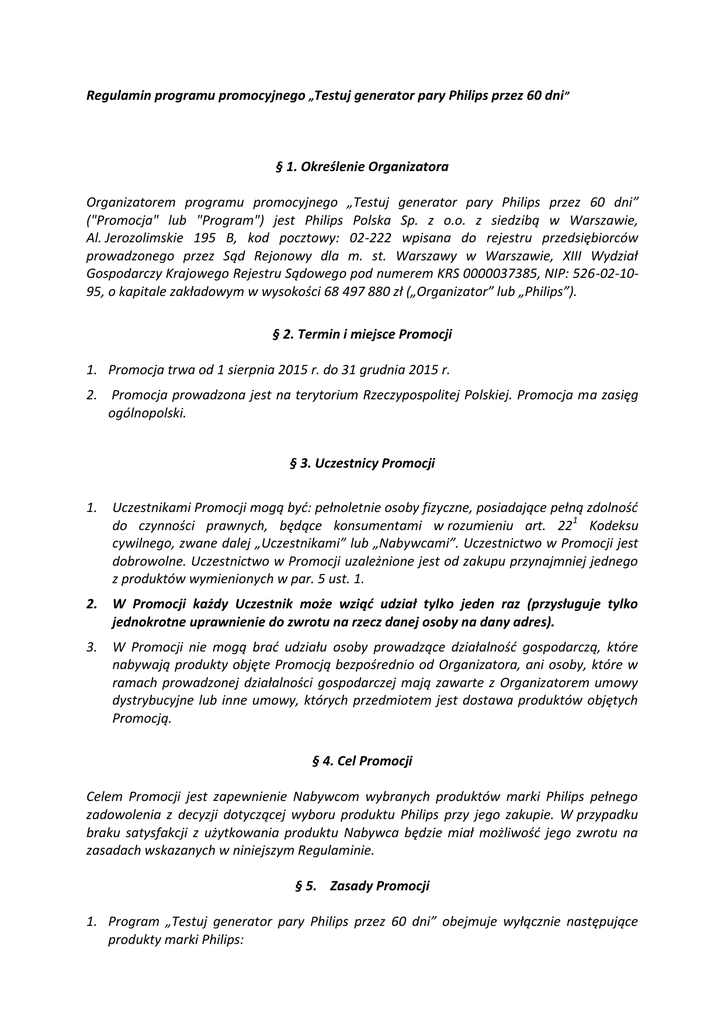 Gospodarczy Krajowego Rejestru Sądowego pod numerem KRS 0000037385, NIP: 526-02-1095, o kapitale zakładowym w wysokości 68 497 880 zł („Organizator” lub „Philips”).