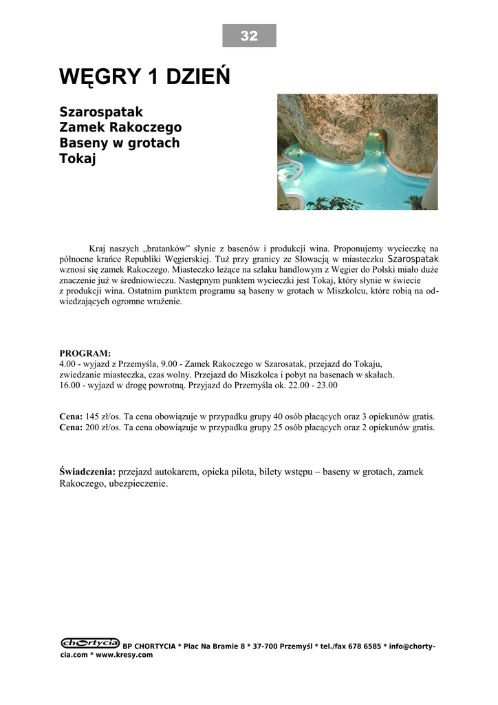 32 WĘGRY 1 DZIEŃ Szarospatak Zamek Rakoczego Baseny w grotach Tokaj Kraj naszych „bratanków” słynie z basenów i produkcji wina. Proponujemy wycieczkę na północne krańce Republiki Węgierskiej. Tuż przy granicy ze Słowacją w miasteczku Szarospatak wznosi się zamek Rakoczego. Miasteczko leżące na szlaku handlowym z Węgier do Polski miało duże znaczenie już w średniowieczu. Następnym punktem wycieczki jest Tokaj, który słynie w świecie z produkcji wina. Ostatnim punktem programu są baseny w grotach w Miszkolcu, które robią na odwiedzających ogromne wrażenie. PROGRAM: 4.00 - wyjazd z Przemyśla, 9.00 - Zamek Rakoczego w Szarosatak, przejazd do Tokaju, zwiedzanie miasteczka, czas wolny. Przejazd do Miszkolca i pobyt na basenach w skałach. 16.00 - wyjazd w drogę powrotną. Przyjazd do Przemyśla ok. 22.00 - 23.00 Cena: 145 zł/os. Ta cena obowiązuje w przypadku grupy 40 osób płacących oraz 3 opiekunów gratis. Cena: 200 zł/os. Ta cena obowiązuje w przypadku grupy 25 osób płacących oraz 2 opiekunów gratis. Świadczenia: przejazd autokarem, opieka pilota, bilety wstępu – baseny w grotach, zamek Rakoczego, ubezpieczenie. BP CHORTYCIA * Plac Na Bramie 8 * 37-700 Przemyśl * tel./fax 678 6585 * [email protected] * www.kresy.com