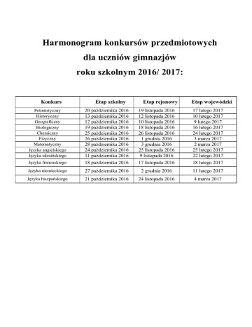 Harmonogram konkursów przedmiotowych dla uczniów gimnazjów roku szkolnym 2016/ 2017: Konkurs Etap szkolny Etap rejonowy Etap wojewódzki Języka francuskiego 20 października 2016 13 października 2016 12 października 2016 19 października 2016 25 października 2016 26 października 2016 28 października 2016 24 października 2016 11 października 2016 18 października 2016 19 listopada 2016 12 listopada 2016 10 listopada 2016 18 listopada 2016 26 listopada 2016 1 grudnia 2016 3 grudnia 2016 25 listopada 2016 9 listopada 2016 17 listopada 2016 17 lutego 2017 10 lutego 2017 9 lutego 2017 16 lutego 2017 24 lutego 2017 3 marca 2017 2 marca 2017 25 lutego 2017 22 lutego 2017 18 lutego 2017 Języka niemieckiego 27 października 2016 2 grudnia 2016 11 lutego 2017 Języka hiszpańskiego 21 października 2016 24 listopada 2016 4 marca 2017 Polonistyczny Historyczny Geograficzny Biologiczny Chemiczny Fizyczny Matematyczny Języka angielskiego Języka ukraińskiego