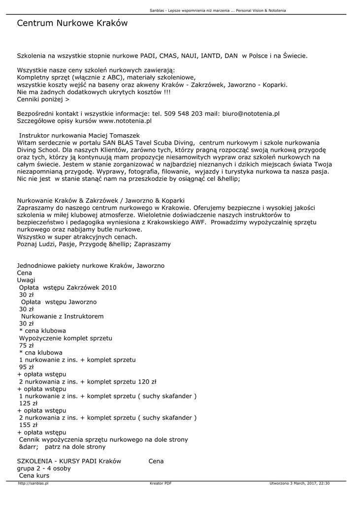 Sanblas - Lepsze wspomnienia niż marzenia ... Personal Vision & Nototenia Centrum Nurkowe Kraków Szkolenia na wszystkie stopnie nurkowe PADI, CMAS, NAUI, IANTD, DAN w Polsce i na Świecie. Wszystkie nasze ceny szkoleń nurkowych zawierają: Kompletny sprzęt (włącznie z ABC), materiały szkoleniowe, wszystkie koszty wejść na baseny oraz akweny Kraków - Zakrzówek, Jaworzno - Koparki. Nie ma żadnych dodatkowych ukrytych kosztów !!! Cenniki poniżej > Bezpośredni kontakt i wszystkie informacje: tel. 509 548 203 mail: [email protected] Szczegółowe opisy kursów www.nototenia.pl Instruktor nurkowania Maciej Tomaszek Witam serdecznie w portalu SAN BLAS Tavel Scuba Diving, centrum nurkowym i szkole nurkowania Diving School. Dla naszych Klientów, zarówno tych, którzy pragną rozpocząć swoją nurkową przygodę oraz tych, którzy ją kontynuują mam propozycje niesamowitych wypraw oraz szkoleń nurkowych na całym świecie. Jestem w stanie zorganizować w najbardziej nieznanych i dzikich miejscach świata Twoja niezapomnianą przygodę. Wyprawy, fotografia, filowanie, wyjazdy i turystyka nurkowa ta nasza pasja. Nic nie jest w stanie stanąć nam na przeszkodzie by osiągnąć cel … Nurkowanie Kraków & Zakrzówek / Jaworzno & Koparki Zapraszamy do naszego centrum nurkowego w Krakowie. Oferujemy bezpieczne i wysokiej jakości szkolenia w miłej klubowej atmosferze. Wieloletnie doświadczenie naszych instruktorów to bezpieczeństwo i pedagogika wyniesiona z Krakowskiego AWF. Prowadzimy wypożyczalnię sprzętu nurkowego oraz nabijamy butle nurkowe. Wszystko w super atrakcyjnych cenach. Poznaj Ludzi, Pasje, Przygodę … Zapraszamy Jednodniowe pakiety nurkowe Kraków, Jaworzno Cena Uwagi Opłata wstępu Zakrzówek 2010 30 zł Opłata wstępu Jaworzno 30 zł Nurkowanie z Instruktorem 30 zł * cena klubowa Wypożyczenie komplet sprzetu 75 zł * cna klubowa 1 nurkowanie z ins. + komplet sprzetu 95 zł + opłata wstępu 2 nurkowania z ins. + komplet sprzetu 120 zł + opłata wstępu 1 nurkowanie z ins. + komplet sprzetu ( suchy skafander ) 125 zł + opłata wstępu 2 nurkowania z ins. + komplet sprzetu ( suchy skafander ) 155 zł + opłata wstępu Cennik wypożyczenia sprzętu nurkowego na dole strony ↓ patrz na dole strony SZKOLENIA - KURSY PADI Kraków grupa 2 - 4 osoby Cena kurs http://sanblas.pl Cena Kreator PDF Utworzono 3 March, 2017, 22:30 Sanblas - Lepsze wspomnienia niż marzenia ... Personal Vision & Nototenia indywidualny Uwagi* Discover Scuba Diving (INTRO) 100 zł 150 zł + opłata wstępu Scuba Diver 450 zł 500 zł + cetyfikat Open Water Diver (OWD) 1200zł 1700 zł + cetyfikat Advanced Open Water Diver (AOWD) 700 zł 800 zł + cetyfikat Emergency First Responce 250 zł 350 zł + cetyfikat Rescue Diver 800 zł 950 zł + cetyfikat Dive Master 1650 zł 2050 zł + opłata PADI SPECJALIZACJE NURKOWE PADI Nurkowanie w suchy skafandrach 370 zł 520 zł + cetyfikat Specjalizacja Nitroxowa 320 zł520 zł + cetyfikat Nurkowanie Wrakowe 420 zł 620 zł + cetyfikat Nurkowanie Głębokie 420 zł 620 zł + cetyfikat Nawigacja Podwodna 320 zł 420 zł + cetyfikat Doskonała pływalność "zerowa" 270 zł 370 zł + cetyfikat Nurkowanie Podlodowe 370 zł 620 zł + cetyfikat PROGRAMY NURKOWE DLA DZIECI PADI Bubbelmaker - "Bąbelkowiec" 150 zł 350 zł - Seal Team - "Komando Foki" 450 zł 550 zł SZKOLENIA NURKOWE CMAS Kraków Cena grupa 2 - 4 osoby Cena kurs indywidualny UWAGI Intro nurkowe 100 zł 150 zł + opłata wstępu P1 CMAS* 1150 zł 1500 zł + cetyfikat P2 CMAS** 1450 zł 1850 zł + cetyfikat P3 CMAS*** 1700 zł 2200 zl + cetyfikat SPECJALIZACJE NURKOWE CMAS Nurek eksplorator 470 zł 620 zł + cetyfikat Nurkowanie w zestawie dwubutlowym http://sanblas.pl Kreator PDF Utworzono 3 March, 2017, 22:30 Sanblas - Lepsze wspomnienia niż marzenia ... Personal Vision & Nototenia 270 zł 420 zł + cetyfikat Nitrox 270 zł 320 zł + cetyfikat Nitrox II stopnia 820 zł 1220 zł + cetyfikat Suche skafandry 270 zł 470 zł + cetyfikat Wrakowo - Morska 470 zł 820 zł + cetyfikat Nurkowanie podlodowe 320 zł 520 zl + cetyfikat Nawigacja podwodna 220 zł 370 zł + cetyfikat Nurkowanie nocne 170 zł 270 zł + cetyfikat Wyciąganie z wydobywaniem 270 zł 470 zł + cetyfikatNURKOWANIE DLA DZIECI CMAS Program Srebrny 400 zł 500 zł + cetyfikat Program Brazowy 600 zł 700 zł + cetyfikat Program Złoty 700 zł 800 zł + cetyfikat SZKOLENIA NURKOWE NAUI Kraków CENA UWAGI Intro nurkowe 100 zł + opłata wstępu Scuba Diver 1000 zł + 150 zł cetyfikat Advanced Scuba Diver 600 zł + 150 zł cetyfikat Rescue Diver 900 zł + 150 zł cetyfikat Master Scuba Diver info. tel. Divemaser 1400 zł + opłata NAUI Skin Diving Instructor info. mail Asystent instruktora info. mail SPECJALIZACJE NURKOWE NAUI Nitrox Diver 250 zł + 150 zł cetyfikat Deep Diver 300 zł + 150 zł cetyfikat NURKOWANIE DLA DZIECI NAUI Junior Scuba Diwer http://sanblas.pl Kreator PDF Utworzono 3 March, 2017, 22:30 Sanblas - Lepsze wspomnienia niż marzenia ... Personal Vision & Nototenia 700 zł + 150 zł cetyfikat SZKOLENIA DAN Kraków CENA UWAGI Advanced Oxygen Provider 350 zł cena z certyfikatem Basic Life Support - KURS RESUSCYTACJI 350 zł cena z certyfikatem Pakiet - Basic Life Support, Advanced Oxygen Provider 650 zł cena z cetyfikatem Nurkowanie Egipt Hurghada Zapraszamy SZKOLENIA - KURSY PADI Hurghada CENA UWAGI Discover Scuba Diving (INTRO) 50 USD Scuba Diver 170 USD 40 USD Cetyfikat Open Water Diver (OWD) 300 USD 40 USD Cetyfikat Open Water Diver (OWD) - dokończenie 185 USD 40 USD Cetyfikat Advanced Open Water Diver (AOWD) 200 USD 40 USD Cetyfikat Emergency First Responce 180 USD 40 USD Cetyfikat Rescue Diver 290 USD 40 USD Cetyfikat Dive Master 500 USD Opłata PADI SPECJALIZACJE NURKOWE PADI Specjalizacja Nitroxowa info. mail Nurkowanie Wrakowe info. mail Nurkowanie Głębokie info. mail Nurkowanie Nocne info. mail Nawigacja Podwodna info. mail Idealna pływalność "zerowa" info. mail PROGRAMY NURKOWE DLA DZIECI PAD