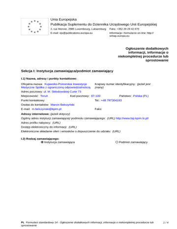 Unia Europejska Publikacja Suplementu do Dziennika Urzędowego Unii Europejskiej 2, rue Mercier, 2985 Luxembourg, Luksemburg Faks: +352 29 29 42 670 E-mail: [email protected] Informacje i formularze on-line: http:// simap.europa.eu Ogłoszenie dodatkowych informacji, informacje o niekompletnej procedurze lub sprostowanie Sekcja I: Instytucja zamawiająca/podmiot zamawiający I.1) Nazwa, adresy i punkty kontaktowe: Oficjalna nazwa: Kujawsko-Pomorskie Inwestycje Medyczne Spółka z ograniczoną odpowiedzialnością Krajowy numer identyfikacyjny: (jeżeli jest znany) _____ Adres pocztowy: ul. M. Skłodowskiej-Curie 73 Miejscowość: Toruń Kod pocztowy: 87-100 Punkt kontaktowy: _____ Państwo: Polska (PL) Tel.: +48 797304193 Osoba do kontaktów: Marcin Belczyński E-mail: [email protected] Faks: _____ Adresy internetowe: (jeżeli dotyczy) Ogólny adres instytucji zamawiającej/ podmiotu zamawiającego: (URL) http://www.bip.kpim.lo.pl/ Adres profilu nabywcy: (URL) _____ Dostęp elektroniczny do informacji: (URL) _____ Elektroniczne składanie ofert i wniosków o dopuszczenie do udziału: (URL) _____ I.2) Rodzaj zamawiającego: Instytucja zamawiająca Podmiot zamawiający PL Formularz standardowy 14 - Ogłoszenie dodatkowych informacji, informacje o niekompletnej procedurze lub sprostowanie 1/4 Sekcja II: Przedmiot zamówienia II.1.1) Nazwa nadana zamówieniu: Podniesienie jakości usług zdrowotnych oraz zwiększenie dostępu do usług medycznych (adaptacja budynków nr 9, 7 i 12) w Wojewódzkim Szpitalu Specjalistycznym im. bł. ks. J. Popiełuszki we Włocławku w formule „zaprojektuj i wykonaj.” II.1.2) Krótki opis zamówienia lub zakupu: (podano w pierwotnym ogłoszeniu) Przedmiotem zamówienia jest wykonanie robót budowlanych w formule „zaprojektuj i wykonaj” II.1.3) Wspólny Słownik Zamówień (CPV) Główny przedmiot Dodatkowe przedmioty Słownik główny 45113000 45000000 45215140 71220000 Słownik uzupełniający (jeżeli dotyczy) PL Formularz standardowy 14 - Ogłoszenie dodatkowych informacji, informacje o niekompletnej procedurze lub sprostowanie 2/4 Sekcja IV: Procedura IV.1)Rodzaj procedury (podano w pierwotnym ogłoszeniu) Otwarta Ograniczona Ograniczona przyspieszona Negocjacyjna Negocjacyjna przyspieszona Dialog konkurencyjny Negocjacyjna z uprzednim ogłoszeniem Negocjacyjna bez uprzedniego ogłoszenia Negocjacyjna z publikacją ogłoszenia o zamówieniu Negocjacyjna bez publikacji ogłoszenia o zamówieniu Udzielenie zamówienia bez uprzedniej publikacji ogłoszenia o zamówieniu w Dzienniku Urzędowym Unii Europejskiej IV.2)Informacje administracyjne IV.2.1)Numer referencyjny: (podano w pierwotnym ogłoszeniu) ZP/05/16 IV.2.2)Dane referencyjne ogłoszenia w przypadku ogłoszeń przesłanych drogą elektroniczną: Pierwotne ogłoszenie przesłane przez eNotices TED eSender Login: ENOTICES_kpimspzoo Dane referencyjne ogłoszenia: 2016-153788 rok i numer dokumentu IV.2.3)Ogłoszenie, którego dotyczy niniejsza publikacja: Numer ogłoszenia w Dz.U.: 2016/S 233-425093 z dnia: 02/12/2016 (dd/mm/rrrr) IV.2.4)Data wysłania pierwotnego ogłoszenia: 30/11/2016 (dd/mm/rrrr) PL Formularz standardowy 14 - Ogłoszenie dodatkowych informacji, informacje o niekompletnej procedurze lub sprostowanie 3/4 Sekcja VI: Informacje uzupełniające VI.1) Ogłoszenie dotyczy: Procedury niepełnej Sprostowania Informacji dodatkowych VI.2) Informacje na temat niepełnej procedury udzielenia zamówienia: Postępowanie o udzielenie zamówienia zostało przerwane Postępowanie o udzielenie zamówienia uznano za nieskuteczne Zamówienia nie udzielono Zamówienie może być przedmiotem ponownej publikacji VI.3) Informacje do poprawienia lub dodania : VI.3.1) Zmiana oryginalnej informacji podanej przez instytucję zamawiającą Publikacja w witrynie TED niezgodna z oryginalną informacją, przekazaną przez instytucję zamawiającą Oba przypadki VI.3.2) W ogłoszeniu pierwotnym W odpowiedniej dokumentacji przetargowej (więcej informacji w odpowiedniej dokumentacji przetargowej) W obu przypadkach (więcej informacji w odpowiedniej dokumentacji przetargowej) VI.3.3) Tekst, który należy poprawić w pierwotnym ogłoszeniu Miejsce, w którym znajduje się Zamiast: zmieniany tekst: 3. Wadium w formie pieniężnej Sekcja III.1.1) należy wnieść najpóźniej do dnia 10.1.2017 r. do godziny 10:00 na rachunek bankowy Zamawiającego: Powinno być: 3. Wadium w formie pieniężnej należy wnieść najpóźniej do dnia 20.1.2017 r. do godziny 10:00 na rachunek bankowy Zamawiającego: VI.3.4) Daty, które należy poprawić w pierwotnym ogłoszeniu Miejsce, w którym znajdują się Zamiast: zmieniane daty: 10/01/2017 Godzina: 10:00 Sekcja IV.3.4) (dd/mm/rrrr) Powinno być: 20/01/2017 Godzina: 10:00 (dd/mm/rrrr) Miejsce, w którym znajdują się zmieniane daty: Sekcja IV.3.8) Powinno być: 20/01/2017 Godzina: 10:15 (dd/mm/rrrr) Zamiast: 10/01/2017 Godzina: 10:15 (dd/mm/rrrr) VI.3.5) Adresy i punkty kontaktowe, które należy poprawić VI.3.6) Tekst, który należy dodać do pierwotnego ogłoszenia Miejsce, w którym należy dodać tekst: Tekst do dodania: VI.4) Inne dodatkowe informacje: _____ VI.5) Data wysłania niniejszego ogłoszenia: 04/01/2017 (dd/mm/rrrr) - ID:2017-001661 PL Formularz standardowy 14 - Ogłoszenie dodatkowych informacji, informacje o niekompletnej procedurze lub sprostowanie 4/4