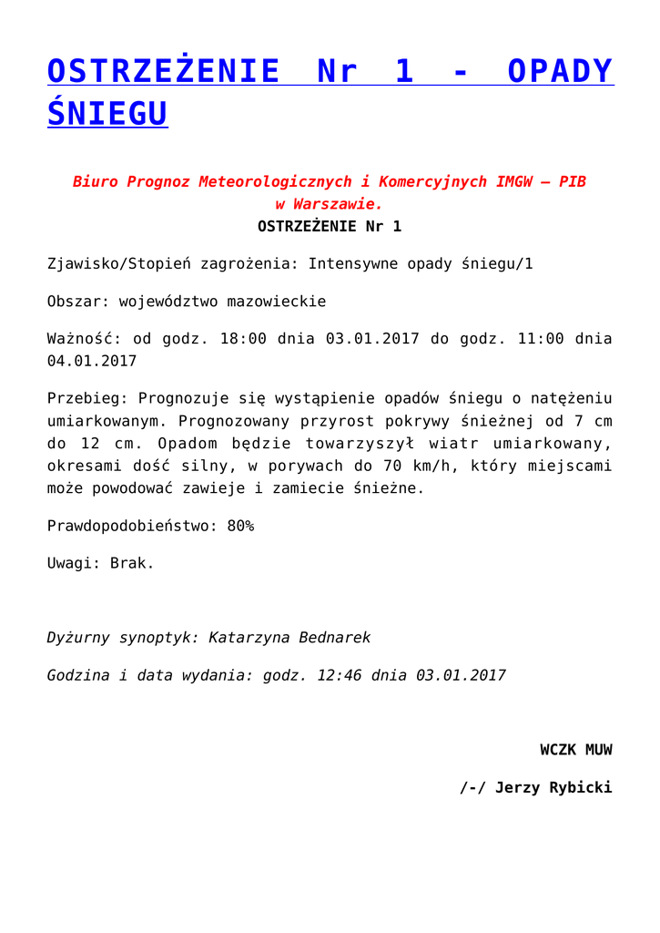 OSTRZEŻENIE ŚNIEGU Nr 1 - OPADY Biuro Prognoz Meteorologicznych i Komercyjnych IMGW – PIB w Warszawie. OSTRZEŻENIE Nr 1 Zjawisko/Stopień zagrożenia: Intensywne opady śniegu/1 Obszar: województwo mazowieckie Ważność: od godz. 18:00 dnia 03.01.2017 do godz. 11:00 dnia 04.01.2017 Przebieg: Prognozuje się wystąpienie opadów śniegu o natężeniu umiarkowanym. Prognozowany przyrost pokrywy śnieżnej od 7 cm do 12 cm. Opadom będzie towarzyszył wiatr umiarkowany, okresami dość silny, w porywach do 70 km/h, który miejscami może powodować zawieje i zamiecie śnieżne. Prawdopodobieństwo: 80% Uwagi: Brak. Dyżurny synoptyk: Katarzyna Bednarek Godzina i data wydania: godz. 12:46 dnia 03.01.2017 WCZK MUW /-/ Jerzy Rybicki