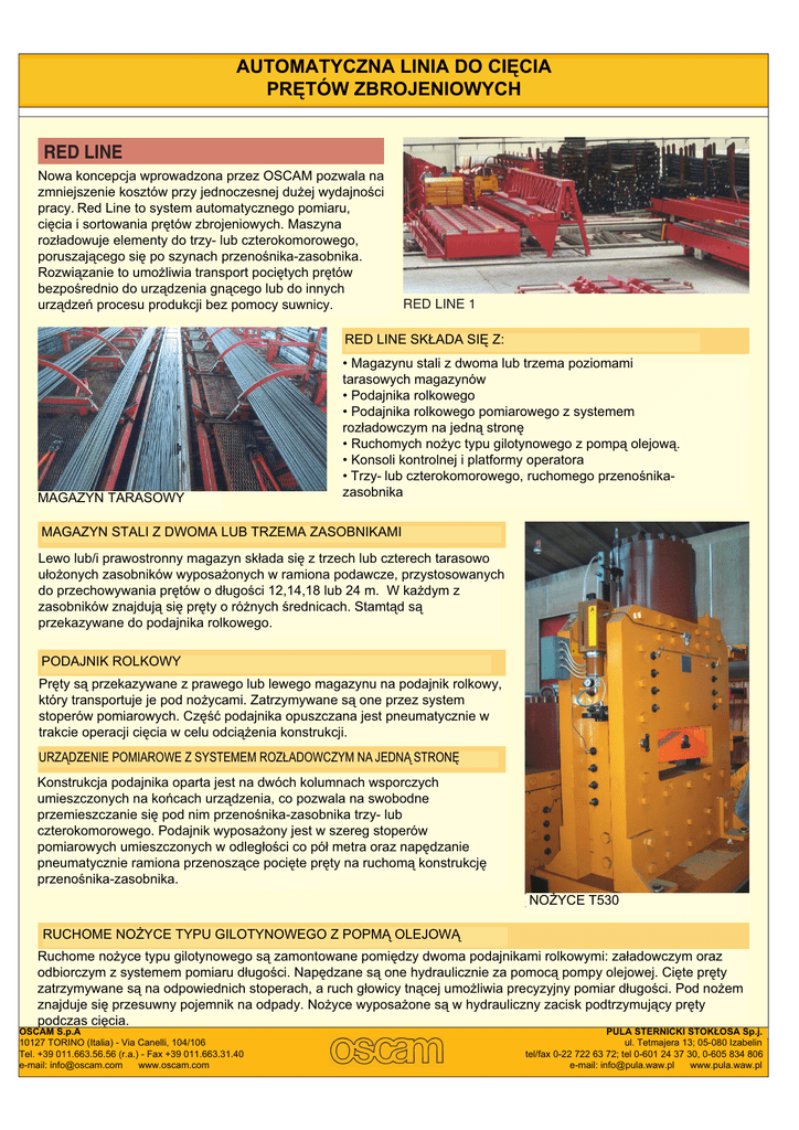 AUTOMATYCZNA LINIA CUTTING DO CIĉCIA AUTOMATED REBAR PRĉTÓW ZBROJENIOWYCH AND BENDING SYSTEM RED LINE Nowa koncepcja wprowadzona przez OSCAM introduce a new concept low OSCAM cost highpozwala output na zmniejszenie kosztów przy jednoczesnej duĪej wydajnoĞci shearing system working from straight lenght rebars with pracy. Redmeasuring Line to system automatycznego pomiaru, automatic and batching of cut lenght reinforciĊcia i sortowania prĊtów zbrojeniowych. Maszyna ced concrete rod. rozáadowuje elementy czterokomorowego, Unlike on floor storagedo redtrzylinelub dowloads the cut rods poruszającego siĊ po szynach przenoĞnika-zasobnika. over 3 or 4 rollers tracks benches movable on rails which Rozwiązanie to umoĪliwia transport pociĊtych prĊtów are able to trasfer the cut rods directly to the bending bezpoĞrednio do urządzenia gnącego lub do innych units or to successive working station without cranes. urządzeĔ procesu produkcji bez pomocy suwnicy. RED LINE 1 RED SKàADA SIĉ Z: REDLINE LINE IS COMPOSED MAGAZYN TARASOWY DROP DOWN BY: • Magazynu stali z dwoma lub trzema poziomami ● Drop down storage area on 2 or 3 levels tarasowych magazynów Powered rolkowego feeding rollers track •●Podajnika •●Podajnika pomiarowego systemem Measuringrolkowego system bridge with one zside dowloading system rozáadowczym na jedną stronĊ ● Movable hydraulic guillotine shear and oil pumping s tation • Ruchomych noĪyc typu gilotynowego z pompą olejową. Controlkontrolnej console incl operators platform and walkway •●Konsoli i platformy operatora •●Trzyluborczterokomorowego, Three four tracks conveyorruchomego traversing przenoĞnikatype zasobnika MAGAZYN STALI Z DWOMA LUB ZASOBNIKAMI DROP DOWN STORAGE AREA ONTRZEMA 2 OR 3 LEVELS Lewo lub/i prawostronny magazyn skáada z trzechby lubtwo czterech tarasowo Left and/or right side storage facilities are siĊ composed or three terraces uáoĪonych zasobników wyposaĪonych w ramiona podawcze, przystosowanych separated each others by fall plates pneumatically operated suitable for bars do przechowywania o dáugoĞci lub 24 m. W of kaĪdym z lenght 12 or 14 or 18prĊtów or 24 meters. On 12,14,18 each terrace bundles different zasobników znajdują siĊ prĊty o róĪnych Ğrednicach. Stamtąd są diameters rods are placed to be shacked down over the central feeding roller przekazywane do podajnika rolkowego. track. PODAJNIK POWERED ROLKOWY FEEDING ROLLERS TRACK PrĊty są przekazywane z prawego magazynu podajnik The rods shaked down from the leftlub or lewego right storage facilityna are moved rolkowy, by the który transportuje je pod noĪycami. Zatrzymywane są one przez system feeding rollers track under the guillotine shear against the measuring stoppers stoperów CzĊĞü opuszczana jest pneumatycznie redy to bepomiarowych. cut.the feeding track podajnika have a tilting sector before of the shear. w trakcie operacji ciĊcia w celu odciąĪenia konstrukcji. URZĄDZENIE POMIAROWE Z SYSTEMEM ROZàADOWCZYM NA JEDNĄ STRONĉ MEASURING SYSTEM BRIDGE WITH ONE SIDE DOWLOADING SYSTEM Konstrukcja podajnika oparta jest na dwóch kolumnach This one piece fabricared structure,comprising tube andwsporczych section is supported umieszczonych na koĔcach urządzenia, co pozwala na swobodne at each end by heavy section posts allowing the passage of the three or four przemieszczanie siĊ podunder nim przenoĞnika-zasobnika trzy- lubstopper flaps tracks rollers conveyors the structure itself. Measuring czterokomorowego. wyposaĪony jest rollers w szereg stoperów every half meter arePodajnik placed on the measuring track and one pneumatipomiarowych umieszczonych w odlegáoĞci co póá metra oraz cally operated dowloading arm drop down the cut rods on thenapĊdzanie of the three or pneumatycznie ramiona przenoszące pociĊte prĊty na ruchomą konstrukcjĊ four tracks rollers conveyors. przenoĞnika-zasobnika. NOĩYCE T530 SHEAR T530 RUCHOME NOĩYCE TYPU GILOTYNOWEGO Z POPMĄ OLEJOWĄ MOVABLE HYDRAULIC GUILLOTINE SHEAR AND OIL PUMPING STATION Ruchome noĪyce typu gilotynowego są is zamontowane pomiĊdzy dwomaroller podajnikami rolkowymi: oraz The movable guillotine hydraulic shear mounted between the feeding track and the bridgezaáadowczym measuring track odbiorczym z systemem pomiaru dáugoĞci. NapĊdzane są one hydraulicznie za pomocą pompy olejowej. CiĊte powered by oil pumping station. The shear is moving over a movable structure to give an incremental lenght to prĊty up to zatrzymywane na flag odpowiednich stoperach, ruch gáowicy umoĪliwia precyzyjny pomiar dáugoĞci. Pod noĪem the half meterssą fixed stoppers. Short cut offa fall down to intnącej a wheeled box for scrapes. The shear is provided with znajduje przesuwny odpady. NoĪyce wyposaĪone są w hydrauliczny zacisk podtrzymujący prĊty automaticsiĊ hydraulic rod pojemnik clamping na system. podczas ciĊcia. OSCAM S.p.A 10127 TORINO (Italia) - Via Canelli, 104/106 Tel. +39 011.663.56.56 (r.a.) - Fax +39 011.663.31.40 e-mail: [email protected] www.oscam.com 5 PULA STERNICKI STOKàOSA Sp.j. ul. Tetmajera 13; 05-080 Izabelin tel/fax 0-22 722 63 72; tel 0-601 24 37 30, 0-605 834 806 e-mail: [email protected] www.pula.waw.pl AUTOMATYCZNY SYSTEM I GIĉCIA AUTOMATED REBARCIĉCIA CUTTING PRĉTÓW ZBROJENIOWYCH AND BENDING SYSTEM KONSOLA KONTROLNA Z PLATFORMĄ OPERATORAPLATFORM CONTROL CONSOLE INCL OPERATORS Konsola umieszczona jest na podwyĪszonej platformie, co sprawia, Located over a lifted platform with stair and walkways near the Īe operator jest w stanie dobrze widzieü i kontrolowaü kaĪdy shear allows a better vision of the whole plant, it is composed by element linii. Elektromechaniczne systemy sterowania wraz z electromechanical components, computers and interface cards komputerem zamkniĊte są w szczelnej szafie sterowniczej. inside a rugged metalic cabinet. W skáad konsoli wchodzą takĪe klawiatura do programowania, On the upper parts of the cabinet