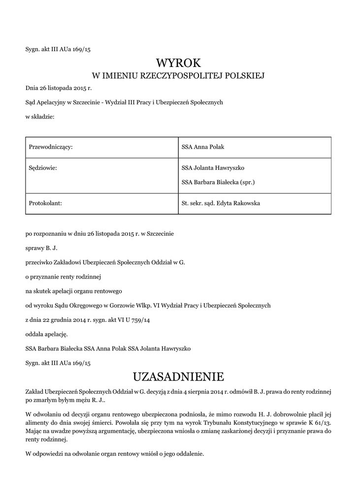 Sygn. akt III AUa 169/15 WYROK W IMIENIU RZECZYPOSPOLITEJ POLSKIEJ Dnia 26 listopada 2015 r. Sąd Apelacyjny w Szczecinie - Wydział III Pracy i Ubezpieczeń Społecznych w składzie: Przewodniczący: SSA Anna Polak Sędziowie: SSA Jolanta Hawryszko SSA Barbara Białecka (spr.) Protokolant: St. sekr. sąd. Edyta Rakowska po rozpoznaniu w dniu 26 listopada 2015 r. w Szczecinie sprawy B. J. przeciwko Zakładowi Ubezpieczeń Społecznych Oddział w G. o przyznanie renty rodzinnej na skutek apelacji organu rentowego od wyroku Sądu Okręgowego w Gorzowie Wlkp. VI Wydział Pracy i Ubezpieczeń Społecznych z dnia 22 grudnia 2014 r. sygn. akt VI U 759/14 oddala apelację. SSA Barbara Białecka SSA Anna Polak SSA Jolanta Hawryszko Sygn. akt III AUa 169/15 UZASADNIENIE Zakład Ubezpieczeń Społecznych Oddział w G. decyzją z dnia 4 sierpnia 2014 r. odmówił B. J. prawa do renty rodzinnej po zmarłym byłym mężu R. J.. W odwołaniu od decyzji organu rentowego ubezpieczona podniosła, że mimo rozwodu H. J. dobrowolnie płacił jej alimenty do dnia swojej śmierci. Powołała się przy tym na wyrok Trybunału Konstytucyjnego w sprawie K 61/13. Mając na uwadze powyższą argumentację, ubezpieczona wniosła o zmianę zaskarżonej decyzji i przyznanie prawa do renty rodzinnej. W odpowiedzi na odwołanie organ rentowy wniósł o jego oddalenie. Sąd Okręgowy w Gorzowie Wielkopolskim VI Wydział Pracy i Ubezpieczeń Społecznych wyrokiem z dnia 22 grudnia 2014 r. zmienił zaskarżoną decyzję organu rentowego w ten sposób, że przyznał B. J. prawo do renty rodzinnej po zmarłym R. J. od dnia 1 czerwca 2014 r. Sąd I Instancji ustalił, że A. i H. S. (winno być: B. i R. J.) zawarli związek małżeński w dniu 9 czerwca 1979 r. Wyrokiem z dnia 17 grudnia 1986 r. związek ten został rozwiązany z winy R. J.. W wyroku nie zasądzono na rzecz B. J. alimentów. Rozstrzygnięto, że B. J. z córkami zamieszka w dwóch pokojach, a R. J. w jednym. Do dnia swojej śmierci R. J. mieszkał z byłą żoną i córkami. Po dwóch latach od rozwodu pogodził się z byłą żoną i wiódł z nią życie jakby byli małżeństwem. Łożył na utrzymanie byłej żony regulując rachunki za mieszkanie i pomagając jej w utrzymaniu w okresach, w których nie pracowała. R. J. zmarł w dniu 16 sierpnia 2012 r. B. J. wówczas nie pracowała i nie miała żadnych dochodów. Pozostawała na utrzymaniu byłego męża, który łożył na jej utrzymanie dobrowolne alimenty. W oparciu o tak poczynione ustalenia faktyczne Sąd Okręgowy uznał, że odwołanie zasługiwało na uwzględnienie i wskazując na treść art. 70 ust. 3 ustawy z dnia 17 grudnia 1998 r. o emeryturach i rentach z Funduszu Ubezpieczeń Społecznych (t.j. opubl. w Dz. U. z 2015 r., poz. 748, ze zm., dalej: ustawa emerytalna). Sąd meriti podniósł, że Trybunał Konstytucyjny w wyroku z dnia 13 maja 2014 r. uznał ten przepis za niezgodny z art. 67 ust. 1 w związku z art. 32 ust. 1 Konstytucji Rzeczypospolitej Polskiej, lecz tylko w zakresie w jakim uprawnienie małżonki rozwiedzionej do uzyskania renty rodzinnej uzależnia od wymogu posiadania w dniu śmierci męża prawa do alimentów z jego strony, ustalonych wyłącznie wyrokiem lub ugodą sądową. W uzasadnieniu tego orzeczenia Trybunał Konstytucyjny podał, że nie każde przekazywanie określonej sumy pieniężnej na rzecz byłego małżonka stanowi realizację obowiązku alimentacyjnego, o którym mowa w art. 60 § 1 k.r.o. i o takim obowiązku można mówić dopiero wówczas, gdy spełnione zostaną przesłanki wskazane w tym przepisie, tj. małżonek uprawniony nie został uznany za wyłącznie winnego rozkładu pożycia małżeńskiego i znalazł się w niedostatku. Z punktu widzenia prawa do renty rodzinnej nie ma przy tym znaczenia, czy wysokość alimentów mieści się w granicach wynikających z art. 60 § 1 k.r.o., a zatem czy odpowiada z jednej strony usprawiedliwionym potrzebom uprawnionego, a z drugiej strony - możliwościom zarobkowym i majątkowym zobowiązanego. Prawo do renty rodzinnej powiązane zostało bowiem w treści kwestionowanego art. 70 ust. 3 ustawy emerytalnej z samym obowiązkiem alimentacyjnym, a nie z zakresem jego realizacji. Sąd Okręgowy dalej podniósł, że nie ma wątpliwości, że obowiązek alimentacyjny wynikający z art. 60 § 1 k.r.o. może być realizowany na warunkach ustalonych samodzielnie przez strony w drodze zgodnego ich porozumienia. W doktrynie prawa podkreśla się bowiem, że niezbędną częścią umowy są oświadczenia woli stron, które mogą być jednak wyrażone przez każde ich zachowanie ujawniające tę wolę w sposób dostateczny. Zachowanie to uzyskuje przymiot oświadczenia woli, jeśli jest ono zrozumiałe, swobodne i złożone w zamiarze wywołania określonych skutków prawnych. W niniejszej zaś sprawie niesporne było, że do rozwodu doszło z winy R. J. i ubezpieczona mogła tym samym uzyskać alimenty, mocą ugody lub wyroku sądowego. Ubezpieczona nie wystąpiła o alimenty, gdyż co najmniej od 1988 roku do dnia swojej śmierci R. J. regulował na jej rzecz alimenty dobrowolnie. Potwierdzają to zeznania świadków i dokumenty, którym Sąd Okręgowy dał wiarę. Wynikało z nich bowiem jednoznacznie, że do dnia śmierci R. J. mieszkał z byłą żoną w lokalu mieszkalnym przy ul. (...) w G.. Do dnia śmierci byłego męża ubezpieczona nie pracowała (ostatnie zatrudnienie ustało w 2001 r.) i nie było możliwości, aby to ona, a nie były mąż, opłacała mieszkanie i otrzymywała środki na swoje utrzymanie. Musiał to robić R. J., który do dnia śmierci uzyskiwał dochody. Sąd Okręgowy tak argumentując na podstawie art. 477 14 § 2 k.p.c. zmienił zaskarżoną decyzję, przyznając ubezpieczonej prawo do renty rodzinnej od dnia 01 czerwca 2014r. Z rozstrzygnięciem Sądu Okręgowego nie zgodził się organ rentowy i zaskarżając go w całości, zarzucił: 1. błąd w ustaleniach faktycznych pole