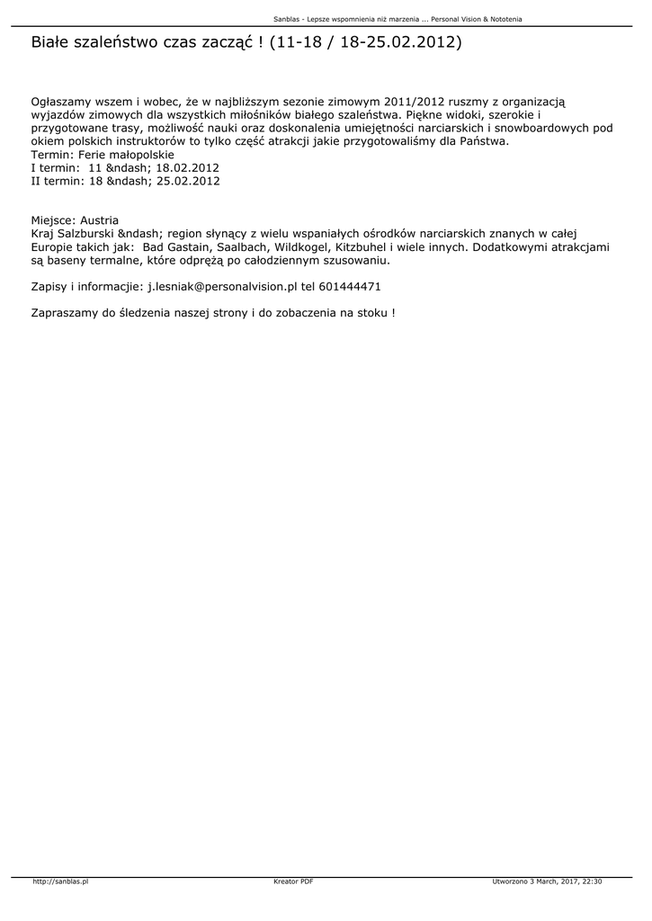 Sanblas - Lepsze wspomnienia niż marzenia ... Personal Vision & Nototenia Białe szaleństwo czas zacząć ! (11-18 / 18-25.02.2012) Ogłaszamy wszem i wobec, że w najbliższym sezonie zimowym 2011/2012 ruszmy z organizacją wyjazdów zimowych dla wszystkich miłośników białego szaleństwa. Piękne widoki, szerokie i przygotowane trasy, możliwość nauki oraz doskonalenia umiejętności narciarskich i snowboardowych pod okiem polskich instruktorów to tylko część atrakcji jakie przygotowaliśmy dla Państwa. Termin: Ferie małopolskie I termin: 11 – 18.02.2012 II termin: 18 – 25.02.2012 Miejsce: Austria Kraj Salzburski – region słynący z wielu wspaniałych ośrodków narciarskich znanych w całej Europie takich jak: Bad Gastain, Saalbach, Wildkogel, Kitzbuhel i wiele innych. Dodatkowymi atrakcjami są baseny termalne, które odprężą po całodziennym szusowaniu. Zapisy i informacjie: [email protected] tel 601444471 Zapraszamy do śledzenia naszej strony i do zobaczenia na stoku ! http://sanblas.pl Kreator PDF Utworzono 3 March, 2017, 22:30