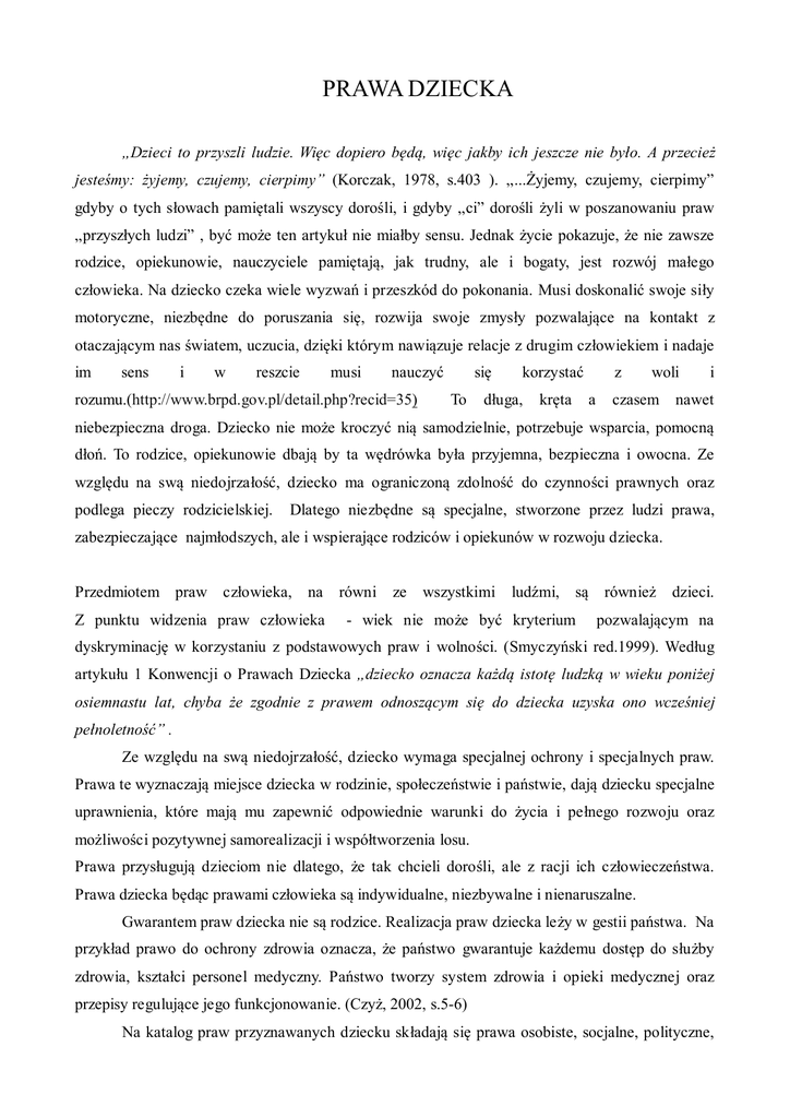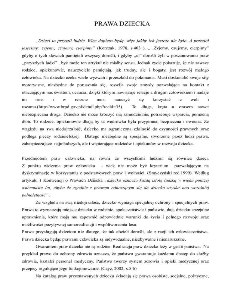 PRAWA DZIECKA „Dzieci to przyszli ludzie. Więc dopiero będą, więc jakby ich jeszcze nie było. A przecież jesteśmy: żyjemy, czujemy, cierpimy” (Korczak, 1978, s.403 ). „...Żyjemy, czujemy, cierpimy” gdyby o tych słowach pamiętali wszyscy dorośli, i gdyby „ci” dorośli żyli w poszanowaniu praw „przyszłych ludzi” , być może ten artykuł nie miałby sensu. Jednak życie pokazuje, że nie zawsze rodzice, opiekunowie, nauczyciele pamiętają, jak trudny, ale i bogaty, jest rozwój małego człowieka. Na dziecko czeka wiele wyzwań i przeszkód do pokonania. Musi doskonalić swoje siły motoryczne, niezbędne do poruszania się, rozwija swoje zmysły pozwalające na kontakt z otaczającym nas światem, uczucia, dzięki którym nawiązuje relacje z drugim człowiekiem i nadaje im sens i w reszcie musi nauczyć rozumu.(http://www.brpd.gov.pl/detail.php?recid=35) się To korzystać długa, kręta z a woli czasem i nawet niebezpieczna droga. Dziecko nie może kroczyć nią samodzielnie, potrzebuje wsparcia, pomocną dłoń. To rodzice, opiekunowie dbają by ta wędrówka była przyjemna, bezpieczna i owocna. Ze względu na swą niedojrzałość, dziecko ma ograniczoną zdolność do czynności prawnych oraz podlega pieczy rodzicielskiej. Dlatego niezbędne są specjalne, stworzone przez ludzi prawa, zabezpieczające najmłodszych, ale i wspierające rodziców i opiekunów w rozwoju dziecka. Przedmiotem praw człowieka, na Z punktu widzenia praw człowieka równi ze wszystkimi ludźmi, są - wiek nie może być kryterium również dzieci. pozwalającym na dyskryminację w korzystaniu z podstawowych praw i wolności. (Smyczyński red.1999). Według artykułu 1 Konwencji o Prawach Dziecka „dziecko oznacza każdą istotę ludzką w wieku poniżej osiemnastu lat, chyba że zgodnie z prawem odnoszącym się do dziecka uzyska ono wcześniej pełnoletność” . Ze względu na swą niedojrzałość, dziecko wymaga specjalnej ochrony i specjalnych praw. Prawa te wyznaczają miejsce dziecka w rodzinie, społeczeństwie i państwie, dają dziecku specjalne uprawnienia, które mają mu zapewnić odpowiednie warunki do życia i pełnego rozwoju oraz możliwości pozytywnej samorealizacji i współtworzenia losu. Prawa przysługują dzieciom nie dlatego, że tak chcieli dorośli, ale z racji ich człowieczeństwa. Prawa dziecka będąc prawami człowieka są indywidualne, niezbywalne i nienaruszalne. Gwarantem praw dziecka nie są rodzice. Realizacja praw dziecka leży w gestii państwa. Na przykład prawo do ochrony zdrowia oznacza, że państwo gwarantuje każdemu dostęp do służby zdrowia, kształci personel medyczny. Państwo tworzy system zdrowia i opieki medycznej oraz przepisy regulujące jego funkcjonowanie. (Czyż, 2002, s.5-6) Na katalog praw przyznawanych dziecku składają się prawa osobiste, socjalne, polityczne, kulturalne. Prawa i wolności osobiste: • prawo do życia i rozwoju, • prawo do tożsamości i identyczności, • prawo do swobody myśli, sumienia i wyznania, • prawo do wyrażania własnych poglądów i występowania w sprawach dziecka dotyczących, w postępowaniu administracyjnym i sądowym, • prawo do wychowywania w rodzinie i kontaktów z rodzicami w przypadku rozłączenia z nimi, • prawo do wolności od przemocy fizycznej lub psychicznej, wyzysku, nadużyć seksualnych i wszelkiego okrucieństwa, • prawo nierekrutowania do wojska poniżej 15 roku życia. Prawa socjalne: • prawo do odpowiedniego standardu życia, • prawo do ochrony życia, • prawo do zabezpieczenia socjalnego, • prawo do wypoczynku i czasu wolnego. Prawa kulturalne: • prawo do nauki, • prawo do korzystania z dóbr kultury, • prawo do informacji, • prawo do znajomości swoich praw. Prawa polityczne: • prawo stowarzyszania się i zgromadzeń w celach pokojowych. (Szymańczak „Konwencja o Prawach Dziecka ONZ) .http://biurose.sejm.gov.pl/teksty/i_684.htm Nie przyznano dzieciom praw ekonomicznych pozostawiając je pod opieką prawną dorosłych. Prawa dziecka w tej kategorii koncentrują się na tym, aby dziecko nie było ofiarą wyzysku ekonomicznego. Większość badaczy tego tematu (np. E. Czyż, M. Balcerek, A. Łopatka) nie utożsamia praw dziecka z jego podstawowymi potrzebami emocjonalnymi. Jednak współcześni psychoterapeuci sformułowali emocjonalne prawa dziecka, których respektowanie jest niezbędnym warunkiem harmonijnego rozwoju. Dotyczą one okresu: od poczęcia do 3-4 roku życia dziecka. Należą do nich: • prawo do istnienia, którego istotą jest doświadczanie akceptacji istnienia w wymiarze energetycznym i fizycznym, • prawo do posiadania i zaspokajania potrzeb emocjonalnych, • prawo do autonomii emocjonalnej, które polega na umożliwieniu dziecku przeżywania własnych emocji bez natrętnego przenikania jego myśli i uczuć, • prawo do wolności dążeń – przejawia się uznaniem jego prawa do zaprzeczeń, nieignorowaniem prawa do protestu, ale w ramach pewnych granic, prawo miłości i seksualności - to utwierdzenie go w przekonaniu, że jest akceptowane zarówno w swej miłości, czystości uczuć, jak i w swojej seksualności. (Bińczycka, 1993, s. 133-141) „Katalog praw dziecka nie jest niczym innym jak wzorcem potrzeb dziecka, potrzeb, które powinny być zaspokajane przez dorosłych dla dobra dziecka i w interesie społecznym. Prawa są ustawowym potwierdzeniem tych potrzeb, a więc przyjęciem przez dorosłe społeczeństwo na siebie obowiązków zapewnienia tych potrzeb”. (Balcerek, 1986, s. 26) Prawa dziecka – rys historyczny. Krzywdzenie dzieci naznaczone okrucieństwem - dzieciobójstwo, porzucenie, obojętność towarzyszyło ludzkości przez cały czas jej istnienia. Ówcześni obserwatorzy zdarzeń traktowali je jako oczywistość aprobowaną przez obowiązujące normy religijne, obyczajowe i kulturowe a sankcjonowane przez normy prawne. Pamiętnikarze nie uskarżali się na bicie i surowość wych