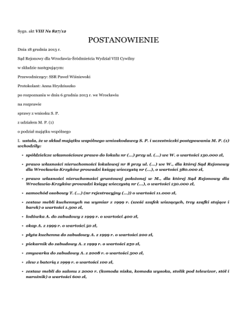 Sygn. akt VIII Ns 827/12 POSTANOWIENIE Dnia 18 grudnia 2013 r. Sąd Rejonowy dla Wrocławia-Śródmieścia Wydział VIII Cywilny w składzie następującym: Przewodniczący: SSR Paweł Wiśniewski Protokolant: Anna Hrydziuszko po rozpoznaniu w dniu 6 grudnia 2013 r. we Wrocławiu na rozprawie sprawy z wniosku S. P. z udziałem M. P. (1) o podział majątku wspólnego I. ustala, że w skład majątku wspólnego wnioskodawcy S. P. i uczestniczki postępowania M. P. (1) wchodziły: • spółdzielcze własnościowe prawo do lokalu nr (...) przy ul. (...) we W. o wartości 130.000 zł, • prawo własności nieruchomości lokalowej nr 8 przy ul. (...) we W., dla której Sąd Rejonowy dla Wrocławia-Krzyków prowadzi księgę wieczystą nr (...), o wartości 380.000 zł, • prawo własności nieruchomości gruntowej położonej w M., dla której Sąd Rejonowy dla Wrocławia-Krzyków prowadzi księgę wieczystą nr (...), o wartości 130.000 zł, • samochód osobowy T. (...) (nr rejestracyjny (...)) o wartości 11.000 zł, • zestaw mebli kuchennych na wymiar z 1999 r. (sześć szafek wiszących, trzy szafki stojące i barek) o wartości 1.500 zł, • lodówka A. do zabudowy z 1999 r. o wartości 400 zł, • okap A. z 1999 r. o wartości 50 zł, • płyta kuchenna do zabudowy A. z 1999 r. o wartości 200 zł, • piekarnik do zabudowy A. z 1999 r. o wartości 250 zł, • zmywarka do zabudowy A. z 2008 r. o wartości 500 zł, • zlew z baterią z 1999 r. o wartości 100 zł, • zestaw mebli do salonu z 2000 r. (komoda niska, komoda wysoka, stolik pod telewizor, stół i narożnik) o wartości 600 zł, • zestaw mebli do sypialni z 2008 r. (łóżko, dwie szafy nocne, komoda z szufladami i komoda wąska) o wartości 1.200 zł, • zestaw mebli dziecięcych z 2008 r. (szafa, regał, komoda, biurko, krzesło, szafka i łóżko piętrowe) o wartości 1.500 zł, • pralka E. z 2009 r. o wartości 500 zł, • wieża stereo P. z 2000 r. o wartości 200 zł, • odtwarzacz DVD P. z 2000 r. o wartości 200 zł, • zestaw komputerowy z 2005 r. (komputer, monitor, klawiatura, myszka i głośniki) o wartości 400 zł, • szafa do zabudowy z lustrami o wartości 1.200 zł, • telewizor LG z 2009 r. o wartości 1.000 zł, • telewizor P. z 2001 r. bez wartości rynkowej, • pralka W. z 2007 r. o wartości 300 zł, • dwie szafki kuchenne wiszące o wartości 100 zł, • kuchenka A. z 2006 r. o wartości 100 zł, • kuchenka mikrofalowa P. z 2004 r. o wartości 200 zł, • magnetowid P. z 2000 r. o wartości 200 zł, • sofa rozkładana z 2005 r. o wartości 100 zł, • wierzytelności z rachunku bankowego uczestniczki postępowania w Bank (...) S.A. (nr (...)) w wysokości 676,05 zł oraz z czterech lokat w łącznej wysokości 12.495,18 zł, • wierzytelności z rachunku bankowego wnioskodawcy w Bank (...) S.A. (nr (...)) w wysokości 3.775,24 zł oraz z sześciu lokat w łącznej wysokości 14.656,70 zł; II. ustala, że udziały wnioskodawcy i uczestniczki postępowania w majątku wspólnym są równe; III. dokonuje podziału majątku wspólnego w ten sposób, że: • wnioskodawcy przyznaje prawo własności nieruchomości lokalowej nr 8 przy ul. (...) we W., zestaw mebli kuchennych na wymiar, lodówkę A., okap A., płytę kuchenną A., piekarnik A., zmywarkę do zabudowy A., zlew z baterią, zestaw mebli do salonu, zestaw mebli do sypialni, zestaw mebli dziecięcych, pralkę E., wieżę stereo P., odtwarzacz DVD P., zestaw komputerowy, szafę do zabudowy z lustrami, telewizor LG, telewizor P. oraz wierzytelności z rachunku bankowego i lokat wnioskodawcy w Bank (...) S.A., o łącznej wartości 408.231,94 zł; • uczestniczce postępowania przyznaje spółdzielcze własnościowe prawo do lokalu nr (...) przy ul. (...) we W., prawo własności nieruchomości gruntowej położonej w M., samochód osobowy T. (...), pralkę W., dwie szafki kuchenne wiszące, kuchenkę A., kuchenkę mikrofalową P., magnetowid P., sofę rozkładaną oraz wierzytelności z rachunku bankowego i lokat uczestniczki postępowania w Bank (...) S.A., o łącznej wartości 285.171,23 zł; • zasądza od wnioskodawcy na rzecz uczestniczki postępowania kwotę 61.530,36 zł (sześćdziesiąt jeden tysięcy pięćset trzydzieści złotych i trzydzieści sześć groszy) tytułem dopłaty do udziału w majątku wspólnym, płatną w terminie sześciu miesięcy od uprawomocnienia się postanowienia wraz z odsetkami ustawowymi w razie opóźnienia w zapłacie. Sygn. akt VIII Ns 827/12 UZASADNIENIE Wnioskodawca S. P. złożył wniosek o dokonanie podziału majątku jego i byłej żony M. P. (1), wnosząc o ustalenie, że udziały w majątku wspólnym są nierówne, przy czym udział wnioskodawcy wynosi 80 %, a udział uczestniczki postępowania wynosi 20 %. Wniósł o przyznanie mu spółdzielczego własnościowego prawa do lokalu nr (...) przy ul. (...) we W. oraz prawa własności nieruchomości lokalowej nr 8 przy ul. (...) we W., a uczestniczce postępowania przyznanie pozostałych wymienionych przez niego składników majątkowych, tj. prawa własności nieruchomości gruntowej położonej w M., samochodu osobowego T. (...) oraz środków na rachunku bankowym w Banku (...) S.A. Uzasadniając żądanie ustalenia nierównych udziałów, podał, że spółdzielcze własnościowe prawo do lokalu nr (...) przy ul. (...) we W. oraz prawo własności nieruchomości lokalowej nr 8 przy ul. (...) we W., należały do jego majątku osobistego, a w trakcie trwania związku małżeńskiego uczestniczka postępowania wielokrotnie namawiała go do rozszerzenia wspólności ustawowej o wymienione składniki majątkowe. Podniósł, że w 2009 roku - kierując się swoją miłości oraz zapewnieniami małżonki o silnym uczuciu - postanowił rozszerzyć małżeńską wspólność ustawową o opisane prawa, lecz wkrótce uczestniczka postępowania zmieniła swoją postawę wobec niego, unikając go i dystansując się od nieg
