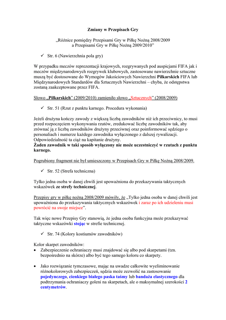 Zmiany w Przepisach Gry „Różnice pomiędzy Przepisami Gry w Piłkę Nożną 2008/2009 a Przepisami Gry w Piłkę Nożną 2009/2010” 9 Str. 6 (Nawierzchnia pola gry) W przypadku meczów reprezentacji krajowych, rozgrywanych pod auspicjami FIFA jak i meczów międzynarodowych rozgrywek klubowych, zastosowane nawierzchnie sztuczne muszą być dostosowane do Wymogów Jakościowych Nawierzchni Piłkarskich FIFA lub Międzynarodowych Standardów dla Sztucznych Nawierzchni – chyba, że odstępstwa zostaną zaakceptowane przez FIFA. Słowo „Piłkarskich” (2009/2010) zamieniło słowo „Sztucznych” (2008/2009) 9 Str. 51 (Rzut z punktu karnego. Procedura wykonania) Jeżeli drużyna kończy zawody z większą liczbą zawodników niż ich przeciwnicy, to musi przed rozpoczęciem wykonywania rzutów, zredukować liczbę zawodników tak, aby zrównać ją z liczbą zawodników drużyny przeciwnej oraz poinformować sędziego o personaliach i numerze każdego zawodnika wyłączonego z dalszej rywalizacji. Odpowiedzialność ta ciąż na kapitanie drużyny. Żaden zawodnik w taki sposób wyłączony nie może uczestniczyć w rzutach z punktu karnego. Pogrubiony fragment nie był umieszczony w Przepisach Gry w Piłkę Nożną 2008/2009. 9 Str. 52 (Strefa techniczna) Tylko jedna osoba w danej chwili jest upoważniona do przekazywania taktycznych wskazówek ze strefy technicznej. Przepisy gry w piłkę nożną 2008/2009 mówiły, że „Tylko jedna osoba w danej chwili jest upoważniona do przekazywania taktycznych wskazówek i zaraz po ich udzieleniu musi powrócić na swoje miejsce”. Tak więc nowe Przepisy Gry stanowią, że jedna osoba funkcyjna może przekazywać taktyczne wskazówki stojąc w strefie technicznej. 9 Str. 74 (Kolory kostiumów zawodników) Kolor skarpet zawodników: • Zabezpieczenie ochraniaczy musi znajdować się albo pod skarpetami (tzn. bezpośrednio na skórze) albo być tego samego koloru co skarpety. • Jako rozwiązanie tymczasowe, mając na uwadze całkowite wyeliminowanie różnokolorowych zabezpieczeń, sędzia może zezwolić na zastosowanie pojedynczego, cienkiego białego paska taśmy lub bandaża elastycznego dla podtrzymania ochraniaczy goleni na skarpetach, ale o maksymalnej szerokości 2 centymetrów. Powyżej wymieniony przepis nie był umieszczony w Przepisach Gry w Piłę Nożną 2008/2009. 9 Str. 128 (Naruszenie przepisu) Każdy zawodnik drużyny broniącej opuszczający pole gry z jakiegokolwiek powodu, bez zgody sędziego, będzie uważany za znajdującego się na własnej linii bramkowej lub linii bocznej w celu oceny spalonego, aż do najbliższej przerwy w grze. Jeśli ten zawodnik rozmyślnie opuszcza pole gry musi on zostać napomniany podczas najbliższej przerwy w grze. Powyżej wymieniony przepis zamienił 2 akapit na str. 127 w starych Przepisach Gry (2008/2009). 9 Str. 177 (Obowiązki w czasie zawodów): Nawiązanie kontaktu wzrokowego z sędzią, który na około 2 minuty przed upływem ustalonego czasu gry lub ewentualnych dogrywek, przekazuje za pomocą umówionych gestów czas, jaki zostanie dodany do czasu gry. Sędzia techniczny, tuż przed upływem ustalonego czasu gry połowy zawodów, to jest w 44 minucie i około 55 sekundzie, informuje zawodników i publiczność, za pomocą tablicy wymiany zawodników, o ile minut sędzia przedłużył daną część zawodów. Sędzia techniczny unosi oburącz tablicę ponad głową i pokazuje ją we wszystkich kierunkach (na wprost pola gry i w obu kierunkach pod kątem 45 do pola gry), przetrzymując ją w każdym położeniu przez około 5 sekund. W starych Przepisach Gry (2008/2009) brakowało słowa „około”. Pogrubioną czcionką oznaczono zmiany w Przepisach gry w piłkę nożną 2009/2010. Kolorem czerwonym oznaczono nieaktualne zapisy ze starych przepisów. Kolorem niebieskim oznaczono ważne wskazówki. Opracował: Kornel Paszkiewicz