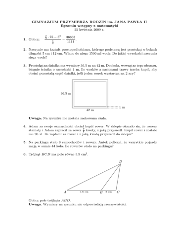 GIMNAZJUM PRZYMIERZA RODZIN im. JANA PAWŁA II Egzamin wstępny z matematyki 25 kwietnia 2009 r. 1. Oblicz: 2 3 · 75 − 52 1 2 − 36663 . 1111 2. Naczynie ma kształt prostopadłościanu, którego podstawą jest prostokąt o bokach długości 5 cm i 12 cm. Wlano do niego 1500 ml wody. Do jakiej wysokości naczynia sięga woda? 3. Prostokątna działka ma wymiary 36,5 m na 42 m. Dookoła, wewnątrz tego obszaru, biegnie ścieżka o szerokości 1 m. Ile worków z nasionami trawy trzeba kupić, aby obsiać pozostałą część działki, jeśli jeden worek wystarcza na 2 ary? 36,5 m 1m 42 m Uwaga. Na rysunku nie została zachowana skala. 4. Adam za swoje oszczędności chciał kupić rower. W sklepie okazało się, że rowery staniały i Adam zapłacił za rower 78 kwoty, z jaką przyszedł. Kupił rower i zostało mu 95 zł. Ile zapłacił za rower i z jaką kwotą przyszedł do sklepu? 5. Na parkingu stało 8 samochodów i rowery. Antek policzył, że wszystkie pojazdy mają w sumie 44 koła. Ile rowerów stało na parkingu? 6. Trójkąt BCD ma pole równe 3,9 cm2 . D A 4,6 cm B 2 cm C Oblicz pole trójkąta ABD. Uwaga. Wymiary na rysunku nie odpowiadają rzeczywistości. 7. Pociąg do Krakowa wyjechał z Warszawy o godzinie 630 , a w Krakowie był o godzinie 915 . Pociąg jechał ze średnią prędkością 108 km/h. Jaka jest odległość z Warszawy do Krakowa? 8. Wojtek, Beata i Ela jedli obiad w barze. Wojtek za zupę pomidorową i naleśniki z serem zapłacił 10 zł, Beata za zupę pomidorową i knedle zapłaciła 12,20 zł, a Ela za dwie porcje naleśników zapłaciła 12,40 zł. Ile kosztowały knedle? 9. O liczbie n wiadomo, że: a) gdyby była o 2 mniejsza, to dzieliłaby się bez reszty przez 11 oraz b) gdyby była o 2 większa, to dzieliłaby się bez reszty przez 9. Jest wiele takich liczb n. Na przykład liczba 11068 ma te dwie własności. Znajdź dwie najmniejsze takie liczby. 10. W matematyce drzewem nazywamy figurę złożoną z grubych kropek i łączących je kresek, taką jak na lewym rysunku: Nie jest natomiast drzewem figura na prawym rysunku, bo można po niej poruszać się po kreskach „w kółko” – popatrz na kwadrat z jej lewej strony. Oto rysunki wszystkich drzew składających się z 7 kropek i 6 kresek: Jest ich 11. Spróbuj narysować tyle, ile potrafisz, drzew składających się z 8 kropek i 7 kresek (są 23 różne takie drzewa). Życzymy powodzenia!