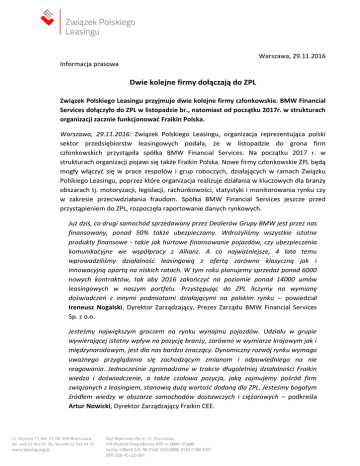 Warszawa, 29.11.2016 Informacja prasowa Dwie kolejne firmy dołączają do ZPL Związek Polskiego Leasingu przyjmuje dwie kolejne firmy członkowskie. BMW Financial Services dołączyło do ZPL w listopadzie br., natomiast od początku 2017r. w strukturach organizacji zacznie funkcjonować Fraikin Polska. Warszawa, 29.11.2016: Związek Polskiego Leasingu, organizacja reprezentująca polski sektor przedsiębiorstw leasingowych podała, że w listopadzie do grona firm członkowskich przystąpiła spółka BMW Financial Services. Na początku 2017 r. w strukturach organizacji pojawi się także Fraikin Polska. Nowe firmy członkowskie ZPL będą mogły włączyć się w prace zespołów i grup roboczych, działających w ramach Związku Polskiego Leasingu, poprzez które organizacja realizuje działania w kluczowych dla branży obszarach tj. motoryzacji, legislacji, rachunkowości, statystyki i monitorowania rynku czy w zakresie przeciwdziałania fraudom. Spółka BMW Financial Services jeszcze przed przystąpieniem do ZPL, rozpoczęła raportowanie danych rynkowych. Już dziś, co drugi samochód sprzedawany przez Dealerów Grupy BMW jest przez nas finansowany, ponad 50% także ubezpieczamy. Wdrożyliśmy wszystkie istotne produkty finansowe - takie jak hurtowe finansowanie pojazdów, czy ubezpieczenia komunikacyjne we współpracy z Allianz. A co najważniejsze, 4 lata temu wprowadziliśmy działalność leasingową z ofertą zarówno klasyczną jak i innowacyjną opartą na niskich ratach. W tym roku planujemy sprzedaż ponad 6000 nowych kontraktów, tak aby 2016 zakończyć na poziomie ponad 14000 umów leasingowych w naszym portfelu. Przystępując do ZPL liczymy na wymianę doświadczeń z innymi podmiotami działającymi na polskim rynku – powiedział Ireneusz Nogalski, Dyrektor Zarządzający, Prezes Zarządu BMW Financial Services Sp. z o.o. Jesteśmy największym graczem na rynku wynajmu pojazdów. Udziału w grupie wywierającej istotny wpływ na pozycję branży, zarówno w wymiarze krajowym jak i międzynarodowym, jest dla nas bardzo znaczący. Dynamiczny rozwój rynku wymaga uważnego przyglądania się zachodzącym zmianom i odpowiedniego na nie reagowania. Jednocześnie zgromadzone w trakcie długoletniej działalności Fraikin wiedza i doświadczenie, a także czołowa pozycja, jaką zajmujemy pośród firm związanych z leasingiem, stanowią dużą wartość dodaną dla ZPL. Jesteśmy bogatym źródłem wiedzy w obszarze samochodów dostawczych i ciężarowych – podkreśla Artur Nowicki, Dyrektor Zarządzający Fraikin CEE. Bardzo się cieszymy, że nasze grono powiększa się o kolejne znaczące na rynku firmy oferujące innowacyjne produkty w zakresie leasingu i wynajmu, wzbogacone kompleksową usługą zarządzania pojazdami. Mamy nadzieję, że możliwość korzystania z profesjonalizmu i bogatego doświadczenia zawodowego naszych nowych członków, pozytywnie wpłynie na dalszy dynamiczny rozwój polskiego rynku leasingu, jak również wzmocni Związek w działaniach na rzecz zapewnienia bezpieczeństwa w obrocie gospodarczym zrzeszonych firm członkowskich i ich klientów – powiedział Andrzej Sugajski, Dyrektor Generalny Związku Polskiego Leasingu. BMW Financial Services oferuje klientom w Polsce leasing, kredyty i ubezpieczenia komunikacyjne oraz GAP. Klienci mogą je otrzymać za pośrednictwem sieci autoryzowanych salonów dealerskich BMW, MINI i BMW Motorrad. Firma zatrudnia obecnie 46 osób. BMW Group Financial Services powstała w 1971 roku i jest obecnie jedną z wiodących firm finansowych dedykowanych branży motoryzacyjnej. Na wybranych rynkach usługi świadczone są przez wyselekcjonowanych partnerów zarówno finansowych, jak i ubezpieczeniowych. W oddziałach zlokalizowanych w 57 krajach na całym świecie pracuje 8 000 osób, które świadczą usługi dla 4,1 miliona klientów. W 2015 roku zysk przed opodatkowaniem BMW Group Financial Services wyniósł 1,97 miliarda euro, co stanowiło ponad jedną piątą całkowitego zysku przed opodatkowaniem BMW Group (9,22 mld euro). Fraikin Polska dostarcza sprzęt i usługi firmom i instytucjom, korzystającym z pojazdów użytkowych w codziennej działalności. Usługi te są częścią nowoczesnych rozwiązań zarządzania, które firma oferuje wszystkim użytkownikom pojazdów: od właścicieli jednej ciężarówki do przedsiębiorstw dysponujących całymi flotami. Grupę Fraikin łączy wspólna, głęboko zakorzeniona kultura pracy, wynikająca z ponad 70-letniego doświadczenia w zaspokajaniu potrzeb ogromnej rzeszy klientów – firm i instytucji różnej wielkości, działających na różnych polach i znajdujących się na różnych etapach rozwoju. W ramach oferty dostępne są niemal wszystkie rodzaje nadwozi takie jak furgony zintegrowane i do zabudowy, pojazdy kurtynowe, chłodnie, ciężarówki z opuszczanymi bokami i platformą załadunkową oraz wiele innych pojazdów specjalistycznych. Więcej informacji o firmie Fraikin Polska na stronie: www.fraikin.pl Związek Polskiego Leasingu (ZPL) to organizacja reprezentująca polski sektor przedsiębiorstw leasingowych, która zrzesza 30 firm leasingowych oraz Polski Związek Wynajmu i Leasingu Pojazdów. ZPL jest członkiem Leaseurope - organizacji zrzeszającej 47 związków z 34 krajów Europy. ZPL uczestniczy w pracach grup i zespołów roboczych przygotowujących i opiniujących projekty regulacji prawnych dotyczących branży leasingowej. Przedstawiciele ZPL utrzymują bieżące kontakty z przedstawicielami administracji publicznej i parlamentarzystami. Dodatkowe informacje: Anna Polak Związek Polskiego Leasingu T (22 ) 542 41 39 [email protected] 2