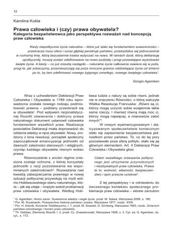 12 Karolina Kukla Prawa człowieka i (czy) prawa obywatela? Kategoria bezpaństwowca jako perspektywa rozważań nad koncepcją praw człowieka Kiedy niepolityczne życie naturalne – które już stało się fundamentem suwerenności – przekracza mury oikos i coraz głębiej penetruje państwo, przekształca się jednocześnie w ruchomą linię, którą bezustannie trzeba wytyczać na nowo. W ramach dzoē, którą deklarację upolityczniły, muszą zostać zdefiniowane na nowo podziały i progi pozwalające wyizolować święte życie. A kiedy – co już zresztą nastąpiło – naturalne życie całkowicie zawiera się w polis, progi te, jak zobaczymy, przemieszczają się poza mroczne granice oddzielające życie od śmierci po to, by tam zdefiniować nowego żyjącego umarłego, nowego świętego człowieka1. Giorgio Agamben Wraz z uchwaleniem Deklaracji Praw Człowieka i Obywatela w 1789 roku wprowadzona została nowego rodzaju podmiotowość prawna – poddany przeobraził się w obywatela2. Pod wpływem racjonalistycznej filozofii oświecenia i doktryny prawa naturalnego dokument ustanowił człowieka fundamentem wszelkich praw. Realizacja postulatów Deklaracji miała doprowadzić do oddania władzy w ręce obywateli. Nowy, zrodzony z łona rewolucji, porządek społeczny zapoczątkował emancypację jednostki od dawnych zależności stanowych i religijnych, czyniąc każdego obywatela równym wobec prawa. Równocześnie z ancien régime zniesiona zostaje ochrona, z której korzystały jednostki z racji pozostawania we wspomnianych zależnościach3. Rozważania nad kwestią zabezpieczenia prawnego w nowej sytuacji politycznej przywołują na myśl widmo Hobbesowskiego stanu naturalnego, które – jak się zdaje – krążyło wokół proklamacji praw człowieka i obywatela. Według Hob- besa ludzie z natury są sobie równi, jednak nie w znaczeniu Równości, o którą walczyła Wielka Rewolucja Francuska: „Równi są ci, którzy mogą uczynić sobie wzajemnie takie same rzeczy. I również równą mają moc ci, którzy mogą najwięcej, a mianowicie zabić innych”4. W nowym wyemancypowanym i zlaicyzowanym społeczeństwie koniecznym stało się zapewnienie bezpieczeństwa jednostkom przez państwo. To, co do tej pory pozostawało poza sferą polityki, stało się jej głównym elementem. Art. II Deklaracji Praw Człowieka i Obywatela głosi: Celem wszelkiego zrzeszenia politycznego jest utrzymanie przyrodzonych i niezbywalnych praw człowieka. Prawa te to: wolność, własność, bezpieczeństwo i opór przeciw uciskowi5. Z tej perspektywy i w odniesieniu do ówczesnego kontekstu społecznego proklamacja praw człowieka – wbrew zarzutom G. Agamben, Homo sacer. Suwerenna władza i nagie życie, przeł. M. Salwa, Warszawa 2008, s. 180. Por. M. Sczaniecki, Powszechna historia państwa i prawa, Warszawa 1977, rozdz. XXIII. 3 Por. H. Arendt, Korzenie Totalitaryzmu, t. 1, przeł. M. Szawiel, D. Grinberg, Warszawa 1993, rozdz. Zmierzch państwa narodowego i koniec praw człowieka. 4 Th. Hobbes, Elementy filozofii, t. 2, przeł. Cz. Znawierowski, Warszawa 1956, s. 3. Cyt. za: G. Agamben, dz. cyt., s. 172. 1 2 13 Prawa człowieka i (czy) prawa obywatela? myślicieli konserwatywnych, głównie Burke`a i de Maistre`a – jawi się jako wyjątkowo przemyślany projekt. Wprowadzenie postulatu zabezpieczenia wolnej jednostki jest wynikiem antycypacji stanu, który zapewne pojawiłby się bez ograniczenia wolności, czyli bez ochrony obywatela. Stan ten wyłonił się wraz z kategorią bezpaństwowca w XX w., gdy wielkie zbiorowości ludzkie zostały pozbawione ochrony prawnej. I. Paradoks praw człowieka w ujęciu Hanny Arendt Tytuł jednego z rozdziałów Korzeni Totalitaryzmu Hanny Arendt brzmi Zmierzch państw narodowych i koniec praw człowieka. Niemiecka filozofka analizuje w nim położenie bezpaństwowców z perspektywy koncepcji praw człowieka. Wraz z drastycznymi zmianami na mapie Europy z pierwszej połowy XX w. masowo pojawiający się uchodźcy i apatrydzi stają się poważnym wyzwaniem dla starego kontynentu. Uznając wynikłe stąd problemy, Hannah Arendt rozważa filozoficzne aspekty sytuacji, w jakiej znaleźli się bezpaństwowcy. Człowiek, który zostaje pozbawiony obywatelstwa we własnym kraju i zarazem nie otrzymuje go w żadnym innym, automatycznie traci prawa człowieka. Bezpaństwowość pociąga za sobą logiczne konsekwencje – utratę osobowości prawnej, brak stałego miejsca zamieszkania oraz jakiejkolwiek pozycji w społeczeństwie. Osoba pozostająca poza porządkiem prawnym nie posiada żadnej gwarancji bezpieczeństwa. Apatryda w każdej chwili może być zabity – wyegzekwowanie kary w stosunku do oprawcy jest nierealne, skoro bezpaństwowiec prawnie nie istnieje. Jeżeli apatryda nie posiada ochrony rządu danego państwa, nie mieści się w ramach postanowień porozumień międzynarodowych dotyczących sprawa obywateli prze5 6 Deklaracja Praw Człowieka i Obywatela, art. 2. H. Arendt, dz. cyt., s. 329. bywających na emigracji. Zdaniem Arendt uchodźcy polityczni i religijni w pierwszej połowie XX w. znajdowali się w dużo lepszej sytuacji niż osoby pozbawione praw, zwłaszcza te, które utraciły je ze względu na swe żydowskie pochodzenie. Te dwie kategorie osób różniło to, że jednych prześladowano za świadome myśli bądź działania, drugich zaś za cechy, na które nie mogli mieć wpływu. [...] ludzie ci, chociaż prześladowani pod jakimś pretekstem politycznym, nie byli już – jak dawniej w historii ludzie prześladowani – obciążeniem i hańbą dla prześladowców; to, że nie uważano ich za aktywnych wrogów i sami właściwie nie udawali, że nimi są [...], ale to, że byli i okazywali się zaledwie istotami ludzkimi, których sama niewinność – z każdego punktu widzenia, a szczególnie z punktu prześladującego rządu – była ich największym nieszczęściem6. Z takiej perspektywy bezpaństwowiec powinien