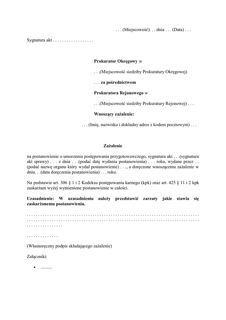 . . . (Miejscowość). . . dnia . . . (Data) . . . Sygnatura akt . . . . . . . . . . . . . . . . . . Prokurator Okręgowy w . . .(Miejscowość siedziby Prokuratury Okręgowej) . . . za pośrednictwem Prokuratora Rejonowego w . . .(Miejscowość siedziby Prokuratury Rejonowej) . . . Wnoszący zażalenie: . . . (Imię, nazwisko i dokładny adres z kodem pocztowym) . . . Zażalenie na postanowienie o umorzeniu postępowania przygotowawczego, sygnatura akt . . .(sygnatura akt sprawy) . . . z dnia . . .(podać datę wydania postanowienia) . . . roku, wydane przez . . (podać nazwę organu który wydał postanowienie) . . ., a doręczone wnoszącemu zażalenie w dniu. . .(data doręczenia postanowienia) . . . roku. Na podstawie art. 306 § 1 i 2 Kodeksu postępowania karnego (kpk) oraz art. 425 § 11 i 2 kpk zaskarżam wyżej wymienione postanowienie w całości. Uzasadnienie: W uzasadnieniu zaskarżonemu postanowieniu. należy przedstawić zarzuty jakie stawia się ............................................................................ ............................................................................ ................ .............. (Własnoręczny podpis składającego zażalenie) Załączniki: ..........