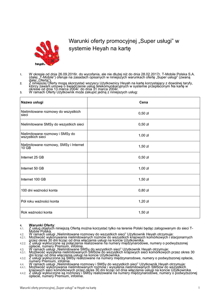 Warunki oferty promocyjnej „Super usługi” w systemie Heyah na kartę 1. 2. 3. W okresie od dnia 26.09.2016r. do wycofania, ale nie dłużej niż do dnia 28.02.2017r. T-Mobile Polska S.A. (dalej „T-Mobile”) oferuje na zasadach opisanych w niniejszych warunkach ofertę „Super usługi” (zwaną dalej „Ofertą”). Z niniejszej Oferty mogą skorzystać wszyscy Użytkownicy Heyah na kartę korzystający z dowolnej taryfy, którzy zawarli umowę o świadczenie usług telekomunikacyjnych w systemie przepłaconym Na kartę w okresie od dnia 13 marca 2004r. do dnia 31 marca 2004r. W ramach Oferty Użytkownik może zakupić jedną z niniejszych usług: Nazwa usługi Cena Nielimitowane rozmowy do wszystkich sieci 0,50 zł Nielimitowane SMSy do wszystkich sieci 0,50 zł Nielimitowane rozmowy i SMSy do wszystkich sieci 1,00 zł Nielimitowane rozmowy, SMSy i Internet 10 GB 1,50 zl Internet 25 GB 0,50 zł Internet 50 GB 1,00 zł Internet 100 GB 1,50 zł 100 dni ważności konta 0,80 zł Pół roku ważności konta 1,20 zł Rok ważności konta 1,50 zł 4. 4.1. 4.2. 4.2.1. 4.2.2. 4.3. 4.3.1. 4.3.2. 4.4. 4.4.1. 4.4.2. Warunki Oferty: Z usług objętych niniejszą Ofertą można korzystać tylko na terenie Polski będąc zalogowanym do sieci TMobile Polska. W ramach usługi „Nielimitowane rozmowy do wszystkich sieci” Użytkownik Heyah otrzymuje: Możliwość wykonywania nielimitowanych rozmów do wszystkich krajowych komórkowych i stacjonarnych przez okres 30 dni licząc od dnia włączenia usługi na koncie Użytkownika. Z usługi wykluczone są połączenia realizowane na numery międzynarodowe, numery o podwyższonej opłacie, numery Premium, infolinie. W ramach usługi „Nielimitowane SMSy do wszystkich sieci” Użytkownik Heyah otrzymuje: Możliwość wysyłania nielimitowanych SMSów do wszystkich krajowych sieci komórkowych przez okres 30 dni licząc od dnia włączenia usługi na koncie Użytkownika. Z usługi wykluczone są SMSy realizowane na numery międzynarodowe, numery o podwyższonej opłacie, numery Premium, infolinie. W ramach usługi „Nielimitowane rozmowy i SMSy do wszystkich sieci” Użytkownik Heyah otrzymuje: Możliwość wykonywania nielimitowanych rozmów i wysyłania nielimitowanych SMSów do wszystkich krajowych sieci komórkowych przez okres 30 dni licząc od dnia włączenia usługi na koncie Użytkownika. Z usługi wykluczone są rozmowy i SMSy realizowane na numery międzynarodowe, numery o podwyższonej opłacie, numery Premium, infolinie. Warunki oferty promocyjnej „Super usługi” w Heyah na kartę 1 Warunki oferty promocyjnej „Super usługi” w Heyah na kartę 4.5. 4.5.1. 4.5.2. 4.6. 4.6.1. 4.7. 4.7.1. 4.8. 4.8.1. 4.9. 4.9.1. 4.9.2. 4.10. 4.10.1. 4.10.2. 4.11. 4.11.1. 4.11.2. W ramach usługi „Nielimitowane rozmowy i SMSy do wszystkich sieci i Internet 10 GB” Użytkownik Heyah otrzymuje: Możliwość wykonywania nielimitowanych rozmów i wysyłania nielimitowanych SMSów do wszystkich krajowych sieci komórkowych oraz korzystania z pakietowej transmisji danych do wysokości 10 GB przez okres 30 dni licząc od dnia włączenia usługi na koncie Użytkownika. Z usługi wykluczone są rozmowy i SMSy realizowane na numery międzynarodowe, numery o podwyższonej opłacie, numery Premium, infolinie. W ramach usługi „Internet 25 GB” Użytkownik Heyah otrzymuje: Możliwość korzystania z pakietowej transmisji danych do wysokości 25 GB przez okres 30 dni licząc od dnia włączenia usługi na koncie Użytkownika. W ramach usługi „Internet 50 GB” Użytkownik Heyah otrzymuje: Możliwość korzystania z pakietowej transmisji danych do wysokości 50 GB przez okres 30 dni licząc od dnia włączenia usługi na koncie Użytkownika. W ramach usługi „Internet 100 GB” Użytkownik Heyah otrzymuje: Możliwość korzystania z pakietowej transmisji danych do wysokości 100 GB przez okres 30 dni licząc od dnia włączenia usługi na koncie Klienta. W ramach usługi „100 dni ważności konta” Użytkownik Heyah otrzymuje: Przedłużenie ważności konta o 100 dni na połączenia wychodzące licząc od momentu dodania usługi na konto Użytkownika. Maksymalny okres ważności konta na połączenia wychodzące wynikający z usługi oraz z doładowań Użytkownika nie może być dłuższy niż 365 dni W ramach usługi „Pół roku ważności konta” Użytkownik Heyah otrzymuje: Przedłużenie ważności konta o 183 dni na połączenia wychodzące licząc od momentu dodania usługi na konto Użytkownika. Maksymalny okres ważności konta na połączenia wychodzące wynikający z usługi oraz z doładowań Użytkownika nie może być dłuższy niż 365 dni W ramach usługi „Rok ważności konta” Użytkownik Heyah otrzymuje: Przedłużenie ważności konta o 365 dni na połączenia wychodzące licząc od momentu dodania usługi na konto Użytkownika. Maksymalny okres ważności konta na połączenia wychodzące wynikający z usługi oraz z doładowań Użytkownika nie może być dłuższy niż 365 dni 5. 5.1. 5.2. Aktywacja Aktywacja usług objętych niniejszą Ofertą jest możliwa jedynie w Biurze Obsługi Użytkownika Heyah. Usługi objęte niniejszą Ofertą będą uruchomione niezwłocznie po dokonaniu ich aktywacji w Biurze Obsługi Użytkownika Heyah, jednak nie później niż w ciągu 72h i zostaną potwierdzone wiadomością SMS. 6. 6.1. Dezaktywacja Użytkownik nie będzie miał możliwości dezaktywacji Usług po ich aktywacji w Biurze Obsługi Użytkownika Heyah. Usługi ulegają automatycznej dezaktywacji po upływie okresu ich ważności. 7. 7.1. 7.2. Sprawdzenie statusu usługi Użytkownik może sprawdzić datę Ważności Konta kodem ekspresowym *108# Użytkownik może sprawdzić status pozostałych usług w Biurze Obsługi Użytkownika Heyah. 8. 8.1. Kolejność schodzenia jednostek Usługi są rozliczane na koncie Użytkownika w pierwszej kolejności przed innymi usługami aktywnymi na jego koncie. W przypadku zmiany taryf