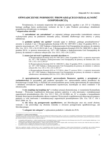 Załącznik Nr 1 do wniosku OŚWIADCZENIE PODMIOTU PROWADZĄCEGO DZIAŁALNOŚĆ GOSPODARCZĄ Świadomy(a), iż zeznanie nieprawdy lub zatajenie prawdy, zgodnie z art. 233 § 1 Kodeksu karnego podlega karze pozbawienia wolności do lat 3, jako Podmiot prowadzący działalność gospodarczą oświadczam, co następuje: * niepotrzebne skreślić 1) zatrudniam/ nie zatrudniam* co najmniej jednego pracownika (zatrudnienie oznacza wykonywanie pracy na podstawie stosunku pracy, stosunku służbowego oraz umowy o pracę nakładczą); 2) podmiot spełnia/ nie spełnia* warunki ujęte w definicji „jednego przedsiębiorstwa” zawarte w artykule 2 ust. 2 Rozporządzenia Komisji (UE) Nr 1407/2013 z dnia 18 grudnia 2013r. w sprawie stosowania art. 107 i 108 Traktatu o funkcjonowaniu Unii Europejskiej do pomocy de minimis (Dz. Urz. UE L 352 z 24.12.2013) lub 2 ust. 2 Rozporządzenia Komisji (UE) Nr 1408/2013 z dnia 18 grudnia 2013r. w sprawie stosowania art. 107 i 108 Traktatu o funkcjonowaniu Unii Europejskiej do pomocy de minimis w sektorze rolnym (Dz. Urz. UE L 352 z 24.12.2013; 3) znana jest mi treść i spełniam warunki określone w: a) Rozporządzeniu Komisji (UE) Nr 1407/2013 z dnia 18 grudnia 2013r. w sprawie stosowania art. 107 i 108 Traktatu o funkcjonowaniu Unii Europejskiej do pomocy de minimis (Dz. Urz. UE L 352 z 24.12.2013)* b) Rozporządzeniu Komisji (UE Nr 1408/2013 z dnia 18 grudnia 2013r. w sprawie stosowania art. 107 i 108 Traktatu o funkcjonowaniu Unii Europejskiej do pomocy de minimis w sektorze rolnym (Dz. Urz. UE L 352 z 24.12.2013) * c) Rozporządzenie Komisji (UE) nr 717/2014 z dnia 27 czerwca 2014 r. w sprawie stosowania art. 107 i 108 Traktatu o funkcjonowaniu Unii Europejskiej do pomocy de minimis w sektorze rybołówstwa i akwakultury (Dz.Urz. UE L 190 z 28.06.2014 4) sporządzam/nie sporządzam* sprawozdania finansowe zgodnie z przepisami o rachunkowości (w przypadku, gdy podmiot sporządza ww. sprawozdania należy przedłożyć do Powiatowego Urzędu Pracy w Rykach ich uwierzytelnione przez osobę upoważnioną do reprezentacji i składania oświadczeń zgodnie z dokumentem rejestrowym, kserokopie za okres ostatnich 3 lat obrotowych); 5) nie znajduję się/znajduję się* w trudnej sytuacji ekonomicznej, w rozumieniu Komunikatu Komisji – Wytyczne wspólnotowe dotyczące pomocy państwa w celu ratowania i restrukturyzacji zagrożonych przedsiębiorstw (Dz. Urz. UE C 244 z 01.10.2004, str. 2)1 w związku z komunikatem Komisji dotyczącym przedłużenia okresu ważności Wytycznych wspólnotowych dotyczących pomocy państwa w celu ratowania i restrukturyzacji zagrożonych przedsiębiorstw (Dz. Urz. UE C 156 z 09.07.2009, str. 3); 6) nie toczy się postępowanie upadłościowe, ani likwidacyjne oraz nie został złożony wniosek i nie przewiduje się złożenia wniosku o otwarcie postępowania upadłościowego, ani likwidacyjnego; 7) zalegam/ nie zalegam* z opłacaniem podatków i składek do ZUS; 1 Przedsiębiorca w trudnej sytuacji (definicja) Przedsiębiorcą w trudnej sytuacji jest przedsiębiorca, który traci zdolność do konkurowania na rynku, co wyraża się w szczególności zmniejszeniem obrotów przedsiębiorstwa, nadmierną zdolnością produkcyjną, wzrostem zapasów, spadkiem zyskowności lub stratą, wzrostem zadłużenia lub niemożnością uzyskania bankowych kredytów, poręczeń lub gwarancji, zwłaszcza, gdy obniżenie zdolności do konkurowania na rynku powoduje, że: w przypadku spółki kapitałowej - wielkość niepokrytej straty z lat ubiegłych łącznie z wynikiem finansowym roku bieżącego przewyższa 50% wartości kapitału zakładowego, w tym wielkość straty w ostatnim roku obrotowym przewyższa 25% wartości kapitału zakładowego, w przypadku spółki niebędącej spółką kapitałową - wielkość straty przewyższa 50% wartości majątku spółki, stanowiącego mienie wniesione jako wkład lub nabyte przez spółkę, w tym wielkość straty w ostatnim roku obrotowym przewyższa 25% wartości tego majątku, są spełnione kryteria kwalifikujące przedsiębiorcę do objęcia postępowaniem upadłościowym. Jeżeli nie są spełnione warunki, o których mowa w pkt 1-3 przedsiębiorca może być uznany za będącego w trudnej sytuacji ekonomicznej w szczególności, gdy: posiada nadmierne zdolności produkcyjne, następuje wzrost strat, zapasów lub zadłużenia, maleje obrót, zmniejsza się płynność finansowa, maleje wartość aktywów netto albo osiąga wartość zerową. 1 8) w okresie poprzedzającym otrzymanie pomocy uzyskałem/nie uzyskałem* pomoc publiczną, która kumuluje/ nie kumuluje się* z wnioskowaną pomocą i wynosi ……………………; 9) otrzymałem/nie otrzymałem* w okresie ostatnich trzech lat przed złożeniem wniosku pomoc de minimis w wysokości ....................................; 10) podmiot składający niniejszy wniosek był/nie był* karany lub skazany prawomocnym wyrokiem za naruszenie przepisów prawa pracy oraz jest/nie jest* objęty postępowaniem dotyczącym naruszenia przepisów prawa pracy; 11) zobowiązuję się do zwrotu wszystkich otrzymanych środków wraz z odsetkami ustawowymi naliczonymi od całości kwoty udzielonej pomocy od dnia wypłaty pierwszego dofinansowania wynagrodzenia w terminie 30 dni od dnia doręczenia wezwania Urzędu w przypadku nieutrzymania zatrudnienia w czasie okresu dofinansowania oraz dalszego zatrudnienia, odpowiednio przez 6 lub 12 miesięcy po jego zakończeniu; 12) zobowiązuję się do zwrotu 50% łącznej kwoty, w terminie 30 dni od ndia doręczenia wezwania Urzędu w przypadku utrzymania zatrudnienia skierowanego bezrobotnego przez okres przysługiwania dofinansowania wynagrodzenia oraz przez co najmniej połowę okresu obowiązkowego zatrudnienia po zakończeniu dofinansowania (odpowiednio 6 lub 12 miesięcy); 13) wyrażam zgodę na zbieranie, przetwarzanie, udostępnianie i archiwizowanie danych osobowych dotyczących mojej osoby przez Powiatowy Ur