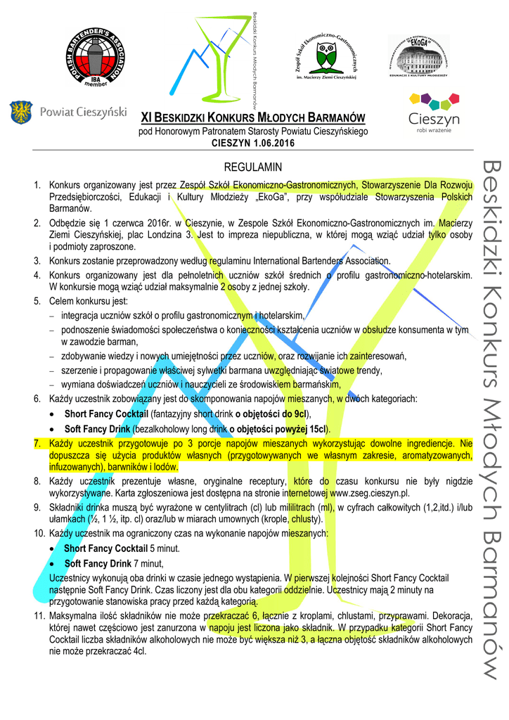 XI BESKIDZKI KONKURS MŁODYCH BARMANÓW pod Honorowym Patronatem Starosty Powiatu Cieszyńskiego CIESZYN 1.06.2016 REGULAMIN 1. Konkurs organizowany jest przez Zespół Szkół Ekonomiczno-Gastronomicznych, Stowarzyszenie Dla Rozwoju Przedsiębiorczości, Edukacji i Kultury Młodzieży „EkoGa”, przy współudziale Stowarzyszenia Polskich Barmanów. 2. Odbędzie się 1 czerwca 2016r. w Cieszynie, w Zespole Szkół Ekonomiczno-Gastronomicznych im. Macierzy Ziemi Cieszyńskiej, plac Londzina 3. Jest to impreza niepubliczna, w której mogą wziąć udział tylko osoby i podmioty zaproszone. 3. Konkurs zostanie przeprowadzony według regulaminu International Bartenders Association. 4. Konkurs organizowany jest dla pełnoletnich uczniów szkół średnich o profilu gastronomiczno-hotelarskim. W konkursie mogą wziąć udział maksymalnie 2 osoby z jednej szkoły. 5. Celem konkursu jest: integracja uczniów szkół o profilu gastronomicznym i hotelarskim, podnoszenie świadomości społeczeństwa o konieczności kształcenia uczniów w obsłudze konsumenta w tym w zawodzie barman, zdobywanie wiedzy i nowych umiejętności przez uczniów, oraz rozwijanie ich zainteresowań, szerzenie i propagowanie właściwej sylwetki barmana uwzględniając światowe trendy, wymiana doświadczeń uczniów i nauczycieli ze środowiskiem barmańskim, 6. Każdy uczestnik zobowiązany jest do skomponowania napojów mieszanych, w dwóch kategoriach: Short Fancy Cocktail (fantazyjny short drink o objętości do 9cl), Soft Fancy Drink (bezalkoholowy long drink o objętości powyżej 15cl). 7. Każdy uczestnik przygotowuje po 3 porcje napojów mieszanych wykorzystując dowolne ingrediencje. Nie dopuszcza się użycia produktów własnych (przygotowywanych we własnym zakresie, aromatyzowanych, infuzowanych), barwników i lodów. 8. Każdy uczestnik prezentuje własne, oryginalne receptury, które do czasu konkursu nie były nigdzie wykorzystywane. Karta zgłoszeniowa jest dostępna na stronie internetowej www.zseg.cieszyn.pl. 9. Składniki drinka muszą być wyrażone w centylitrach (cl) lub mililitrach (ml), w cyfrach całkowitych (1,2,itd.) i/lub ułamkach (½, 1 ½, itp. cl) oraz/lub w miarach umownych (krople, chlusty). 10. Każdy uczestnik ma ograniczony czas na wykonanie napojów mieszanych: Short Fancy Cocktail 5 minut. Soft Fancy Drink 7 minut, Uczestnicy wykonują oba drinki w czasie jednego wystąpienia. W pierwszej kolejności Short Fancy Cocktail następnie Soft Fancy Drink. Czas liczony jest dla obu kategorii oddzielnie. Uczestnicy mają 2 minuty na przygotowanie stanowiska pracy przed każdą kategorią. 11. Maksymalna ilość składników nie może przekraczać 6, łącznie z kroplami, chlustami, przyprawami. Dekoracja, której nawet częściowo jest zanurzona w napoju jest liczona jako składnik. W przypadku kategorii Short Fancy Cocktail liczba składników alkoholowych nie może być większa niż 3, a łączna objętość składników alkoholowych nie może przekraczać 4cl. XI BESKIDZKI KONKURS MŁODYCH BARMANÓW pod Honorowym Patronatem Starosty Powiatu Cieszyńskiego CIESZYN 1.06.2016 12. Drinki będą oceniane przez 2 komisje: techniczną i degustacyjną (metoda włoska). 13. Jeżeli większa ilość zawodników niż jeden osiągnie tę samą ogólną liczbę punktów nie przewiduje się miejsc ex aequo. Decydujące znaczenie będzie miała punktacja za ocenę degustacyjną. W dalszej kolejności ocena za smak, następnie ocena za aromat. 14. Uczestnicy używają własnego sprzętu barmańskiego i szkła. Barmani są zobowiązani do zabezpieczenia odpowiedniej ilości sprzętu barmańskiego pozwalającego na przygotowanie drinków w obu kategoriach podczas jednego wystąpienia. 15. Szkło nie może być oznaczone żadnymi znakami firmowymi. Nie może również być w żaden sposób udekorowane przed wejściem na stanowisko startowe. 16. Organizator zapewnia lód w kostkach. Lód kruszony uczestnik musi przygotować we własnym zakresie. 17. Napoje mieszane mogą być sporządzane dowolną metodą, z użyciem miar barowych. W czasie wykonywania drinka uczestnicy nie mogą posługiwać się recepturą. 18. Elementy dekoracyjne drinków, soki ze świeżych owoców muszą być przygotowane w przygotowalni przed wejściem na stanowisko konkursowe (czas 30minut). Ozdoby muszą się składać z jadalnych owoców i/lub warzyw. Kwiaty nie są dopuszczone do użycia nawet jeżeli są to odmiany jadalne. Elementy dekoracyjne, przyprawowe czy dodatki komplementarne uczestnicy zapewniają we własnym zakresie. Naczynia do drinków nie mogą być w żaden sposób udekorowane przed wejściem na stanowisko konkursowe. 19. Każdy z uczestników jest zobowiązany do startu w stroju barmana hotelowego (czarne spodnie wizytowe lub spódnica, biała koszula/bluzka z długim rękawem, marynarka lub kamizelka, muszka) lub stroju reprezentującego szkołę. 20. Poprzez zgłoszenie swojego udziału w konkursie uczestnicy wyrażają zgodę na fotografowanie w celach prasowych. 21. Uczestnicy przyjmują również do wiadomości, że receptury będą stanowić własność organizatora konkursu. 22. Kolejność wystąpień zawodników będzie ustalona w wyniku losowania. 23. Regulamin konkursu zostanie omówiony z zawodnikami na odprawie przed zawodami. 24. Wszyscy uczestnicy konkursu podlegają regulaminowi konkursu.