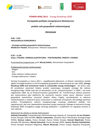 POWER RING 2011 - Energy Roadmap 2050 Europejska polityka energetyczno-klimatyczna a polskie cele gospodarki niskoemisyjnej PROGRAM 9.00 – 9:20 INAUGURACJA KONFERENCJI - Strategia polskiej gospodarki niskoemisyjnej Waldemar Pawlak, Wicepremier i Minister Gospodarki 9.20 – 11.00 Sesja I. PALIWA i ENERGIA ELEKTRYCZNA – POZYSKIWANIE, PRZESYŁ i HANDEL Przemówienie programowe: prof. Maciej Kaliski, Wiceminister Gospodarki Problematyka panelu dyskusyjnego: - Węgiel - Gaz - Ropa naftowa i paliwa płynne - Energia elektryczna i cieplna Komisja Europejska w marcu 2011 r. opublikowała dokument, w którym nakreślona została ogólna strategia budowy w Unii Europejskiej gospodarki niskoemisyjnej do roku 2050 „Energy Roadmap 2050 and investment needs in sustainable energy technologies”. Do końca roku KE przedstawi natomiast kolejny projekt zawierający szczegóły strategii dla sektora energetycznego. Polski rząd stoi na stanowisku, że do „niskoemisyjności” w 2050 r. nie może negatywnie odbić się na konkurencyjności gospodarek UE. Transformacja sektora powinna być wykorzystana jako platforma do tworzenia nowych miejsc pracy. Zdaniem resortu gospodarki powinniśmy utrzymać dodatni bilans między zatrudnieniem w sektorze niskoemisyjnym a miejscami pracy utraconymi w sektorach emisyjnych, dla każdego państwa osobno. Przedsiębiorcy sektora energetycznego oczekują stabilności polityki ram regulacyjnych, aby móc odpowiednio planować swoje inwestycje. Dlatego w tworzeniu Energy Roadmap 2050 szczególną uwagę zwracają politykom i urzędnikom na regulacje prawne w tym zakresie. Zaproszeni do udziału w panelu dyskusyjnym: Andrzej Czerwiński, Przewodniczący Parlamentarnego Zespołu ds. Energetyki, dr Jan Chadam, Prezes Zarządu GAZ-SYSTEM, Marcin Lewenstein, Dyrektor Biura Planowania Strategicznego PGNiG, Dariusz Lubera, Prezes Zarządu Tauron Polska Energia, Henryk Majchrzak, Prezes Zarządu PSE Operator, Maciej Owczarek, Prezes Zarządu ENEA, Joanna Strzelec-Łobodzińska, Prezes Zarządu Kompanii Węglowej, Marek Woszczyk, Prezes Urzędu Regulacji Energetyki, 1 Krzysztof Nosal, Dyrektor Arizona Chemical, Grzegorz Onichimowski, Prezes Zarządu Towarowa Giełda Energii, Wojciech Hann, Partner, Deloitte, Moderator: Agnieszka Łakoma, Rzeczpospolita 11.00 – 11:15 PRZERWA NA KAWĘ 11.15 – 12.55 Sesja II. INNOWACYJNE ZERO I NISKOEMISYJNE TECHNOLOGIE W ENERGETYCE I PRZEMYŚLE Przemówienie programowe: prof. Jerzy Buzek, Przewodniczący Parlamentu Europejskiego, Przewodniczący Społecznej Rady Narodowego Programu Redukcji Emisji Problematyka panelu dyskusyjnego: - Czyste technologie węglowe - Energetyka jądrowa - Energetyka prosumencka - Energetyka odnawialna - Infrastruktura - Systemy wsparcia niskoemisyjnych technologii Czy rząd zdecyduje się na wykorzystanie 100% dochodów z aukcji na dofinansowanie inwestycji ograniczających emisje gazów cieplarnianych, w szczególności: efektywność energetyczną, gaz niekonwencjonalny, energią jądrową, OZE, czyste technologie węglowe, smart grids, innowacyjność przemysłu, paliwa alternatywne, niskoemisyjny transport, smart cities, smart metering, termomodernizację budynków i budownictwo ekologiczne. Podczas tej sesji eksperci będą dyskutować o dostępnych na rynku niskoemisyjnych technologiach oraz o potrzebie stworzenia Banku Inwestycji Niskoemisyjnych, który miałby na celu wspieranie rozwoju i implementacji niskoemisyjnych technologii, szczególnie tych, wymienionych w Narodowym Programie Rozwoju Gospodarki Niskoemisyjnej. Bank ten (a) przygotowuje system udzielania kredytów na preferencyjnych warunkach, (b) identyfikuje ułomności rynku i działa na rzecz ich minimalizacji, (c) czuwa nad tym, aby środki publiczne były wydawane zgodnie z Narodowym Programie Rozwoju Gospodarki Niskoemisyjnej, (d) doradza rządowi i samorządom w kwestiach wspierania finansowego projektów niskoemisyjnych. Zaproszeni do udziału w panelu dyskusyjnym: Wojciech Dąbrowski, Prezes Agencji Rozwoju Przemysłu, Paweł Jarczewski, Prezes Zarządu ZA Puławy, Witold Drożdż, Wiceprezes Zarządu PGE EJ 1, Mirosław Gryszka, Prezes Zarządu ABB Sp. z o.o., prof. Józef Dubiński, Dyrektor Głównego Instytutu Górnictwa, Rada Główna Instytutów Badawczych, Jan Rączka, Prezes NFOŚiGW, dr Paweł Skowroński, Wiceprezes Zarządu PGE, dr Herbert Wirth, Prezes Zarządu KGHM Polska Miedź, Przemysław Zaleski, Wiceprezes Zarządu ENEA Operator, dr Bartosz Wojszczyk, Dyrektor ds. Rozwoju Technologii Smart Grid, GE Energy, Wojciech Włodarczak, Prezes Zarządu Wartsila Polska Moderator: Redaktor, TVN CNBC 2 12.55 – 13:25 LUNCH 13.25 – 14.40 Sesja III. KRAJOWY PLAN INWESTYCYJNY – FINANSOWANIE Przemówienie programowe/wystąpienie Gościa Specjalnego: Philip Lowe, Dyrektor Generalny ds. energii, Komisja Europejska Strategia budowy w Unii Europejskiej gospodarki niskoemisyjnej do roku 2050 – Jak wspierać inwestycje związane z efektywnością energetyczną? Problematyka panelu dyskusyjnego: - Błękitne certyfikaty - Pozyskiwanie środków na finansowanie inwestycji zgłoszonych do KPI Polska przygotowała Krajowy Program Inwestycyjny, wymagany przez Dyrektywę EU-ETS (Art. 11), jest załącznikiem do wniosku derogacyjnego przesłanego Komisji Europejskiej. Pozostało nam niewiele czasu na wprowadzenie tego programu, pod względem wagi dla polskiej energetyki porównywalnego z planem Marshalla. Trzeba pamiętać, że bez tego planu nie uruchomimy derogacji, uzyskanej przez premiera Donalda Tuska w grudniu 2008 r. Derogacja została uzyskana warunkowo. Bez inwestycji jej nie będzie, a bez derogacji czeka nas dramatyczna skokowa podwyżka cen energii. Sam proces wdrażania Krajowego Programu Inwestycyjnego, czyli „planu Marshalla” wymagać będzie „Ustawy o inwestycjach strategicznych o kluczowym znaczeniu dla gospodarki kraju”. Powinna to być specustawa o charakterze uniwersalnym, uwzględniająca wszystkie dotychczasow