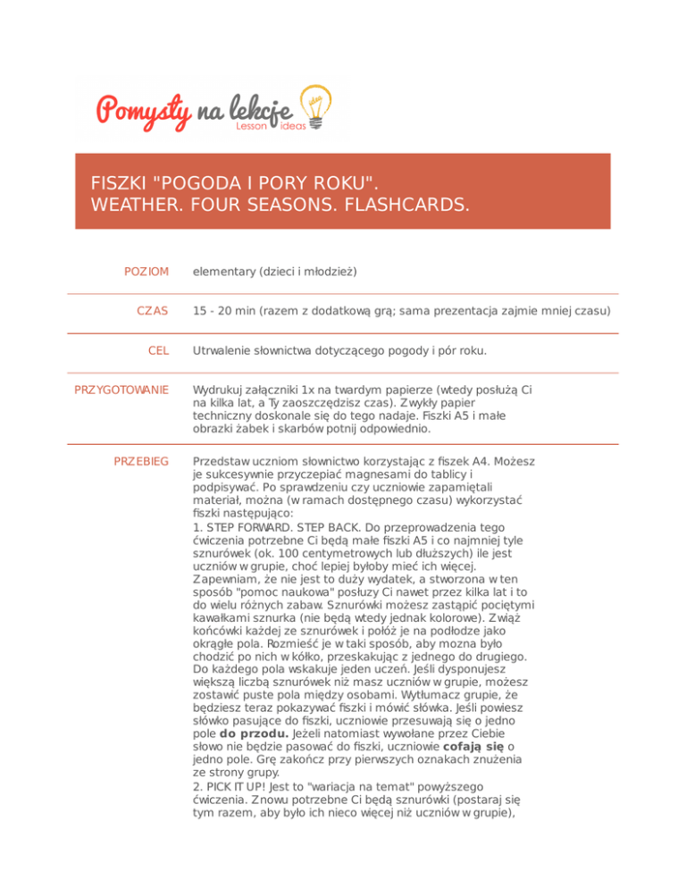 FISZKI "POGODA I PORY ROKU". WEATHER. FOUR SEASONS. FLASHCARDS. POZIOM CZAS CEL elementary (dzieci i młodzież) 15 - 20 min (razem z dodatkową grą; sama prezentacja zajmie mniej czasu) Utrwalenie słownictwa dotyczącego pogody i pór roku. PRZYGOTOWANIE Wydrukuj załączniki 1x na twardym papierze (wtedy posłużą Ci na kilka lat, a Ty zaoszczędzisz czas). Zwykły papier techniczny doskonale się do tego nadaje. Fiszki A5 i małe obrazki żabek i skarbów potnij odpowiednio. PRZEBIEG Przedstaw uczniom słownictwo korzystając z fiszek A4. Możesz je sukcesywnie przyczepiać magnesami do tablicy i podpisywać. Po sprawdzeniu czy uczniowie zapamiętali materiał, można (w ramach dostępnego czasu) wykorzystać fiszki następująco: 1. STEP FORWARD. STEP BACK. Do przeprowadzenia tego ćwiczenia potrzebne Ci będą małe fiszki A5 i co najmniej tyle sznurówek (ok. 100 centymetrowych lub dłuższych) ile jest uczniów w grupie, choć lepiej byłoby mieć ich więcej. Zapewniam, że nie jest to duży wydatek, a stworzona w ten sposób "pomoc naukowa" posłuzy Ci nawet przez kilka lat i to do wielu różnych zabaw. Sznurówki możesz zastąpić pociętymi kawałkami sznurka (nie będą wtedy jednak kolorowe). Zwiąż końcówki każdej ze sznurówek i połóż je na podłodze jako okrągłe pola. Rozmieść je w taki sposób, aby mozna było chodzić po nich w kółko, przeskakując z jednego do drugiego. Do każdego pola wskakuje jeden uczeń. Jeśli dysponujesz większą liczbą sznurówek niż masz uczniów w grupie, możesz zostawić puste pola między osobami. Wytłumacz grupie, że będziesz teraz pokazywać fiszki i mówić słówka. Jeśli powiesz słówko pasujące do fiszki, uczniowie przesuwają się o jedno pole do przodu. Jeżeli natomiast wywołane przez Ciebie słowo nie będzie pasować do fiszki, uczniowie cofają się o jedno pole. Grę zakończ przy pierwszych oznakach znużenia ze strony grupy. 2. PICK IT UP! Jest to "wariacja na temat" powyższego ćwiczenia. Znowu potrzebne Ci będą sznurówki (postaraj się tym razem, aby było ich nieco więcej niż uczniów w grupie), tym razem, aby było ich nieco więcej niż uczniów w grupie), które rozkładasz na podłodze po okręgu. Obok każdego polasznurówki kładziesz jedną małą fiszkę awersem do dołu. Może się zdarzyć, że będziesz mieć więcej uczniów (a więc też pól) niż fiszek. W takim przypadku umieść fiszki obok co drugiego pola. Do każdego pola-sznurówki wskakuje jeden uczeń. Wytłumacz grupie, że kiedy zaklaskasz w dłonie i powiesz "go", będą musieli maszerować po okręgu, przechodząc z pola do pola. Kiedy natomiast klaśniesz drugi raz i powiesz "stop", muszą się zatrzymać, podnieść fiszkę, która leży obok danego pola i powiedzeć słówko zilustrowane na niej (po kolei, oczywiście). Jeśli komuś zdarzyło się wylądować na polu bez fiszki (przypadek: więcej osób niż fiszek), to trudno - ma wolne w tej rundzie. Graczy, którzy nie potrafią powiedzeć słowa ze swojej fiszki możesz eliminować z gry, ale ze względów organizacyjno-porządkowych szczerze nie radzę tego robić... 3. FROGS AND TREASURE CHESTS. Gra świetnie się sprawdza w przypadku małych grup (ok.10 os). Zbierz dzieci i usiądźcie na podłodze (bądź przy dużym stole). Awersem do dołu połóż fiszki A5. Poproś uczniów, aby zamknęli oczy. Pod rozłożonymi fiszkami umieść pocięte obrazki żabek lub skrzyń ze skarbami. Stosunek skrzyń do żab jest dowolny, z tym że skrzynek powinno być więcej. WAŻNE! Uczniowie nie mogą wiedzeć, pod którymi fiszkami one się znajdują. Teraz rozpoczyna się właściwa część zabawy. Uczniowie po kolei odkrywają fiszki. Jeśli pod daną fiszką znajduje się skrzynia ze skarbem, uczeń musi tylko nazwać obrazek na fiszce. Jeśli jest to natomiast żaba, uczeń musi nazwać obrazek oraz wykonać dodatkowe zadanie (Sing a song in English. Name five irregular verbs and their past forms. Describe your best friend. Jump around the table on one leg. Go to the library and ask for a book in English.). Lista zadań zależy od inwencji nauczyciela i poziomu (wieku) grupy, nie powinny one jednak być zlośliwe... ZAŁĄCZNIKI NOTATKI Wydrukuj załączniki 1x na twardym papierze (wtedy posłużą Ci na kilka lat, a Ty zaoszczędzisz czas). Zwykły papier techniczny doskonale się do tego nadaje. Fiszki A5 i małe obrazki żabek i skarbów potnij odpowiednio.