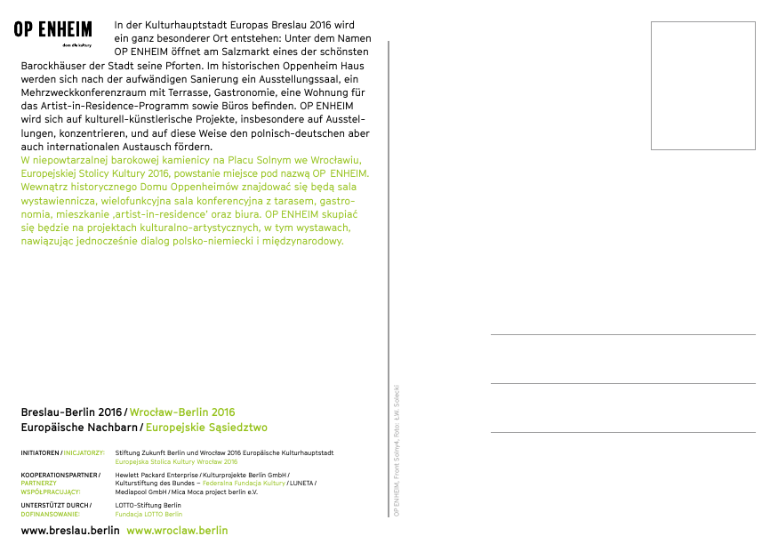 Breslau-Berlin 2016 / Wrocław-Berlin 2016 Europäische Nachbarn / Europejskie Sąsiedztwo INITIATOREN / INICJATORZY: Stiftung Zukunft Berlin und Wrocław 2016 Europäische Kulturhauptstadt Europejska Stolica Kultury Wrocław 2016 KOOPERATIONSPARTNER / PARTNERZY WSPÓŁPRACUJĄCY: Hewlett Packard Enterprise / Kulturprojekte Berlin GmbH / Kulturstiftung des Bundes – Federalna Fundacja Kultury / LUNETA / Mediapool GmbH / Mica Moca project berlin e.V. UNTERSTÜTZT DURCH / DOFINANSOWANIE: LOTTO-Stiftung Berlin Fundacja LOTTO Berlin www.breslau.berlin www.wroclaw.berlin OP ENHEIM, Front Solny4, Foto: Ł.W. Solecki In der Kulturhauptstadt Europas Breslau 2016 wird ein ganz besonderer Ort entstehen: Unter dem Namen OP ENHEIM öffnet am Salzmarkt eines der schönsten Barockhäuser der Stadt seine Pforten. Im historischen Oppenheim Haus werden sich nach der aufwändigen Sanierung ein Ausstellungssaal, ein Mehrzweckkonferenzraum mit Terrasse, Gastronomie, eine Wohnung für das Artist-in-Residence-Programm sowie Büros befinden. OP ENHEIM wird sich auf kulturell-künstlerische Projekte, insbesondere auf Ausstellungen, konzentrieren, und auf diese Weise den polnisch-deutschen aber auch internationalen Austausch fördern. W niepowtarzalnej barokowej kamienicy na Placu Solnym we Wrocławiu, Europejskiej Stolicy Kultury 2016, powstanie miejsce pod nazwą OP ENHEIM. Wewnątrz historycznego Domu Oppenheimów znajdować się będą sala wystawiennicza, wielofunkcyjna sala konferencyjna z tarasem, gastronomia, mieszkanie ‚artist-in-residence’ oraz biura. OP ENHEIM skupiać się będzie na projektach kulturalno-artystycznych, w tym wystawach, nawiązując jednocześnie dialog polsko-niemiecki i międzynarodowy.