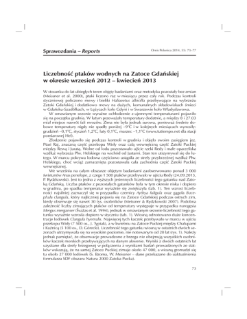 Sprawozdania – Reports Ornis Polonica 2014, 55: 73–77 Liczebność ptaków wodnych na Zatoce Gdańskiej w okresie wrzesień 2012 – kwiecień 2013 W stosunku do lat ubiegłych teren objęty badaniami oraz metodyka pozostały bez zmian (Meissner et al. 2000), ptaki liczono raz w miesiącu przez cały rok. Podczas kontroli styczniowej policzono mewy i bieliki Haliaeetus albicilla przebywające na wybrzeżu Zatoki Gdańskiej i dodatkowo mewy na dużych, komunalnych składowiskach śmieci w Gdańsku-Szadółkach, w Łężycach koło Gdyni i w Swarzewie koło Władysławowa. W omawianym sezonie wyraźne ochłodzenie z ujemnymi temperaturami pojawiło się na początku grudnia. W lutym przeważały temperatury dodatnie, a między 8 i 27.03 miał miejsce nawrót fali mrozów. Zima nie była jednak surowa, ponieważ średnie dobowe temperatury nigdy nie spadły poniżej –9°C i w kolejnych miesiącach wynosiły: grudzień –0,1°C, styczeń 1,2°C, luty 0,1°C, marzec –1,1°C (www.tutiempo.net dla stacji pomiarowej Hel). Zlodzenie pojawiło się podczas kontroli w grudniu i objęło swoim zasięgiem jez. Ptasi Raj, znaczną część przekopu Wisły oraz całą wewnętrzną część Zatoki Puckiej między Rewą i Juratą. Wolne od lodu pozostawało ujście rzeki Redy i małe oparzeliska wzdłuż wybrzeża Płw. Helskiego na wschód od Jastarni. Stan ten utrzymywał się do lutego. W marcu pokrywa lodowa częściowo ustąpiła ze strefy przybrzeżnej wzdłuż Płw. Helskiego, choć wciąż zamarznięta pozostawała cała zachodnia część Zatoki Puckiej wewnętrznej. We wrześniu na całym obszarze objętym badaniami zaobserwowano ponad 3 000 świstunów Anas penelope, z czego 1 500 ptaków przebywało w ujściu Redy (24.09.2013, P. Rydzkowski). Jest to jedna z wyższych jesiennych liczebności tego gatunku nad Zatoką Gdańską. Liczba ptaków z pozostałych gatunków była w tym okresie niska i dopiero w grudniu, po spadku temperatur wyraźnie się zwiększyła (tab. 1). Ten wzrost liczebności najsilniej zaznaczył się w przypadku czernicy Aythya fuligula oraz gągoła Bucephala clangula, który najliczniej pojawia się na Zatoce Gdańskiej podczas ostrych zim, kiedy obserwuje się nawet 30 tys. osobników (Meissner & Rydzkowski 2007). Podobna zależność liczby zimujących ptaków od temperatury występuje w przypadku nurogęsia Mergus merganser (Švažas et al. 1994), jednak w omawianym sezonie liczebność tego gatunku wyraźnie wzrosła dopiero w styczniu (tab. 1). Wiosną odnotowano duże koncentracje lodówek Clangula hyemalis. Najwięcej tych kaczek przebywało w marcu w ujściu przekopu Wisły (7 500 os., J. Typiak), a w kwietniu na Zatoce Puckiej między Chałupami i Kuźnicą (5 100 os., D. Górecki). Liczebność tego gatunku wiosną w ostatnich dwóch sezonach utrzymywała się na wysokim poziomie, nie notowanym od 20 lat (rys. 1). Należy jednak pamiętać, że obserwacje prowadzone z brzegu nie obejmują wszystkich osobników kaczek morskich przebywających na danym akwenie. Wyniki z dwóch ostatnich lat uzyskane dla strefy brzegowej w połączeniu z wynikami badań prowadzonych ze statków wskazują, że na samej Zatoce Puckiej zimuje około 47 000, a wiosną gromadzi się tu około 27 000 lodówek (S. Bzoma, W. Meissner – dane przekazane do uaktualnienia formularza SDF obszaru Natura 2000 Zatoka Pucka). 73 Tabela 1. Liczebność ptaków wodnych na Zatoce Gdańskiej od września 2012 do kwietnia 2013 Table 1. Numbers of waterbirds on the Bay of Gdańsk between September 2012 and April 2013. (1) – species, (2) – total Gatunek (1) Ardea cinerea Egretta alba Cygnus olor Cygnus columbianus Cygnus cygnus Anser fabalis Anser albifrons Anser anser Branta canadensis Branta leucopsis Branta bernicla Tadorna tadorna Anas penelope Anas strepera Anas crecca Anas platyrhynchos Anas acuta Anas querquedula Anas clypeata Aythya ferina Aythya fuligula Aythya marila Somateria mollissima Clangula hyemalis Melanitta nigra Melanitta fusca Bucephala clangula Mergellus albellus Mergus serrator Mergus merganser Gavia stellata Gavia arctica Tachybaptus ruficollis Podiceps cristatus Podiceps grisegena Podiceps auritus Phalacrocorax carbo Fulica atra Gallinula chloropus Uria aalge Alca torda Razem (2) 74 21.–24. 14.–15. 17.–18. 14.–16. 18.–20. 16.–18. 16.–18. 13.–14. 09.12 10.12 11.12 12.12 01.13 02.13 03.13 04.13 31 26 99 20 13 92 35 35 1 1 1 512 775 980 6150 5418 4947 5284 1962 1 63 5 2 18 1 46 287 434 49 164 239 2 1 3 80 35 57 1 9 121 262 220 348 221 4 24 1 1 4 5 5 8 1 5 2 6 41 3215 961 227 17 1 28 1212 16 41 81 1 2 51 530 74 24 12 20 57 728 1912 2992 2065 2075 2441 1633 1972 4 1 2 76 2 74 29 40 48 32 8 188 64 25 6 728 2952 5705 20479 22076 15729 8933 19141 50 486 1240 3665 373 864 438 4611 25 34 6 5 65 205 126 26 509 4562 3327 5178 4333 14416 13975 27 97 401 216 325 1031 498 884 5 328 309 1355 1445 3187 1688 1226 323 396 2782 10869 9291 10454 13580 2879 9 23 958 412 158 69 40 19 14 473 165 524 112 90 142 451 124 189 1269 12860 4228 3809 442 1 1 1 4 1 2 10 2 3 2 1 2 1 423 950 1383 416 371 354 107 454 1 1 1 6 112 31 9 1 24 22 5481 6117 2280 5343 2779 1827 2447 1335 837 805 2544 1880 560 2522 242 1111 2 1 15 1 1 1 1 13671 17128 26688 58694 64570 52873 53717 52071 Rys. 1. Zmiany liczby lodówek Clangula hyemalis przebywających wiosną w przybrzeżnej strefie zachodniej części Zatoki Gdańskiej. Dla każdego sezonu podano wyższą liczebność z miesięcy marzec i kwiecień Fig. 1. Changes in numbers of the Long-tailed Duck occurring in the spring on the western part of the Bay of Gdańsk. For every season the highest number for March and April is given W styczniu 2013 roku na wybrzeżu Zatoki Gdańskiej zaobserwowano 7 051 mew srebrzystych Larus argentatus, a łącznie z kontrolowanymi wysypiskami śmieci liczebność tego gatunku przekroczyła 14 000 (tab. 2). Najwięcej mew srebrzystych przebywało w rejonie portów rybackich w Jastarni (1 580 os.) i we Władysławow