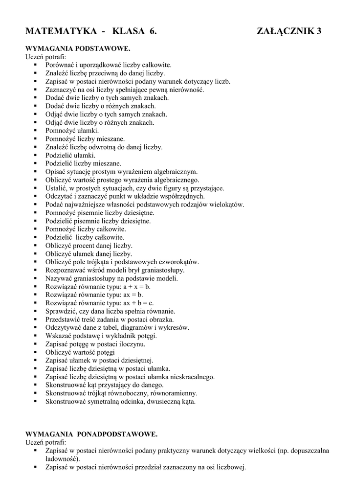 MATEMATYKA - KLASA 6. ZAŁĄCZNIK 3 WYMAGANIA PODSTAWOWE. Uczeń potrafi: Porównać i uporządkować liczby całkowite. Znaleźć liczbę przeciwną do danej liczby. Zapisać w postaci nierówności podany warunek dotyczący liczb. Zaznaczyć na osi liczby spełniające pewną nierówność. Dodać dwie liczby o tych samych znakach. Dodać dwie liczby o różnych znakach. Odjąć dwie liczby o tych samych znakach. Odjąć dwie liczby o różnych znakach. Pomnożyć ułamki. Pomnożyć liczby mieszane. Znaleźć liczbę odwrotną do danej liczby. Podzielić ułamki. Podzielić liczby mieszane. Opisać sytuację prostym wyrażeniem algebraicznym. Obliczyć wartość prostego wyrażenia algebraicznego. Ustalić, w prostych sytuacjach, czy dwie figury są przystające. Odczytać i zaznaczyć punkt w układzie współrzędnych. Podać najważniejsze własności podstawowych rodzajów wielokątów. Pomnożyć pisemnie liczby dziesiętne. Podzielić pisemnie liczby dziesiętne. Pomnożyć liczby całkowite. Podzielić liczby całkowite. Obliczyć procent danej liczby. Obliczyć ułamek danej liczby. Obliczyć pole trójkąta i podstawowych czworokątów. Rozpoznawać wśród modeli brył graniastosłupy. Nazywać graniastosłupy na podstawie modeli. Rozwiązać równanie typu: a + x = b. Rozwiązać równanie typu: ax = b. Rozwiązać równanie typu: ax + b = c. Sprawdzić, czy dana liczba spełnia równanie. Przedstawić treść zadania w postaci obrazka. Odczytywać dane z tabel, diagramów i wykresów. Wskazać podstawę i wykładnik potęgi. Zapisać potęgę w postaci iloczynu. Obliczyć wartość potęgi Zapisać ułamek w postaci dziesiętnej. Zapisać liczbę dziesiętną w postaci ułamka. Zapisać liczbę dziesiętną w postaci ułamka nieskracalnego. Skonstruować kąt przystający do danego. Skonstruować trójkąt równoboczny, równoramienny. Skonstruować symetralną odcinka, dwusieczną kąta. WYMAGANIA PONADPODSTAWOWE. Uczeń potrafi: Zapisać w postaci nierówności podany praktyczny warunek dotyczący wielkości (np. dopuszczalna ładowność). Zapisać w postaci nierówności przedział zaznaczony na osi liczbowej. Wykonać na ułamkach obliczenia, w których występuje kilka różnych działań. Uprościć niezbyt skomplikowane wyrażenie algebraiczne. Ustalić, w prostych sytuacjach, co trzeba zrobić, aby nałożyć na siebie figury przystające. Zaznaczyć w układzie współrzędnych prostą figurę spełniającą podane warunki. Obliczyć liczbę, gdy dany jest jej procent. Obliczyć liczbę, gdy dany jest jej ułamek. Rozwiązywać zadania tekstowe, stosując działania na liczbach wymiernych i procentach. Zaokrąglić liczbę dziesiętną do całości, części dziesiątych lub setnych. Obliczyć podstawę trójkąta, gdy dana jest odpowiadająca jej wysokość oraz pole. Obliczyć wysokość trójkąta, gdy dana jest odpowiadająca jej podstawa oraz pole. Obliczyć pole figury dzieląc ją na trójkąty i czworokąty. Rozwiązać zadanie tekstowe wykorzystując własności poznanych wielokątów i brył. Zamieniać jednostki pola. Opisywać własności graniastosłupów na podstawie modeli. Opisywać własności ostrosłupów na podstawie modeli. Obliczyć objętość graniastosłupa. Obliczyć objętość ostrosłupa. Obliczyć pole powierzchni całkowitej graniastosłupa. Obliczyć pole powierzchni całkowitej ostrosłupa. Rozwiązać równanie typu: ax + b = cx + d. Zapisać treść zadania w postaci schematycznego rysunku. Zapisać treść zadania w postaci równania. Rozwiązać proste zadanie tekstowe przedstawione w postaci obrazka. Rozwiązywać zadania tekstowe za pomocą równań. Sprawdzić, rozwiązanie zadania z warunkami zadania. Rysować diagramy procentowe. Oszacować pierwiastek kwadratowy i sześcienny z liczby. Wskazać okres w rozwinięciu dziesiętnym nieskończonym ułamka. Znaleźć rozwinięcie dziesiętne ułamka. Obliczyć, jakim procentem jednej liczby jest druga liczba. Obliczyć średnią arytmetyczną kilku liczb. Zaplanować i wykonać obliczenia, w których występują ułamki i liczby zapisane dziesiętnie. Rozstrzygnąć, w prostych sytuacjach, czy dwa wyrażenia algebraiczne są równe. Skonstruować trójkąt mając dane trzy jego boki. Skonstruować prostą przechodzącą przez punkt, prostopadłą do danej prostej. Skonstruować prostą przechodzącą przez punkt, równoległą do danej prostej.