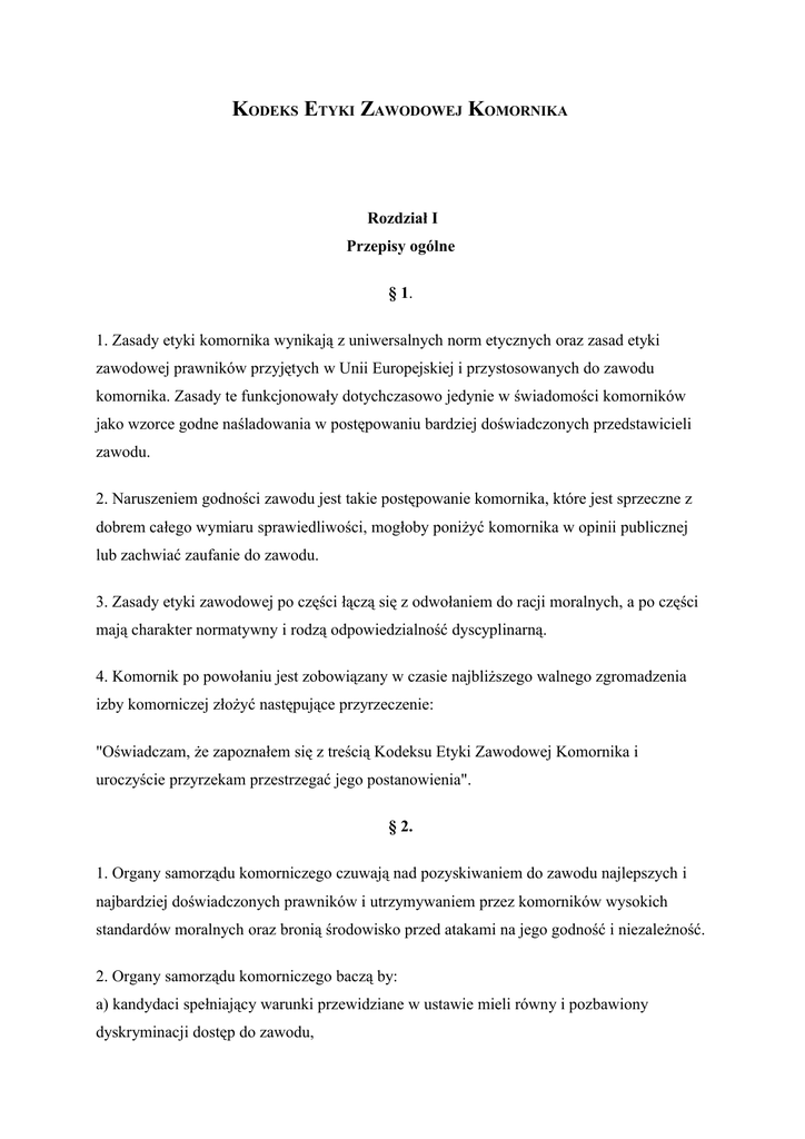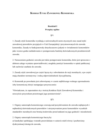 KODEKS ETYKI ZAWODOWEJ KOMORNIKA Rozdział I Przepisy ogólne § 1. 1. Zasady etyki komornika wynikają z uniwersalnych norm etycznych oraz zasad etyki zawodowej prawników przyjętych w Unii Europejskiej i przystosowanych do zawodu komornika. Zasady te funkcjonowały dotychczasowo jedynie w świadomości komorników jako wzorce godne naśladowania w postępowaniu bardziej doświadczonych przedstawicieli zawodu. 2. Naruszeniem godności zawodu jest takie postępowanie komornika, które jest sprzeczne z dobrem całego wymiaru sprawiedliwości, mogłoby poniżyć komornika w opinii publicznej lub zachwiać zaufanie do zawodu. 3. Zasady etyki zawodowej po części łączą się z odwołaniem do racji moralnych, a po części mają charakter normatywny i rodzą odpowiedzialność dyscyplinarną. 4. Komornik po powołaniu jest zobowiązany w czasie najbliższego walnego zgromadzenia izby komorniczej złożyć następujące przyrzeczenie: "Oświadczam, że zapoznałem się z treścią Kodeksu Etyki Zawodowej Komornika i uroczyście przyrzekam przestrzegać jego postanowienia". § 2. 1. Organy samorządu komorniczego czuwają nad pozyskiwaniem do zawodu najlepszych i najbardziej doświadczonych prawników i utrzymywaniem przez komorników wysokich standardów moralnych oraz bronią środowisko przed atakami na jego godność i niezależność. 2. Organy samorządu komorniczego baczą by: a) kandydaci spełniający warunki przewidziane w ustawie mieli równy i pozbawiony dyskryminacji dostęp do zawodu, b) procedura podejmowania decyzji personalnych była wolna od nacisków i wcześniejszych uzgodnień nieformalnych, c) kandydaci nie zabiegali o protekcję kogokolwiek i nie czynili podobnych poniżających zabiegów. § 3. Zasady "Kodeksu" obowiązują odpowiednio aplikantów, asesorów komorniczych i emerytowanych komorników. § 4. 1. Komornik odpowiada dyscyplinarnie za uchybienie etyce zawodowej podczas działalności zawodowej, publicznej, a także w życiu prywatnym, w doborze otoczenia i stosunków towarzyskich. 2. Uchybienie wzorcom godnym naśladowania stanowi naruszenie powagi i godności urzędu, za które komornik odpowiada dyscyplinarnie na podstawie art. 71 ustawy o komornikach sądowych i egzekucji. 3. Komornik obwiniony nie może uchylać się przed postępowaniem dyscyplinarnym, a także dążyć do uzyskania korzystnego dla siebie rozstrzygnięcia inną drogą niż w sposób zgodny z prawem i etyką. § 5. 1. Każdy Komornik obowiązany jest współdziałać w strzeżeniu powagi i godności zawodu, bronić jego tożsamości i właściwego mu systemu przekonań. Jest uprawniony do zwrócenia w taktownej formie uwagi koledze i pracownikowi naruszającemu zasady etyki zawodowej; przy drastycznym naruszeniu zasad etycznych winien wystąpić o wszczęcie postępowania dyscyplinarnego. 2. Komornik powinien unikać serwilizmu w kontaktach z osobami, którym jest służbowo czy też funkcyjnie podległy, a jednocześnie arogancji i nieposzanowania godności jego podwładnych i stron podejmowanych czynności. 3. Komornik nie może publicznie komentować czynności przeprowadzanych przez innego komornika, dba jednocześnie by nie czynił tego nikt z jego personelu. § 6. W czasie wykonywania czynności zawodowych komornik podlega tylko ustawom, orzeczeniom sądowym i zasadom etyki zawodowej. § 7. 1. Komornik powinien wykonywać czynności zawodowe według najlepszej woli i wiedzy, z należytą uczciwością i bezstronnością, rzetelnością i sprawnością. 2. Komornik winien rozszerzać swoją wiedzę zawodową, w szczególności poprzez uczestnictwo w szkoleniach i seminariach. Rozdział II Wykonywanie zawodu § 8. Komornik jest zobowiązany troszczyć się o sprawność podejmowanych czynności egzekucyjnych: 1) przestrzegać wyznaczonych terminów czynności i przyjmowania interesantów, 2) kontrolować przebieg i wyniki czynności, 3) dbać o zachowanie kultury miejsca pracy odpowiednio do godności urzędu i materialnych możliwości. § 9. 1. Komornik działa w interesie wierzyciela, zachowując wymogi dotyczące ochrony dłużnika i zachowaniu lojalności wobec wymiaru sprawiedliwości. 2. Komornik nie może usprawiedliwiać naruszenia zasad etyki i godności zawodu w prowadzonych czynnościach powołaniem się na poczynione przez klienta sugestie. § 10. 1. Komornik zobowiązany jest szczególnie dbać o zachowanie powagi i niezależności urzędu, jeśli stroną czynności jest instytucja publiczna (państwowa czy też samorządowa). 2. Niedopuszczalne jest okazywanie przez komornika zażyłości z osobami zatrudnionymi w sądach oraz innych organach i instytucjach państwowych. § 11. 1. Komornik oraz osoba, która była komornikiem, obowiązani są zachować w tajemnicy wszystko, o czym dowiedzieli się w związku z prowadzeniem czynności. 2. Komornik odpowiada za zachowanie tajemnicy zawodowej przez jego pracowników. 3. Znajdujące się w aktach sprawy materiały (dokumenty i notatki) objęte są tajemnicą zawodową. 4. Komornik stosujący w pracy środki elektronicznego utrwalania danych obowiązany jest wdrożyć oprogramowanie zabezpieczające dane przed ich niepowołanym ujawnieniem. 5. Komornik podczas przekazywania wiadomości środkami elektronicznymi obowiązany jest do zachowania szczególnej ostrożności dla wyeliminowania przypadkowego udostępniania informacji objętych tajemnicą osobie postronnej. § 12. Jeśli dokonywane jest przeszukanie w lokalu, w którym komornik wykonuje zawód lub w mieszkaniu prywatnym komornika, może on żądać uczestnictwa w tej czynności przedstawiciela samorządu komorniczego. § 13. Komornikowi nie wolno podjąć się prowadzenia czynności, jeżeli: 1) czynność skierowana jest przeciwko współmałżonkowi, bratu, siostrze lub krewnemu komornika w linii prostej, bądź osobie z którą komornik ma poważny zatarg, 2) dłużnik zastępowany jest przez osobę wymienioną w pkt. 1. § 14. Komornik jest obowiązany czuwać 