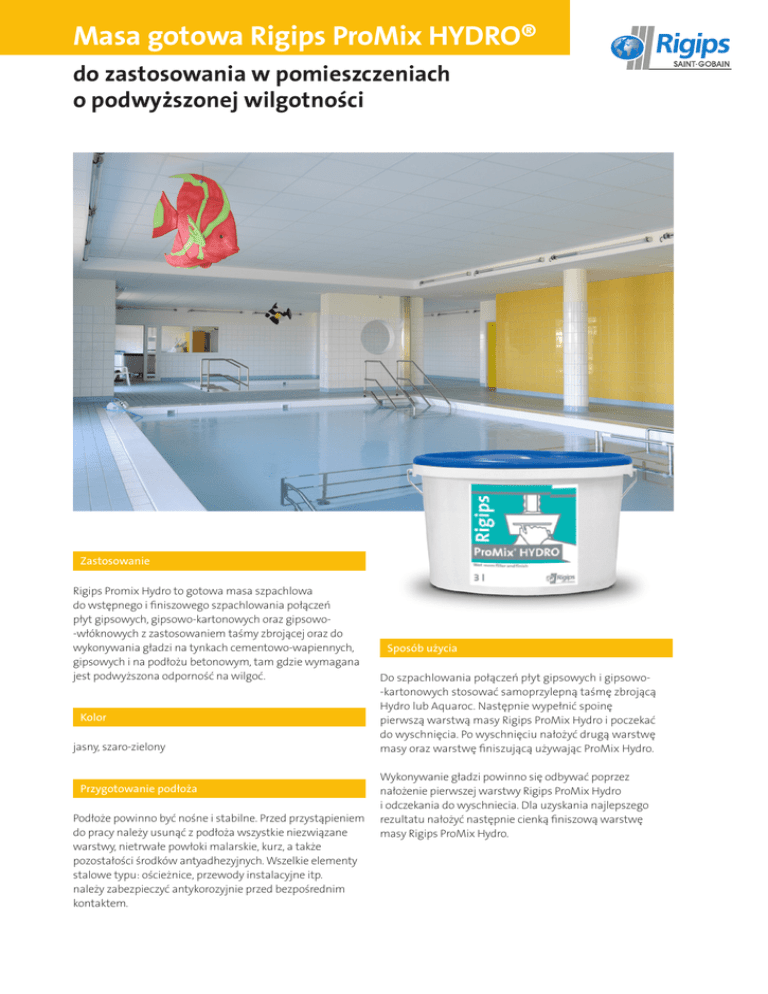 Masa gotowa Rigips ProMix HYDRO® do zastosowania w pomieszczeniach o podwyższonej wilgotności Zastosowanie Rigips Promix Hydro to gotowa masa szpachlowa do wstępnego i finiszowego szpachlowania połączeń płyt gipsowych, gipsowo-kartonowych oraz gipsowo ‑włóknowych z zastosowaniem taśmy zbrojącej oraz do wykonywania gładzi na tynkach cementowo-wapiennych, gipsowych i na podłożu betonowym, tam gdzie wymagana jest podwyższona odporność na wilgoć. Kolor jasny, szaro-zielony Przygotowanie podłoża Podłoże powinno być nośne i stabilne. Przed przystąpieniem do pracy należy usunąć z podłoża wszystkie niezwiązane warstwy, nietrwałe powłoki malarskie, kurz, a także pozostałości środków antyadhezyjnych. Wszelkie elementy stalowe typu: ościeżnice, przewody instalacyjne itp. należy zabezpieczyć antykorozyjnie przed bezpośrednim kontaktem. Sposób użycia Do szpachlowania połączeń płyt gipsowych i gipsowo ‑kartonowych stosować samoprzylepną taśmę zbrojącą Hydro lub Aquaroc. Następnie wypełnić spoinę pierwszą warstwą masy Rigips ProMix Hydro i poczekać do wyschnięcia. Po wyschnięciu nałożyć drugą warstwę masy oraz warstwę finiszującą używając ProMix Hydro. Wykonywanie gładzi powinno się odbywać poprzez nałożenie pierwszej warstwy Rigips ProMix Hydro i odczekania do wyschniecia. Dla uzyskania najlepszego rezultatu nałożyć następnie cienką finiszową warstwę masy Rigips ProMix Hydro. Masa gotowa Rigips ProMix HYDRO® do zastosowania w pomieszczeniach o podwyższonej wilgotności Informacje techniczne •temperatura otoczenia oraz powierzchni powinna wynosić min. +5°C, max +30°C •Rigips ProMix Hydro jest produktem wysychającym Zużycie •spoinowanie płyt g-k = ca. 0,3 l/m² •wygładzanie powierzchni = ca. 1 l/m²/mm Wskazówki •termin ważności: 12 miesięcy od daty produkcji, w opakowaniu fabrycznie zamkniętym (data produkcji na opakowaniu) •przechowywać w temp. min. +5°C, max +30°C •produkt przechowywać w miejscu niedostępnym dla dzieci •podczas użytkowania stosować odpowiednie środki ochronne •postępować zgodnie z Kartą Charakterystki Saint-Gobain Construction Products Polska Sp. z o.o. Biuro Rigips w Warszawie ul. Cybernetyki 21 02-677 Warszawa Tel. +48 22 457 14 57 lub 8 Fax +48 22 457 14 55 Dział techniczny 801 328 788 www.rigips.pl Bezpieczeństwo Rigips ProMix Hydro jest produktem nietoksycznym w trakcie użycia i podczas eksploatacji, mimo to należy stosować odpowiednie środki ochronne. W przypadku dostania się mieszaniny do oczu należy przemyć wodą i skontaktować się z lekarzem. Produkt należy przechowywać w miejscu niedostępnym dla dzieci. Należy postępować zgodnie z Kartą Charakterystyki Mieszaniny. Dystrybutor Saint-Gobain Construction Products Polska Sp. z o.o., ul. Okrężna 16, 44-100, Gliwice www.rigips.pl Dane zawarte w niniejszej ulotce stanowią wyłącznie opis produktu. Są to ogólne wskazówki oparte na naszej wiedzy i doświadczeniach i nie odnoszą się do konkretnych zastosowań. Stale ulepszając i rozwijając oferowane przez naszą firmę produkty, zastrzegamy sobie prawo do zmiany parametrów bez uprzedniego informowania. Prezentowane dane nie mogą stanowić podstawy do jakichkolwiek roszczeń. W razie potrzeby prosimy zwrócić się do Działu Technicznego Rigips. listopad 2013 produkt: ProMix Hydro® – str. 2/2