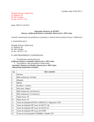 Cybinka, dnia 18.02.2013 r. Ośrodek Pomocy Społecznej ul. Słubicka 30 69-108 Cybinka tel./fax: 68 391 1116 Znak: OPS.271.02.2013 Zapytanie ofertowe nr 02/2013 dotyczy cyklicznych dostaw artykułów biurowych w 2013 roku (wartość zamówienia nie przekracza wyrażonej w złotych równowartości kwoty 14 000 euro) I. ZAMAWIAJĄCY: Ośrodek Pomocy Społecznej ul. Słubicka 30 69-108 Cybinka tel./fax: 68 391 1116 II. OPIS PRZEDMIOTU ZAMÓWIENIA 1. Przedmiotem zamówienia jest: cykliczne dostawy artykułów biurowych w 2013 roku 2. Szczegółowy opis przedmiotu zamówienia: - sprzedaż i dostawa artykułów biurowych w 2013 roku; - najczęściej zamawiane artykuły: Lp. Opis artykułu 1 Ołówek 2 Blok techniczny A4 biały 3 długopis 4 Bibuła 5 Korektor w piórze 6 Klej typu „Magic” 7 Blok techniczny A4 kolorowy 8 Blok techniczny A3 kolorowy 9 Papier ksero A4 10 Papier ksero A3 11 Toner do drukarki KONICA MINOLTA Magicolor 2550 12 Toner do drukarki HP Laser Jet M2727 nfs 13 Toner do drukarki HP Laser Jet M1522 nf 14 Toner do drukarki HP Laser Jet P1005 15 Toner do kserokopiarki TOSHIBA e-Studio 230 Lp. Opis artykułu 16 Zszywki 17 Spinacze biurowe 18 Teczki tekturowe z oczkami do wpinania 19 Teczki tekturowe wiązane 20 Segregator A4 (70 mm) 21 Segregator A4 (35 mm) 22 Druki „Polecenie wyjazdu służbowego” 23 Koperta mała (biała) 24 Koperta średnia (biała) 25 Koperta duża (biała) 26 Skoroszyt PCV z oczkami 27 „Koszulki” na dokumenty A4 Zamówienia będą dokonywane według potrzeb Ośrodka Pomocy Społecznej w Cybince. Sposób zapłaty: przelew – 14 dni od dnia otrzymania faktury. 3. Zamawiający nie dopuszcza możliwości składania ofert częściowych. 4. Zamawiający nie dopuszcza możliwości powierzenia części lub całości zamówienia podwykonawcom. III. TERMIN WYKONANIA ZAMÓWIENIA Termin wykonania przedmiotu zamówienia: zamówienia będą dokonywane cyklicznie według potrzeb Ośrodka Pomocy Społecznej w Cybince. IV. OPIS SPOSOBU PRZYGOTOWANIA OFERTY Oferent powinien złożyć ofertę na formularzu załączonym do niniejszego zapytania. Oferta powinna: 1) być opatrzona pieczątką firmową, 2) posiadać datę sporządzenia, 3) zawierać adres lub siedzibę oferenta, numer telefonu, numer NIP, 4) być podpisana czytelnie przez wykonawcę. V. MIEJSCE ORAZ TERMIN SKŁADANIA OFERT 1) Oferta powinna być przesłana za pośrednictwem: poczty elektronicznej na adres [email protected] lub faksem na numer 68 391 1116 lub poczty lub kuriera lub też dostarczona osobiście na adres Ośrodka Pomocy Społecznej, ul. Słubicka 30, 69-108 Cybinka do dnia 25 lutego 2013 r., 2) Ocena ofert zostanie dokonana w dniu 26 lutego 2013 r., a wyniki i wybór najkorzystniejszej oferty zostaną ogłoszone w siedzibie Ośrodka Pomocy Społecznej w Cybince o o godz. 14:30, 3) Oferty złożone po terminie nie będą rozpatrywane, 4) Oferent może przed upływem terminu składania ofert zmienić lub wycofać swoją ofertę, 5) W toku badania i oceny ofert Zamawiający może żądać od oferentów wyjaśnień dotyczących treści złożonych ofert. VI. OCENA OFERT Zamawiający dokona oceny ważnych ofert na podstawie następujących kryteriów: 1) cena – 90% 2) termin dostawy liczony od dnia złożenia zamówienia – 10% VII. INFORMACJE DOTYCZĄCE WYBORU NAJKORZYSTNIEJSZEJ OFERTY O wyborze najkorzystniejszej oferty Zamawiający zawiadomi oferentów za pośrednictwem faksu bądź poczty elektronicznej, wskazując jednocześnie datę i miejsce podpisania umowy. VIII. DODATKWE INFORMACJE Dodatkowych informacji udziela się pod numerem telefonu 68 391 1116 IX. ZAŁĄCZNIKI 1) formularz „Oferta na sprzedaż i dostawę artykułów biurowych w 2013 roku dla Ośrodka Pomocy Społecznej w Cybince” Renata Kubiak Kierownik Ośrodka Pomocy Społecznej Załącznik 1 Oferta na sprzedaż i dostawę artykułów biurowych w 2013 roku dla Ośrodka Pomocy Społecznej w Cybince Lp. Opis artykułu jednostka miary (waga, pojemność, itp.) 1 Ołówek sztuka 2 Blok techniczny A4 biały sztuka 3 długopis sztuka 4 Bibuła sztuka 5 Korektor w piórze sztuka 6 Klej typu „Magic” sztuka 7 Blok techniczny A4 kolorowy sztuka 8 Blok techniczny A3 kolorowy sztuka 9 Papier ksero A4 ryza 10 Papier ksero A3 ryza 11 Toner do drukarki KONICA sztuka MINOLTA Magicolor 2550 12 Toner do drukarki HP Laser Jet sztuka M2727 nfs 13 Toner do drukarki HP Laser Jet sztuka M1522 nf 14 Toner do drukarki HP Laser Jet sztuka P1005 15 Toner do kserokopiarki TOSHIBA sztuka e-Studio 230 16 Zszywki opakowanie 17 Spinacze biurowe opakowanie 18 Teczki tekturowe z oczkami do sztuka wpinania 19 Teczki tekturowe wiązane sztuka 20 Segregator A4 (70 mm) sztuka 21 Segregator A4 (35 mm) sztuka 22 Druki „Polecenie służbowego” 23 Koperta mała (biała) opakowanie (50 sztuk) 24 Koperta średnia (biała) opakowanie wyjazdu bloczek Proponowana cena netto Lp. Opis artykułu jednostka miary (waga, pojemność, itp.) Proponowana cena netto (50 sztuk) 25 Koperta duża (biała) opakowanie (50 sztuk) 26 Skoroszyt PCV z oczkami sztuka 27 „Koszulki” na dokumenty A4 opakowanie 1) pieczątka firmowa Oferenta 2) data sporządzenia oferty …............................................. 3) adres lub siedzibę Oferenta, numer telefonu, numer NIP …................................................................................................................................................... ....................................................................................................................................................... ....................................................................................................................................................... 4) czytelny podpis Oferenta …................................................................................................