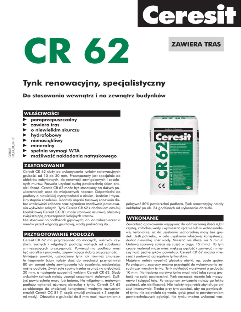 CR 62 ZAWIERA TRAS Tynk renowacyjny, specjalistyczny CERESIT CR_62_KT_04.13 Do stosowania wewnątrz i na zewnątrz budynków WŁAŚCIWOŚCI paroprzepuszczalny zawiera tras o niewielkim skurczu hydrofobowy nienasiąkliwy mineralny spełnia wymogi WTA możliwość nakładania natryskowego ZASTOSOWANIE Ceresit CR 62 służy do wykonywania tynków renowacyjnych grubości od 10 do 20 mm. Przeznaczony jest specjalnie do obiektów zabytkowych, do renowacji zawilgoconych i zasolonych murów. Pozwala uzyskać suchą powierzchnię ścian piwnic i fasad. Ceresit CR 62 może być stosowany na dużych powierzchniach oraz do miejscowych napraw. Odpowiedni do podłoży o niewielkiej wytrzymałości o niskim, średnim i wysokim stopniu zasoleniu. Dodatek mączki trasowej zapewnia dobre właściwości robocze oraz ogranicza możliwość powstawania wykwitów solnych. Tynk Ceresit CR 62 z dodatkiem emulsji kontaktowej Ceresit CC 81 może stanowić ażurową obrzutkę zwiększającą przyczepność kolejnych warstw. Nie stosować na podłożach gipsowych, ani do zabezpieczenia murów przed wilgocią gruntową, wodą podskórną itp. PRZYGOTOWANIE PODŁOŻA Ceresit CR 62 ma przyczepność do mocnych, nośnych, czystych, suchych i wilgotnych podłoży, wolnych od substancji zmniejszających przyczepność. Powierzchnia podłoża musi być szorstka i porowata, zapewniająca dobrą przyczepność. Istniejące powłoki, uszkodzony tynk jak również zmurszałe fragmenty ścian należy skuć do wysokości przynajmniej 80 cm ponad strefą zawilgocenia lub zasolenia, odsłaniając nośne podłoże. Zwietrzałe spoiny trzeba usunąć na głębokość 20 mm, a następnie uzupełnić tynkiem Ceresit CR 62. Ślady wykwitów solnych należy usunąć szczotkami stalowymi. Zwilżyć powierzchnię muru lub betonu. Na wilgotnym, matowym podłożu wykonać ażurową obrzutkę z tynku Ceresit CR 62 zarobionego do właściwej konsystencji wodnym roztworem emulsji Ceresit CC 81 (1 część emulsji zmieszać z 3 częściami wody). Obrzutka o grubości do 5 mm musi równomiernie pokrywać 50% powierzchni podłoża. Tynk renowacyjny należy nakładać po ok. 24 godzinach od wykonania obrzutki. WYKONANIE Zawartość opakowania wsypywać do odmierzonej ilości 6,0 l czystej, chłodnej wody i wymieszać ręcznie lub w wolnospadowej betoniarce, aż do uzyskania jednorodnej masy bez grudek. Jeśli potrzeba, w celu uzyskania właściwej konsystencji, dodać niewielką ilość wody. Mieszać nie dłużej niż 5 minut. Gotową zaprawę zaleca się zużyć w ciągu 15 minut. Po tym czasie materiał może mieć większą gęstość i zawierać mniejszą ilość pęcherzyków powietrza. Ceresit CR 62 można mieszać i podawać agregatem tynkarskim. Najpierw należy wypełnić głębokie ubytki, np. puste spoiny. Po związaniu zaprawy można przystąpić do wykonywania zasadniczej warstwy tynku. Tynk nakładać warstwami o grubości 10 mm. Naniesiona warstwa tynku musi mieć taką samą grubość na całej powierzchni. Tynk narzucać ręcznie lub maszynowo i ściągać łatą. Po wstępnym związaniu należy go lekko zacierać, ale nie filcować. Nie należy tego robić zbyt długo ani zbyt intensywnie. Trzeba przy tym uważać, aby na powierzchni tynku nie pojawiała się woda, gdyż grozi to powstawaniem powierzchniowych pęknięć. Na tynku można wykonać war- UWAGA Prace należy wykonywać w suchych warunkach, w temperaturze powietrza i podłoża od +5°C do +25°C. Wszelkie dane odnoszą się do temperatury +23°C i wilgotności względnej powietrza 50%. W innych warunkach należy uwzględnić szybsze lub wolniejsze twardnienie materiału. Nie mieszać z innymi materiałami. Nie pokrywać materiałami zawierającymi gips. Ceresit CR 62 zawiera cement i zmieszany z wodą ma odczyn alkaliczny. W związku z tym należy chronić naskórek i oczy. Zabrudzenia dokładnie myć wodą. W przypadku kontaktu z oczami płukać je obficie wodą i zasięgnąć porady lekarza. Zawartość chromu VI – poniżej 2 ppm w okresie ważności wyrobu. ZALECENIA Niniejsza karta techniczna określa zakres stosowania materiału i sposób prowadzenia robót, ale nie może zastąpić zawodowego przygotowania wykonawcy. Oprócz podanych informacji prace należy wykonywać zgodnie ze sztuką budowlaną i zasadami BHP. Producent gwarantuje jakość wyrobu, natomiast nie ma wpływu na warunki i sposób jego użycia. W przypadku wątpliwości należy wykonać własne próby stosowania. Wraz z ukazaniem się tej karty technicznej tracą ważność karty wcześniejsze. SKŁADOWANIE Do 6 miesięcy od daty produkcji, przy składowaniu na paletach, w suchych, chłodnych warunkach i w oryginalnych nieuszkodzonych opakowaniach. OPAKOWANIA Worki 20 kg. DANE TECHNICZNE Baza: mieszanka mineralnych spoiw, wypełniaczy mineralnych i modyfikatorów Kolor: szaro-beżowy Proporcje mieszania: ok. 6,0 l wody na 20 kg Temperatura stosowania: od +5°C do +25°C Czas zużycia: ok. 60 min Wytrzymałość na ściskanie (wg PN-EN 998-1): CS II Gęstość brutto w stanie suchym (wg PN-EN 998-1): 890 kg/m3 Reakcja na ogień: Klasa A1 Absorpcja wody (wg PN-EN 998-1): £ 0,3 kg/m2 po 24 godzinach Współczynnik przepuszczalności pary wodnej μ (wg PN-EN 998-1): £ 15 Przyczepność (wg PN-EN 998-1): ³ 0,1 MPa – FP:A Współczynnik przewodzenia ciepła l10,dry (wg PN-EN 998-1): 0,18 W/mK (wartość tabelaryczna) Trwałość (odporność na zamrażanie-odmrażanie) wg PN-85/B-04500: - ubytek masy: -0,4% - zmiana wytrzymałości na zginanie: -37% - zmiana wytrzymałości na ściskanie: -10% Penetracja wody po badaniu absorpcji wody spowodowanej podciągiem kapilarnym wody (wg PN-EN 998-1): £ 5 mm Zawartość powietrza w świeżej zaprawie (wg PN-EN 998-1): 25% Zawartość porów powietrza w związanej zaprawie: Orientacyjne zużycie: powyżej 40% ok. 8,0 kg/m2 na każdy cm grubości tynku (z 1 kg CR 62 uzyskuje się ok. 1,25 dm3 świeżej zaprawy) Parametry do nakładania natryskowego: - po