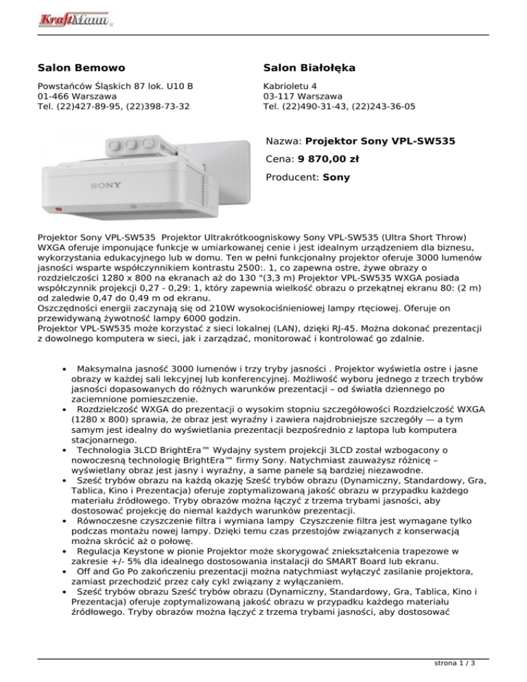 Salon Bemowo Salon Białołęka Powstańców Śląskich 87 lok. U10 B 01-466 Warszawa Tel. (22)427-89-95, (22)398-73-32 Kabrioletu 4 03-117 Warszawa Tel. (22)490-31-43, (22)243-36-05 Nazwa: Projektor Sony VPL-SW535 Cena: 9 870,00 zł Producent: Sony Projektor Sony VPL-SW535 Projektor Ultrakrótkoogniskowy Sony VPL-SW535 (Ultra Short Throw) WXGA oferuje imponujące funkcje w umiarkowanej cenie i jest idealnym urządzeniem dla biznesu, wykorzystania edukacyjnego lub w domu. Ten w pełni funkcjonalny projektor oferuje 3000 lumenów jasności wsparte współczynnikiem kontrastu 2500:. 1, co zapewna ostre, żywe obrazy o rozdzielczości 1280 x 800 na ekranach aż do 130 "(3,3 m) Projektor VPL-SW535 WXGA posiada współczynnik projekcji 0,27 - 0,29: 1, który zapewnia wielkość obrazu o przekątnej ekranu 80: (2 m) od zaledwie 0,47 do 0,49 m od ekranu. Oszczędności energii zaczynają się od 210W wysokociśnieniowej lampy rtęciowej. Oferuje on przewidywaną żywotność lampy 6000 godzin. Projektor VPL-SW535 może korzystać z sieci lokalnej (LAN), dzięki RJ-45. Można dokonać prezentacji z dowolnego komputera w sieci, jak i zarządzać, monitorować i kontrolować go zdalnie. Maksymalna jasność 3000 lumenów i trzy tryby jasności . Projektor wyświetla ostre i jasne obrazy w każdej sali lekcyjnej lub konferencyjnej. Możliwość wyboru jednego z trzech trybów jasności dopasowanych do różnych warunków prezentacji – od światła dziennego po zaciemnione pomieszczenie. Rozdzielczość WXGA do prezentacji o wysokim stopniu szczegółowości Rozdzielczość WXGA (1280 x 800) sprawia, że obraz jest wyraźny i zawiera najdrobniejsze szczegóły — a tym samym jest idealny do wyświetlania prezentacji bezpośrednio z laptopa lub komputera stacjonarnego. Technologia 3LCD BrightEra™ Wydajny system projekcji 3LCD został wzbogacony o nowoczesną technologię BrightEra™ firmy Sony. Natychmiast zauważysz różnicę – wyświetlany obraz jest jasny i wyraźny, a same panele są bardziej niezawodne. Sześć trybów obrazu na każdą okazję Sześć trybów obrazu (Dynamiczny, Standardowy, Gra, Tablica, Kino i Prezentacja) oferuje zoptymalizowaną jakość obrazu w przypadku każdego materiału źródłowego. Tryby obrazów można łączyć z trzema trybami jasności, aby dostosować projekcję do niemal każdych warunków prezentacji. Równoczesne czyszczenie filtra i wymiana lampy Czyszczenie filtra jest wymagane tylko podczas montażu nowej lampy. Dzięki temu czas przestojów związanych z konserwacją można skrócić aż o połowę. Regulacja Keystone w pionie Projektor może skorygować zniekształcenia trapezowe w zakresie +/- 5% dla idealnego dostosowania instalacji do SMART Board lub ekranu. Off and Go Po zakończeniu prezentacji można natychmiast wyłączyć zasilanie projektora, zamiast przechodzić przez cały cykl związany z wyłączaniem. Sześć trybów obrazu Sześć trybów obrazu (Dynamiczny, Standardowy, Gra, Tablica, Kino i Prezentacja) oferuje zoptymalizowaną jakość obrazu w przypadku każdego materiału źródłowego. Tryby obrazów można łączyć z trzema trybami jasności, aby dostosować strona 1 / 3 projekcję do niemal każdych warunków prezentacj Tryb przyciemniania lampy Nie musisz uzupełniać projektora dodatkowym systemem dźwiękowym. Urządzenie emituje bogaty dźwięk z wydajnego głośnika o mocy 16 W, który wypełni całe pomieszczenie. Funkcja powiększania cyfrowego, dzięki której zobaczysz więcej Wybraną część ekranu można błyskawicznie powiększyć nawet 4-krotnie, zyskując dokładny wgląd w dowolny element obrazu. Funkcja przesuwania obiektywu Projektor jest wyposażony w funkcje poziomego i pionowego przesuwania obiektywu, co wpływa na większą elastyczność instalacji. Korzystając z tej funkcji, pozycja obrazu w pionie można przesuwać w górę iw dół o 4,4%, a poziomo od -2.7% aż do + 2,7% Żywotność lampy do 6000 godzin – mniejsze wymagania konserwacyjne i mniej przestojów Mniejsza ilość czynności serwisowych przyczynia się do obniżenia kosztów utrzymania projektora w całym okresie eksploatacji i pozwala wydłużyć czas niezakłóconego prowadzenia zajęć. Cykle czyszczenia filtra są zsynchronizowane z okresami wymiany lampy, co dodatkowo zmniejsza liczbę okresowych wizyt serwisowych. Oszczędzanie energii jednym naciśnięciem przycisku Aby przejść bezpośrednio do różnych ustawień oszczędzania energii, wystarczy nacisnąć przycisk trybu ECO na projektorze lub pilocie. Automatyczne przyciemnianie Po określonym czasie lub kiedy brak sygnału wejściowego, jasność projektora stopniowo zmniejsza się automatycznie. Umożliwia to ograniczenie poboru mocy i zmniejszenie kosztów energii. Sześć trybów obrazu Projektor oferuje sześć trybów obrazu pozwalających wybrać żądaną jakość obrazu. Dostępne tryby to: Dynamiczny, Standardowy, Gra, Tablica, Kino i Prezentacja. Dobierając spośród sześciu trybów obrazu i trzech trybów jasności, można wybrać najbardziej odpowiednie ich połączenie w zależności od źródła obrazu i otoczenia, a dzięki temu uzyskać optymalny obraz. Wyłączanie obrazu w celu oszczędzania energii Wystarczy jedno naciśnięcie przycisku na pilocie projektora, aby natychmiast wyłączyć obraz, zmniejszając pobór mocy o 75%. Po kolejnym naciśnięciu przycisku projektor włącza się błyskawicznie i jest gotowy do dalszej prezentacji. Szybkie, łatwe i automatyczne wykrywanie sygnału wejściowego Projektor automatycznie przełącza się na odpowiedni sygnał wejściowy, co upraszcza konfigurację i oszczędza czas. Przełącznik dźwięku Projektor może przełączać dwa źródła dźwięku, a ich sygnał kierować przez wyjście audio o zmiennym napięciu do wzmacniacza w pomieszczeniu. Łatwa instalacja Funkcje powiększenia optycznego i zmiana osi obiektywu upraszczają instalację w każdej klasie, czyniąc ją łatwą i bezproblemową. D