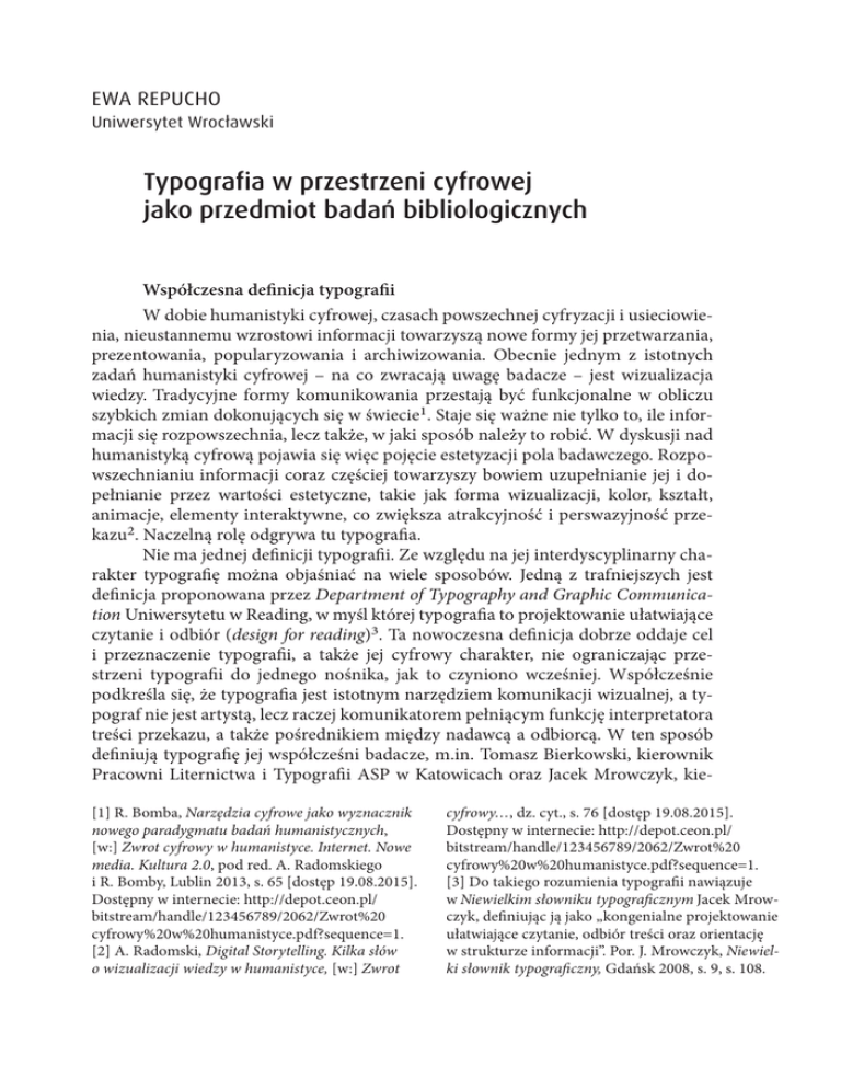 EWA REPUCHO Uniwersytet Wrocławski Typografia w przestrzeni cyfrowej jako przedmiot badań bibliologicznych Współczesna definicja typografii W dobie humanistyki cyfrowej, czasach powszechnej cyfryzacji i usieciowienia, nieustannemu wzrostowi informacji towarzyszą nowe formy jej przetwarzania, prezentowania, popularyzowania i archiwizowania. Obecnie jednym z istotnych zadań humanistyki cyfrowej – na co zwracają uwagę badacze – jest wizualizacja wiedzy. Tradycyjne formy komunikowania przestają być funkcjonalne w obliczu szybkich zmian dokonujących się w świecie1. Staje się ważne nie tylko to, ile informacji się rozpowszechnia, lecz także, w jaki sposób należy to robić. W dyskusji nad humanistyką cyfrową pojawia się więc pojęcie estetyzacji pola badawczego. Rozpowszechnianiu informacji coraz częściej towarzyszy bowiem uzupełnianie jej i dopełnianie przez wartości estetyczne, takie jak forma wizualizacji, kolor, kształt, animacje, elementy interaktywne, co zwiększa atrakcyjność i perswazyjność przekazu2. Naczelną rolę odgrywa tu typografia. Nie ma jednej definicji typografii. Ze względu na jej interdyscyplinarny charakter typografię można objaśniać na wiele sposobów. Jedną z trafniejszych jest definicja proponowana przez Department of Typography and Graphic Communication Uniwersytetu w Reading, w myśl której typografia to projektowanie ułatwiające czytanie i odbiór (design for reading)3. Ta nowoczesna definicja dobrze oddaje cel i przeznaczenie typografii, a także jej cyfrowy charakter, nie ograniczając przestrzeni typografii do jednego nośnika, jak to czyniono wcześniej. Współcześnie podkreśla się, że typografia jest istotnym narzędziem komunikacji wizualnej, a typograf nie jest artystą, lecz raczej komunikatorem pełniącym funkcję interpretatora treści przekazu, a także pośrednikiem między nadawcą a odbiorcą. W ten sposób definiują typografię jej współcześni badacze, m.in. Tomasz Bierkowski, kierownik Pracowni Liternictwa i Typografii ASP w Katowicach oraz Jacek Mrowczyk, kie[1] R. Bomba, Narzędzia cyfrowe jako wyznacznik nowego paradygmatu badań humanistycznych, [w:] Zwrot cyfrowy w humanistyce. Internet. Nowe media. Kultura 2.0, pod red. A. Radomskiego i R. Bomby, Lublin 2013, s. 65 [dostęp 19.08.2015]. Dostępny w internecie: http://depot.ceon.pl/ bitstream/handle/123456789/2062/Zwrot%20 cyfrowy%20w%20humanistyce.pdf?sequence=1. [2] A. Radomski, Digital Storytelling. Kilka słów o wizualizacji wiedzy w humanistyce, [w:] Zwrot cyfrowy…, dz. cyt., s. 76 [dostęp 19.08.2015]. Dostępny w internecie: http://depot.ceon.pl/ bitstream/handle/123456789/2062/Zwrot%20 cyfrowy%20w%20humanistyce.pdf?sequence=1. [3] Do takiego rozumienia typografii nawiązuje w Niewielkim słowniku typograficznym Jacek Mrowczyk, definiując ją jako „kongenialne projektowanie ułatwiające czytanie, odbiór treści oraz orientację w strukturze informacji”. Por. J. Mrowczyk, Niewielki słownik typograficzny, Gdańsk 2008, s. 9, s. 108. 38 EWA REPUCHO rownik Pracowni Informacji Wizualnej ASP w Katowicach4. Sama koncepcja definiowania typografii w kontekście potrzeb czytelnika nie jest oczywiście nowa. Już na początku XX w. angielski wydawca, drukarz i typograf Stanley Morison (1889–1967) pisał, że typografia ma na celu maksymalne ułatwienie zrozumienia tekstu przez czytelnika5. Podobne poglądy odnajduje się w artykułach amerykanki Beatrice Warde (1900–1969), historyka typografii i krytyka projektowania typograficznego6, ceniącej funkcjonalność i „przeźroczystość” typografii. Także Emil Ruder (1914–1970), jeden z najważniejszych twórców tzw. szwajcarskiego stylu w typografii głosił: „Nie interesują nas rygorystyczne postulaty artystyczne ani działalność twórcza; dążymy po prostu do znalezienia zadowalającego formalnie i funkcjonalnie rozwiązania codziennych problemów. Naczelną zasadą, od której nie ma odstępstw, jest to, aby tekst był czytany”7. Definiując współczesną typografię, dla której naturalnym środowiskiem jest przestrzeń cyfrowa, warto więc szukać odniesień do typografii tradycyjnej, z której typografia cyfrowa niejako się wywodzi, trzeba jednak otworzyć się na zupełnie nową rzeczywistość, nieustannie modyfikowaną przez nowoczesne technologie. Bo jak twierdzi autor i projektant książek poświęconych typografii, David Jury: „Typografia jest dziś zupełnie inna niż 20 lat temu. Technologia cyfrowa nie tylko zmieniła sposób uprawiania typografii, ale i wpłynęła na to, kto się nią obecnie zajmuje. Potrzebny jest taki typograf, dla którego wyzwaniem jest [projektowanie] samego sposobu czytania, nie zaś problem, dlaczego nie czytamy”8. Bibliologiczna definicja typografii – typografia funkcjonalna Zagadnienia typografii książkowej, wchodzące w skład szeroko pojmowanego edytorstwa, są przedmiotem szczególnego zainteresowania bibliologii, czyli nauki o książce. Refleksji bibliologów towarzyszy zróżnicowana terminologia, będąca odzwierciedleniem zmieniającego się spojrzenia na kwestie projektowania książki na przestrzeni lat. Jednym z najwcześniej stosowanych terminów jest popularne w dwudziestoleciu międzywojennym, pochodzące z Francji pojęcie architektura książki. Liczne zalety określania w ten sposób wszelkich czynności związanych z projektowaniem i kształtowaniem formy publikacji wymieniał w 1926 r. znany bibliolog, bibliotekarz i bibliograf Jan Muszkowski (1882–1953)9. Kilkadziesiąt lat później Muszkowski zaczął stosować nowy termin, również wskazujący na konstrukcyjny i architektoniczny sposób projektowania dzieła edytorskiego: architekto[4] T. Bierkowski, O typografii, Gdańsk 2008, s. 59; J. Mrowczyk, Niewielki słownik…, dz. cyt., s. 10–11 i in. [5] S. Morison w 1935 r. w książce First Principles of Typography zdefiniował typografię jako „rzemiosło prawidłowego składu drukowaneg
