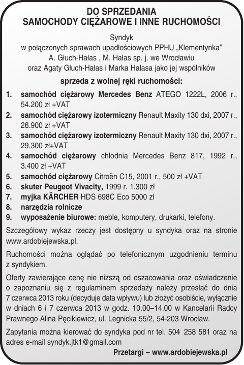 DO SPRZEDANIA SAMOCHODY CIĘŻAROWE I INNE RUCHOMOŚCI Syndyk w połączonych sprawach upadłościowych PPHU „Klementynka” A. Głuch-Hałas , M. Hałas sp. j. we Wrocławiu oraz Agaty Głuch-Hałas i Marka Hałasa jako jej wspólników sprzeda z wolnej ręki ruchomości: 1. 2. 3. 4. 5. 6. 7. 8. 9. samochód ciężarowy Mercedes Benz ATEGO 1222L, 2006 r., 54.200 zł +VAT samochód ciężarowy izotermiczny Renault Maxity 130 dxi, 2007 r., 26.900 zł +VAT samochód ciężarowy izotermiczny Renault Maxity 130 dxi, 2007 r., 29.300 zł+VAT samochód ciężarowy chłodnia Mercedes Benz 817, 1992 r., 3.400 zł +VAT samochód ciężarowy Citroën C15, 2001 r., 500 zł +VAT skuter Peugeot Vivacity, 1999 r. 1.300 zł myjka KÄRCHER HDS 698C Eco 5000 zł narzędzia rolnicze wyposażenie biurowe: meble, komputery, drukarki, telefony. Szczegółowy wykaz rzeczy jest dostępny u syndyka oraz na stronie www.ardobiejewska.pl. Ruchomości można oglądać po telefonicznym uzgodnieniu terminu z syndykiem. Oferty zawierające cenę nie niższą od oszacowania oraz oświadczenie o zapoznaniu się z regulaminem sprzedaży należy przesłać do dnia 7 czerwca 2013 roku (decyduje data wpływu) lub złożyć osobiście, wyłącznie w dniach 6 i 7 czerwca 2013 w godz. 10.00–14.00 w Kancelarii Radcy Prawnego Alina Pęcikiewicz, ul. Legnicka 55/2, 54-203 Wrocław. Zapytania można kierować do syndyka pod nr tel. 504 258 581 oraz na adres e-mail [email protected] Przetargi – www.ardobiejewska.pl