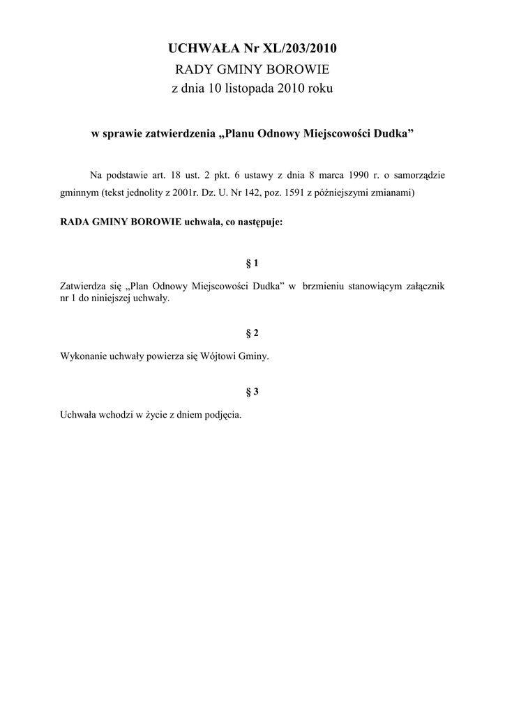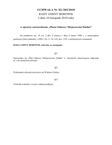 UCHWAŁA Nr XL/203/2010 RADY GMINY BOROWIE z dnia 10 listopada 2010 roku w sprawie zatwierdzenia „Planu Odnowy Miejscowości Dudka” Na podstawie art. 18 ust. 2 pkt. 6 ustawy z dnia 8 marca 1990 r. o samorządzie gminnym (tekst jednolity z 2001r. Dz. U. Nr 142, poz. 1591 z późniejszymi zmianami) RADA GMINY BOROWIE uchwala, co następuje: §1 Zatwierdza się „Plan Odnowy Miejscowości Dudka” w brzmieniu stanowiącym załącznik nr 1 do niniejszej uchwały. §2 Wykonanie uchwały powierza się Wójtowi Gminy. §3 Uchwała wchodzi w Ŝycie z dniem podjęcia. Załącznik nr 1 do Uchwały Nr XL/203/2010 Rady Gminy Borowie z dnia 10 listopada 2010 roku Plan Odnowy Miejscowości Dudka październik 2010 2 I. Charakterystyka miejscowości Miejscowość Dudka połoŜona jest w południowo-zachodniej części Gminy Borowie, w południowo-wschodniej części województwa mazowieckiego. Graniczy z miejscowościami: Wilchta (gm. Borowie), Głosków (gm. Borowie), Kamionka (gm. Borowie), Łętów (gm. Borowie) oraz Słup Pierwszy (gm. Borowie). Wieś Dudka połoŜona jest przy drodze gminnej Nr 03011 Głosków – Dudka – Wrzosów, która łączy się z drogą krajową Nr 76 oraz krzyŜuje się z drogą powiatową Nr 36541 Wilchta – Kamionka – Oziemkówka. W części południowo-zachodniej wsi, Dudka graniczy z rzeką Wilgą, która wraz z towarzyszącymi jej kompleksami łąk jest cennym obszarem przyrodniczym. Wieś posiada bardzo dobre połączenie drogowe, z uwagi na przebiegającą drogę krajową nr 76 Wilga – Łuków oraz drogę powiatową łączącą kilka sąsiednich gmin. Dzięki dobrze rozwiniętej sieci dróg Dudka ma bardzo dobre połączenie z takimi miastami jak: Garwolin, Warszawa, Siedlce czy Łuków. Dudka zajmuje obszar niespełna 2,60 km2, który zamieszkuje 215 osób na stałe zameldowanych, według stanu na dzień 31.12.2009 r. Pod względem liczby mieszkańców Dudka jest dwunastą co do wielkości miejscowością gminną, gdzie gęstość zaludnienia wynosi 82,7 osób na 1 km2. Układ przestrzenny miejscowości stanowi w większości zabudowa mieszkaniowa jednorodzinna, zwarta ciągnąca się wzdłuŜ drogi gminnej Nr 03011. Nielicznie występuje takŜe zabudowa rozproszona. Większość mieszkańców czerpie dochody z pracy zarobkowej w innych miejscowościach. Rolnictwo nie jest zatem głównym źródłem utrzymania. Według stanu na koniec października 2010 roku liczba gospodarstw rolnych wynosiła 58. W większości są to gospodarstwa małoobszarowe, nielicznie występują gospodarstwa kilkunastohektarowe. Na gruntach wsi, głównie wzdłuŜ rzeki Wilgi, odkryte zostały znaleziska archeologiczne w postaci licznych fragmentów ceramiki, które pochodzą z okresu staroŜytności i wczesnego średniowiecza. Znaleziska te potwierdzają istnienie śladów ówczesnego osadnictwa. Historia wsi Dudka jest przekazywana od niepamiętnych czasów z pokolenia na pokolenie poprzez opowieści najstarszych mieszkańców wsi. Z opowiadań tych 3 wynika, Ŝe nazwa wsi wzięła się od nazwiska Dudek, pewnego dziedzica, który zamieszkał pomiędzy obecnie znajdującymi się wsiami Dudką a Łętowem w pobliŜu rzeki Wilgi. W XVI wieku właścicielami Dudki byli synowie Jana Zawiszyca: Jan z Dudki, Walenty i Feliks. W 1600 r. Stanisław, syn Jana z Dudki sprzedał swoją część Dudki, Parysowi. Następnie właścicielem był syn Hieronima Parysa - Adam Hieronim, dziedzic Głoskowa, który pozostawił trzech synów, z których Feliks (Szczęsny) Zygmunt zarządzał m.in. Dudką. Następnym właścicielem wsi został syn Feliksa – Józef a po śmierci Józefa, dobra Dudki przejęła jego córka Felicjanna, która w 1713 r. wyszła za Wojciecha Wessla, starostę róŜańskiego. Na długo przed II wojną światową osiedliły się w Dudce dwie siostry dziedziczki, córki pułkownika Afanasiewa. Jedna z nich wyszła za mąŜ za dziedzica Kaczkowskiego. Mieli oni kilka stawów hodowlanych, konie i kilku parobków. Wieś Dudka naleŜy do parafii Garwolin. Na podstawie zebranych informacji wynika, Ŝe juŜ w 1576 roku Dudka wchodziła w skład tej parafii. Natomiast administracyjnie do II wojny światowej Dudka naleŜała do gminy Górzno a w latach 1954–1972 do Gromady Głosków. Następnie w wyniku reformy administracyjnej kraju w roku 1973 utworzona została Gmina Borowie, w skład której weszła m.in. Dudka. W latach 1975-1998 miejscowość administracyjnie naleŜała do województwa siedleckiego. Dudka w całości jest zelektryfikowana, posiada sieć wodociągową w 98 % przyłączy oraz sieć gazową w 90 % przyłączy. W niedalekiej przyszłości mieszkańcy wsi cieszyć się będą posiadaniem kanalizacji sanitarnej. Bowiem w roku 2012 zostanie oddana do uŜytku sieć kanalizacji sanitarnej wraz z przyłączami, która podłączona zostanie do oczyszczalni ścieków w Borowiu. Obecnie trwają prace związane z budową sieci grawitacyjno – tłocznej w sąsiedniej miejscowości - Kamionce. Dobry stan infrastruktury technicznej, czyste środowisko, występujące lasy a takŜe połoŜenie wzdłuŜ rzeki Wilgi, wpływają na osiedlanie się ludzi w tym takŜe z poza gminy – głównie z gmin miejskich. Cennym dziedzictwem, zasługującym na szczególną uwagę, pozostaje nieskaŜone środowisko naturalne oraz piękne połoŜenie. (źródło: Zbigniew Gnat-Wieteska „Dzieje parafii Garwolin 1418 - 1993", Zbigniew GnatWieteska „Dzieje Gminy Borowie”, Zespół Szkół w Głoskowie, Urząd Gminy Borowie) 4 II. Inwentaryzacja zasobów słuŜących odnowie miejscowości Zasoby słuŜące odnowie miejscowości A) Zasoby przyrodnicze: Aktualna kondycja zasobów - NieskaŜone środowisko naturalne, - las, - rzeka, - liczne tereny zielone, - Ŝyzna gleba. B) Dziedzictwo kulturowe: - dwa przydroŜne krzyŜe, - kamień znajdujący się przy jednym z krzyŜy z wyrytym słowem „za ojczyznę” i rokiem 1863, - dwie kapliczki przydroŜna C) Obiekty i tereny: - działki pod za