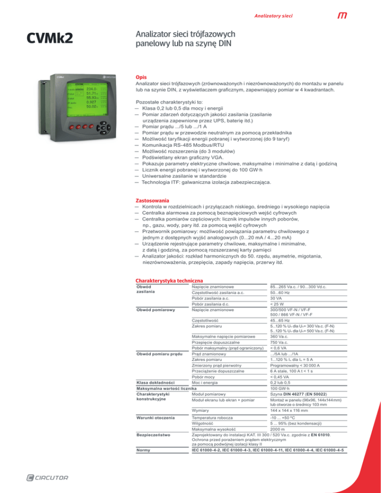 Analizatory sieci CVMk2 Analizator sieci trójfazowych panelowy lub na szynę DIN Opis Analizator sieci trójfazowych (zrównoważonych i niezrównoważonych) do montażu w panelu lub na szynie DIN, z wyświetlaczem graficznym, zapewniający pomiar w 4 kwadrantach. Pozostałe charakterystyki to: —— Klasa 0,2 lub 0,5 dla mocy i energii —— Pomiar zdarzeń dotyczących jakości zasilania (zasilanie urządzenia zapewnione przez UPS, baterię itd.) —— Pomiar prądu .../5 lub .../1 A —— Pomiar prądu w przewodzie neutralnym za pomocą przekładnika —— Możliwość taryfikacji energii pobranej i wytworzonej (do 9 taryf) —— Komunikacja RS-485 Modbus/RTU —— Możliwość rozszerzenia (do 3 modułów) —— Podświetlany ekran graficzny VGA. —— Pokazuje parametry elektryczne chwilowe, maksymalne i minimalne z datą i godziną —— Licznik energii pobranej i wytworzonej do 100 GW·h —— Uniwersalne zasilanie w standardzie —— Technologia ITF: galwaniczna izolacja zabezpieczająca. Zastosowania —— Kontrola w rozdzielnicach i przyłączach niskiego, średniego i wysokiego napięcia —— Centralka alarmowa za pomocą beznapięciowych wejść cyfrowych —— Centralka pomiarów częściowych: licznik impulsów innych poborów, np., gazu, wody, pary itd. za pomocą wejść cyfrowych —— Przetwornik pomiarowy: możliwość powiązania parametru chwilowego z jednym z dostępnych wyjść analogowych (0...20 mA / 4...20 mA) —— Urządzenie rejestrujące parametry chwilowe, maksymalne i minimalne, z datą i godziną, za pomocą rozszerzanej karty pamięci —— Analizator jakości: rozkład harmonicznych do 50. rzędu, asymetrie, migotania, niezrównoważenia, przepięcia, zapady napięcia, przerwy itd. Charakterystyka techniczna Obwód zasilania Obwód pomiarowy Obwód pomiaru prądu Klasa dokładności Napięcie znamionowe 85...265 Va.c. / 90...300 Vd.c. Częstotliwość zasilania a.c. 50...60 Hz Pobór zasilania a.c. 30 VA Pobór zasilania d.c. < 25 W Napięcie znamionowe 300/500 VF-N / VF-F 500 / 866 VF-N / VF-F Częstotliwość 45...65 Hz Zakres pomiaru 5...120 % Un dla Un= 300 Va.c. (F-N) 5...120 % Un dla Un= 500 Va.c. (F-N) Maksymalne napięcie pomiarowe 360 Va.c. Przepięcie dopuszczalne 750 Va.c. Pobór maksymalny (prąd ograniczony) < 0,6 VA Prąd znamionowy .../5A lub .../1A Zakres pomiaru 1...120 % I n dla I n = 5 A Zmierzony prąd pierwotny Programowalny < 30 000 A Przeciążenie dopuszczalne 6 A stale, 100 A t < 1 s Pobór mocy < 0,45 VA Moc i energia 0,2 lub 0,5 Maksymalna wartość licznika 100 GW·h Charakterystyki konstrukcyjne Moduł pomiarowy Szyna DIN 46277 (EN 50022) Moduł ekranu lub ekran + pomiar Montaż w panelu (96x96, 144x144 mm) lub otworze o średnicy 103 mm Wymiary 144 x 144 x 116 mm Temperatura robocza -10 ... +50 ºC Wilgotność 5 ... 95% (bez kondensacji) Maksymalna wysokość 2000 m Warunki otoczenia Bezpieczeństwo Zaprojektowany do instalacji KAT. III 300 / 520 Va.c. zgodnie z EN 61010. Ochrona przed porażeniem prądem elektrycznym za pomocą podwójnej izolacji klasy II Normy IEC 61000-4-2, IEC 61000-4-3, IEC 61000-4-11, IEC 61000-4-4, IEC 61000-4-5 1 Analizatory sieci CVMk2 Analizator sieci trójfazowych panelowy lub na szynę DIN Rodzaje Kompaktowe urządzenia (moduł pomiarowy + wyświetlacz) Typ Kod Kwadranty Klasa Komunikacja CVMk2-ITF-405 M54400 4 0,5 RS-485 Modbus/RTU CVMk2-ITF-402 M54402 4 0,2 RS-485 Modbus/RTU Urządzenia pomiarowe (moduł pomiarowy) Typ Kod Kwadranty Klasa Komunikacja M-CVMk2-ITF-405 M54410 4 0,5 RS-485 Modbus/RTU M-CVMk2-ITF-402 M54412 4 0,2 RS-485 Modbus/RTU Wymiary Fig. 1 Fig. 2 Fig. 3 Rysunki 1, 2 i 3: Pokazano jak montuje się część przednią (wyświetlacz) panelu w otwór odpowiednio, o wymiarach 92 x 92 mm, średnicy 110 mm i wymiarach 138 x 138 mm. Połączenia Połączenie 4 przekładników prądowych (5 przewodów) 2 Połączenie 4 przekładników prądowych i 2 przekładników napięciowych Połączenie 3 przekładników prądowych (3 przewody)