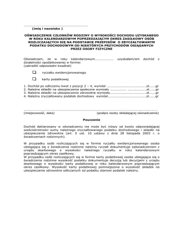 .......................................................... (imię i nazwisko ) OŚWIADCZENIE CZŁONKÓW RODZINY O WYSOKOŚCI DOCHODU UZYSKANEGO W ROKU KALENDARZOWYM POPRZEDZAJĄCYM OKRES ZASIŁKOWY OSÓB ROZLICZAJĄCYCH SIĘ NA PODSTAWIE PRZEPISÓW O ZRYCZAŁTOWANYM PODATKU DOCHODOWYM OD NIEKTÓRYCH PRZYCHODÓW OSIĄGANYCH PRZEZ OSOBY FIZYCZNE Oświadczam, Ŝe w roku kalendarzowym................. działalności opodatkowanej w formie: (zakreślić odpowiedni kwadrat) uzyskałam/em dochód z ryczałtu ewidencjonowanego karty podatkowej 1. 2. 3. 4. Dochód po odliczeniu kwot z pozycji 2 – 4, wyniósł ....................................zł......gr NaleŜne składki na ubezpieczenia społeczne wyniosły ............... .................zł......gr NaleŜne składki na ubezpieczenie zdrowotne wyniosły.................................zł......gr NaleŜny zryczałtowany podatek dochodowy wyniósł...................................zł......gr ......................................................................................................................... (miejscowość, data) (podpis osoby składającej oświadczenie) Pouczenie Dochód deklarowany w oświadczeniu nie moŜe być niŜszy od kwoty odpowiadającej sześciokrotności sumy naleŜnego zryczałtowanego podatku dochodowego i składki na ubezpieczenie zdrowotne (art. 5 ust. 10 ustawy z dnia 28 listopada 2003 r. o świadczeniach rodzinnych). W przypadku osób rozliczających się w formie ryczałtu ewidencjonowanego osoba ubiegająca się o świadczenia rodzinne naleŜny ryczałt dokumentuje zaświadczeniem z urzędu skarbowego o wysokości naleŜnego ryczałtu w roku kalendarzowym poprzedzającym okres zasiłkowy. W przypadku osób rozliczających się w formie karty podatkowej osoba ubiegająca się o świadczenia rodzinne wysokość podatku dokumentuje decyzją lub decyzjami z urzędu skarbowego o wysokości karty podatkowej w roku kalendarzowym poprzedzającym okres zasiłkowy. Wysokość karty podatkowej pomniejszona o wysokość składek na ubezpieczenie zdrowotne odliczanych od podatku stanowi podatek naleŜny.