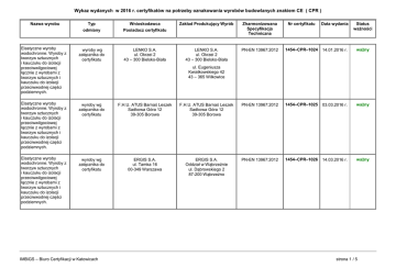 Wykaz wydanych w 2016 r. certyfikatów na potrzeby oznakowania wyrobów budowlanych znakiem CE ( CPR ) Nazwa wyrobu Typ odmiany Wnioskodawca Posiadacz certyfikatu Zakład Produkujący Wyrób Zharmonizowana Specyfikacja Techniczna Nr certyfikatu Data wydania Status ważności Elastyczne wyroby wodochronne. Wyroby z tworzyw sztucznych i kauczuku do izolacji przeciwwilgociowej łącznie z wyrobami z tworzyw sztucznych i kauczuku do izolacji przeciwwodnej części podziemnych. wyroby wg załącznika do certyfikatu LENKO S.A. ul. Okrzei 2 43 – 300 Bielsko-Biała LENKO S.A. ul. Okrzei 2 43 – 300 Bielsko-Biała PN-EN 13967:2012 1454–CPR–1024 14.01.2016 r. ważny Elastyczne wyroby wodochronne. Wyroby z tworzyw sztucznych i kauczuku do izolacji przeciwwilgociowej łącznie z wyrobami z tworzyw sztucznych i kauczuku do izolacji przeciwwodnej części podziemnych. wyroby wg załącznika do certyfikatu F.H.U. ATUS Barnaś Leszek Sadkowa Góra 12 39-305 Borowa F.H.U. ATUS Barnaś Leszek Sadkowa Góra 12 39-305 Borowa PN-EN 13967:2012 1454–CPR–1025 03.03.2016 r. ważny Elastyczne wyroby wodochronne. Wyroby z tworzyw sztucznych i kauczuku do izolacji przeciwwilgociowej łącznie z wyrobami z tworzyw sztucznych i kauczuku do izolacji przeciwwodnej części podziemnych. wyroby wg załącznika do certyfikatu ERGIS S.A. ul. Tamka 16 00-349 Warszawa ERGIS S.A. Oddział w Wąbrzeźnie ul. Dąbrowskiego 2 87-200 Wąbrzeźno PN-EN 13967:2012 1454–CPR–1026 14.03.2016 r. ważny ul. Eugeniusza Kwiatkowskiego 42 43 – 365 Wilkowice IMBiGS – Biuro Certyfikacji w Katowicach strona 1 / 5 Wykaz wydanych w 2016 r. certyfikatów na potrzeby oznakowania wyrobów budowlanych znakiem CE ( CPR ) Nazwa wyrobu Typ odmiany Wnioskodawca Posiadacz certyfikatu Zakład Produkujący Wyrób Zharmonizowana Specyfikacja Techniczna Nr certyfikatu Data wydania Status ważności Wyroby do izolacji cieplnej wyposażenia budynków i instalacji przemysłowych. Wyroby z wełny mineralnej (MW) produkowane fabrycznie. wyroby wg załącznika do certyfikatu PETRALANA S.A. ul. Mazowiecka 11 40-732 Katowice PETRALANA S.A. ul. Konstytucji 74 41-905 Bytom PN-EN 14303+A1:2013-07 1454–CPR–1027 24.05.2016 r. ważny Elastyczne wyroby wodochronne. Wyroby z tworzyw sztucznych i kauczuku do izolacji przeciwwilgociowej łącznie z wyrobami z tworzyw sztucznych i kauczuku do izolacji przeciwwodnej części podziemnych. wyroby wg załącznika do certyfikatu Onduline Polska Sp. z o.o. ul. Wojska Polskiego 3 39-300 Mielec F.H.U. ATUS Barnaś Leszek Sadkowa Góra 12 39-305 Borowa PN-EN 13967:2012 1454–CPR–1028 07.07.2016 r. ważny Wyroby do izolacji cieplnej w budownictwie. Wyroby z wełny mineralnej (MW) produkowane fabrycznie. wyroby wg załącznika do certyfikatu PETRALANA S.A. ul. Mazowiecka 11 40-732 Katowice PETRALANA S.A. ul. Konstytucji 74 41-905 Bytom PN-EN 13162+A1:2015-04 1454–CPR–1029 08.07.2016 r. ważny IMBiGS – Biuro Certyfikacji w Katowicach strona 2 / 5 Wykaz wydanych w 2016 r. certyfikatów na potrzeby oznakowania wyrobów budowlanych znakiem CE ( CPR ) Nazwa wyrobu Typ odmiany Wyroby do izolacji cieplnej w budownictwie Wyroby z wełny mineralnej (MW) produkowane fabrycznie wyroby wg załącznika do certyfikatu Wyroby do izolacji cieplnej w budownictwie Wyroby z wełny mineralnej (MW) produkowane fabrycznie Wyroby do izolacji cieplnej w budownictwie Wyroby z wełny mineralnej (MW) produkowane fabrycznie Zharmonizowana Specyfikacja Techniczna Nr certyfikatu Data wydania Status ważności Saint-Gobain Construction Saint-Gobain Construction Products Polska Sp. z o.o. Products Polska Sp. z o.o. ul. Okrężna 16, 44-100 Gliwice ul. Okrężna 16, 44-100 Gliwice linia produkcyjna: WS1 PN-EN 13162+A1:2015-04 1454–CPR–1030 08.07.2016 r. ważny wyroby wg załącznika do certyfikatu Saint-Gobain Construction Saint-Gobain Construction Products Polska Sp. z o.o. Products Polska Sp. z o.o. ul. Okrężna 16, 44-100 Gliwice ul. Okrężna 16, 44-100 Gliwice linia produkcyjna: WS2 PN-EN 13162+A1:2015-04 1454–CPR–1031 08.07.2016 r. ważny wyroby wg załącznika do certyfikatu Saint-Gobain Construction Saint-Gobain Construction Products Polska Sp. z o.o. Products Polska Sp. z o.o. ul. Okrężna 16, 44-100 Gliwice ul. Okrężna 16, 44-100 Gliwice linia produkcyjna: WS2 PN-EN 13162+A1:2015-04 1454–CPR–1032 08.07.2016 r. ważny IMBiGS – Biuro Certyfikacji w Katowicach Wnioskodawca Posiadacz certyfikatu Zakład Produkujący Wyrób strona 3 / 5 Wykaz wydanych w 2016 r. certyfikatów na potrzeby oznakowania wyrobów budowlanych znakiem CE ( CPR ) Nazwa wyrobu Typ odmiany Wyroby do izolacji cieplnej w budownictwie Wyroby z wełny mineralnej (MW) produkowane fabrycznie wyroby wg załącznika do certyfikatu Wyroby do izolacji cieplnej w budownictwie Wyroby z wełny mineralnej (MW) produkowane fabrycznie Wyroby do izolacji cieplnej w budownictwie Wyroby z wełny mineralnej (MW) produkowane fabrycznie Zharmonizowana Specyfikacja Techniczna Nr certyfikatu Data wydania Status ważności Saint-Gobain Construction Saint-Gobain Construction Products Polska Sp. z o.o. Products Polska Sp. z o.o. ul. Okrężna 16, 44-100 Gliwice ul. Okrężna 16, 44-100 Gliwice linia produkcyjna: WS1 PN-EN 13162+A1:2015-04 1454–CPR–1033 08.07.2016 r. ważny wyroby wg załącznika do certyfikatu Saint-Gobain Construction Saint-Gobain Construction Products Polska Sp. z o.o. Products Polska Sp. z o.o. ul. Okrężna 16, 44-100 Gliwice ul. Okrężna 16, 44-100 Gliwice linia produkcyjna: WS1 PN-EN 13162+A1:2015-04 1454–CPR–1034 08.07.2016 r. ważny wyroby wg załącznika do certyfikatu Saint-Gobain Construction Saint-Gobain Construction Products Polska Sp. z o.o. Products Polska Sp. z o.o. ul. Okrężna 16, 44-100 Gliwice ul. Okrężna 16, 44-100 Gliwice linia produkcyjna: WS1 PN-EN 13162+A1:2015-04 1454–CPR–1035 08.07.2016 r. ważny IMBiGS – Biuro Certyfikacji w Katowicach Wnioskodawca Posiadacz certyfikatu Zakład Produkujący Wyrób strona 4 