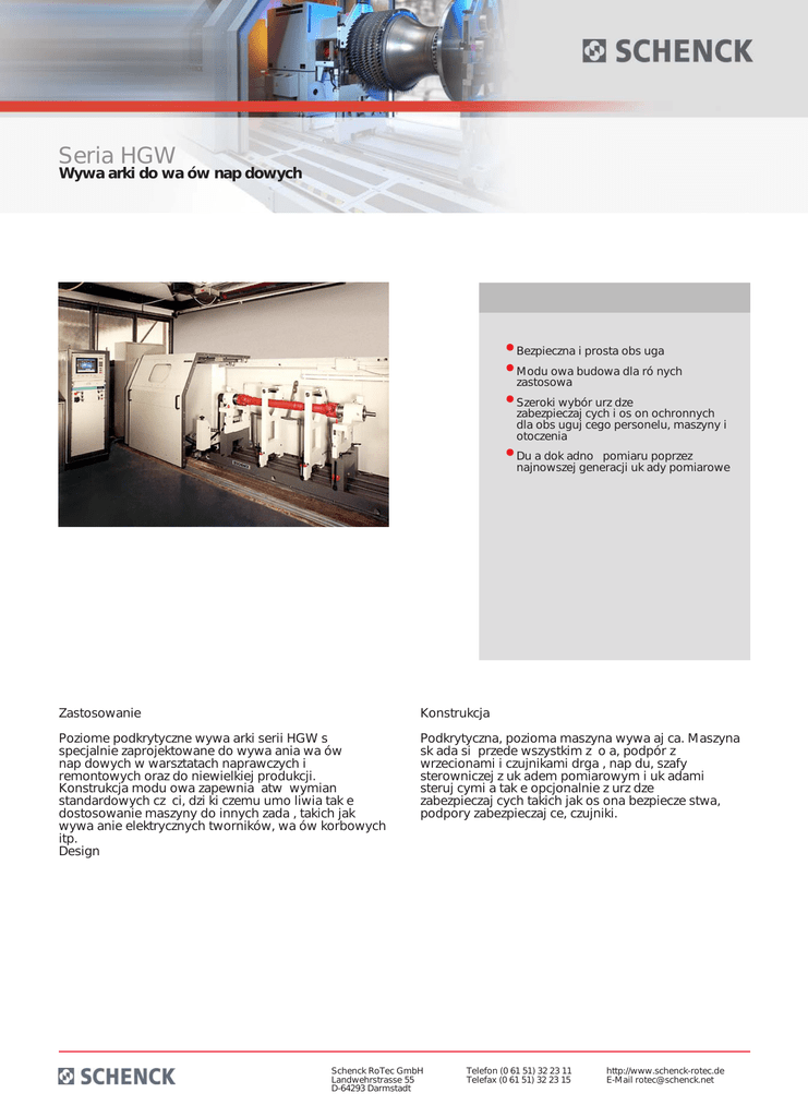 Seria HGW Wywa arki do wa ów nap dowych • Bezpieczna i prosta obs uga • Modu owa budowa dla ró nych zastosowa • Szeroki wybór urz dze zabezpieczaj cych i os on ochronnych dla obs uguj cego personelu, maszyny i otoczenia • Du a dok adno pomiaru poprzez najnowszej generacji uk ady pomiarowe Zastosowanie Konstrukcja Poziome podkrytyczne wywa arki serii HGW s specjalnie zaprojektowane do wywa ania wa ów nap dowych w warsztatach naprawczych i remontowych oraz do niewielkiej produkcji. Konstrukcja modu owa zapewnia atw wymian standardowych cz ci, dzi ki czemu umo liwia tak e dostosowanie maszyny do innych zada , takich jak wywa anie elektrycznych tworników, wa ów korbowych itp. Design Podkrytyczna, pozioma maszyna wywa aj ca. Maszyna sk ada si przede wszystkim z o a, podpór z wrzecionami i czujnikami drga , nap du, szafy sterowniczej z uk adem pomiarowym i uk adami steruj cymi a tak e opcjonalnie z urz dze zabezpieczaj cych takich jak os ona bezpiecze stwa, podpory zabezpieczaj ce, czujniki. Schenck RoTec GmbH Landwehrstrasse 55 D-64293 Darmstadt Telefon (0 61 51) 32 23 11 Telefax (0 61 51) 32 23 15 http://www.schenck-rotec.de E-Mail [email protected] Seria HGW Wywa arki do wa ów nap dowych Wymiary komponentów maszyn pozwalaj na wywa anie szerokiego zakresu wagowego wa ów i gwarantuj wysok dok adno , bezpiecze stwo operatora oraz d ugi okres u ytkowania. Specjalne wrzeciona o yskowe pozwalaj na du y zakres szybko ci obrotowej wywa ania i stawiaj opór wysokim od rodkowym si om, typowym z powodu promieniowych i osiowych luzów typowych w wa ach nap dowychZasada dynamometru dla permanentnej kalibracji gwarantuje wysok dok adno wywa ania i mo e przyj du e pocz tkowe niewywa enie. Wywa arki HGW mog by wyposa one w systemy korekcji niewywa enia za pomoc zgrzewania odwa ników lub za pomoc wiercenia. Poprzez flansze-adaptery mo na zaadoptowa do wrzecion wywa arki ca y zakres wa ów nap dowy. Modu owa budowa serii wywa arek HGW balancing tak e pozwala wywa a wirniki ze swoimi w asnymi czopami np:& 160;silniki elektryczne, wa y korbowe,& Schenck RoTec GmbH Landwehrstrasse 55 D-64293 Darmstadt Telefon (0 61 51) 32 23 11 Telefax (0 61 51) 32 23 15 http://www.schenck-rotec.de E-Mail [email protected] Seria HGW Wywa arki do wa ów nap dowych 160;bebny - na ddatkowych podporach. Schenck RoTec GmbH Landwehrstrasse 55 D-64293 Darmstadt Telefon (0 61 51) 32 23 11 Telefax (0 61 51) 32 23 15 http://www.schenck-rotec.de E-Mail [email protected] Seria HGW Wywa arki do wa ów nap dowych Technical data at a glance HGW 20 B HGW 30 B Measuring unit HGW 40 B CAB 700 Spindle bearings for drive shafts • • • Safety devies • • • Protective enclosure • • • Belt drive • • • [kg] 180 450 1000 Diameter [mm] 1600 1600 1600 Length [mm] 2200 2200 2200 Width A [mm] 5500 5500 5500 Depth B [mm] 2400 2400 2400 Height C [mm] 2300 2300 2300 Balancing speed range [min -1] 100 - 5000 100 - 5000 100 - 5000 MARU [gmm/kg] 0.5 (not better than 25 gmm) 0.5 (not better than 25 gmm) 0.5 (not better than 25 gmm) Rotor Weight, max. Machine Air pressure [kPa] 600 600 600 Drive power [kW] 4 4 7.5 Order No. R0150100.01 R0150200.01 R0150400.01 Order No. R0150101.01 R0150101.01 R0150101.01 Report printer Order No. R0150102.01 R0150102.01 R0150102.01 Software options Order No. R0150103.01 R0150103.01 R0150103.0 Center pedestal for 2-piece shafts Order No. R0150104.01 R0150204.01 R0150404.01 Roller-bearing carriages for rotors with their own journals Order No. R0150105.01 R0150205.01 R0150405.01 Drill correction Order No. R0150106.01 R0150206.01 R0150406.01 Welding correction Order No. R0150107.01 R0150207.01 R0150407.01 Spindle adapter Order No. o.r. o.r. o.r. 2) Minimum achievable residual unbalance per plane 3) Data non-binding, dependent on repective equipment supp ied o.r. On request Schenck RoTec GmbH Landwehrstrasse 55 D-64293 Darmstadt Telefon (0 61 51) 32 23 11 Telefax (0 61 51) 32 23 15 http://www.schenck-rotec.de E-Mail [email protected]
